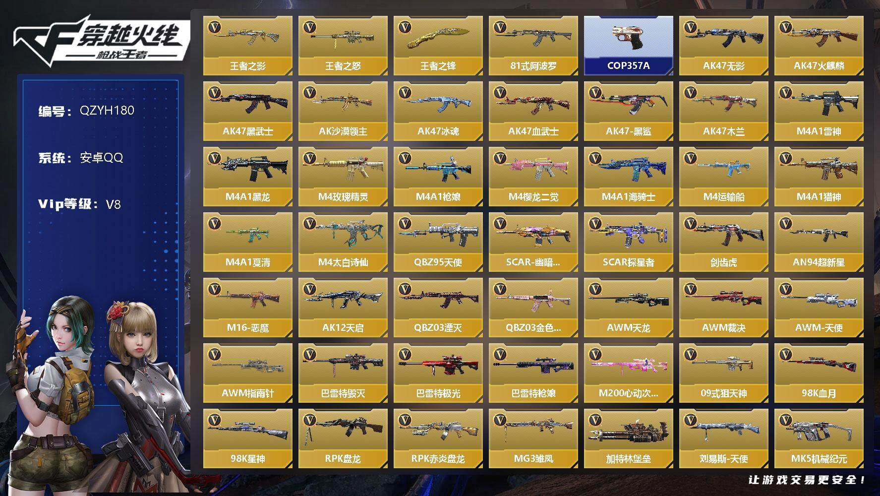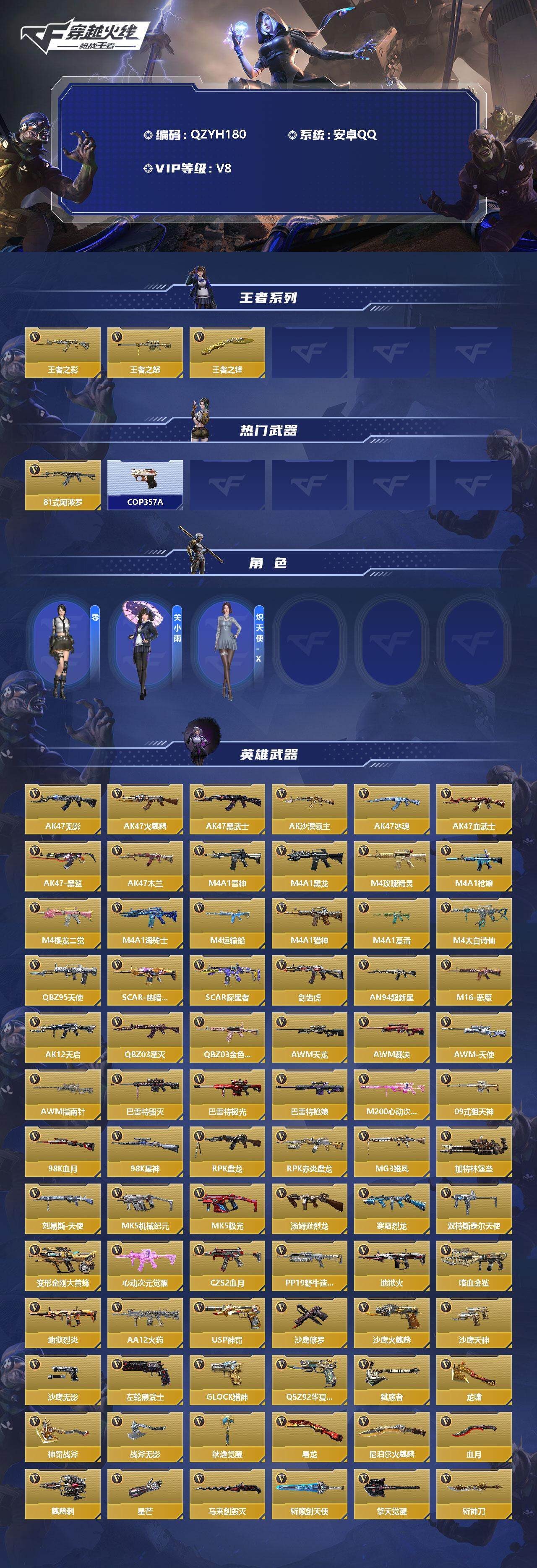 【11091826】【QZYH180】VIP8/166V/王者之影/王者之怒/王者之锋/81式-阿波罗/COP 357-A/零/关小雨/炽天使-X/无影/火麒麟/黑武士/AK47-沙漠领主/AK47-冰魂/AK47-血武士/AK47-黑鲨/AK47-木兰/雷神/M4A1-黑龙/M4A1-玫瑰精灵/M4A1-枪娘/M4A1-樱龙·二觉/M4A1-海骑士/M4A1-运输船/M4A1-猎神/M4A1-