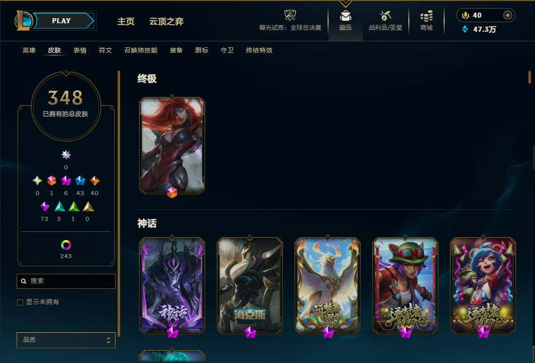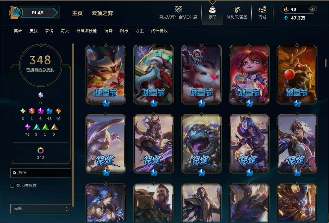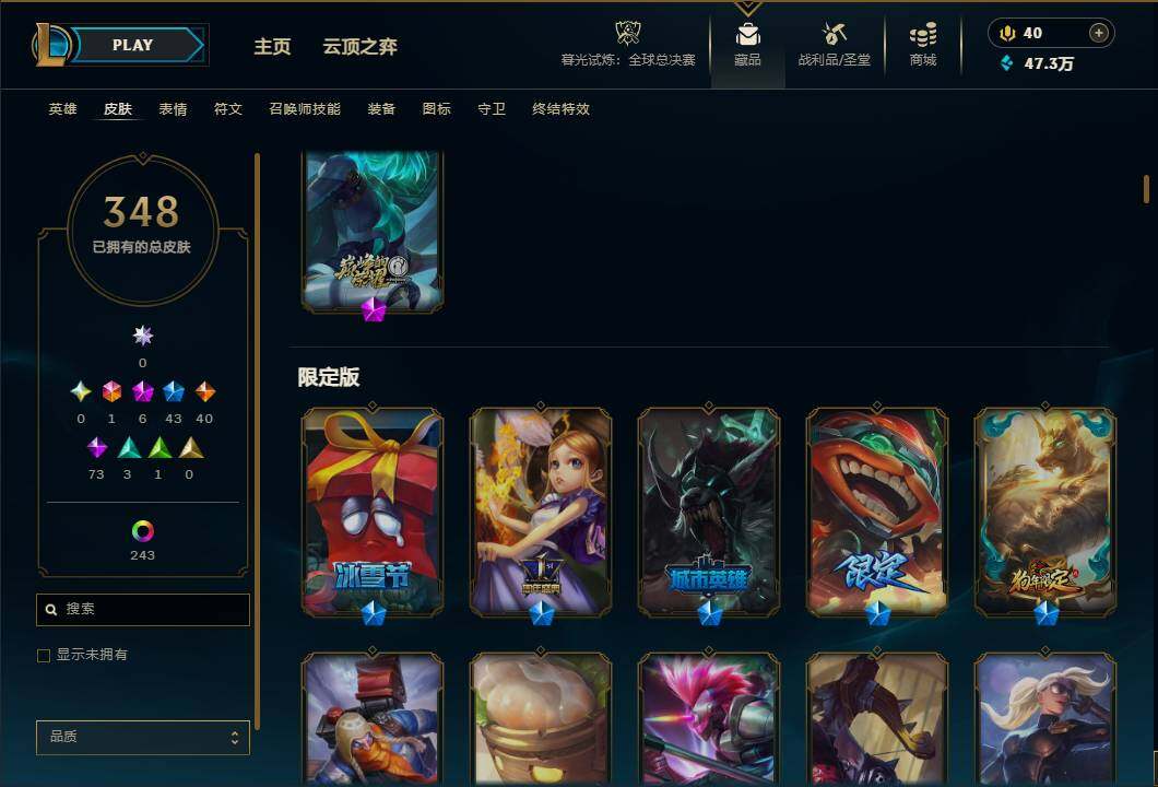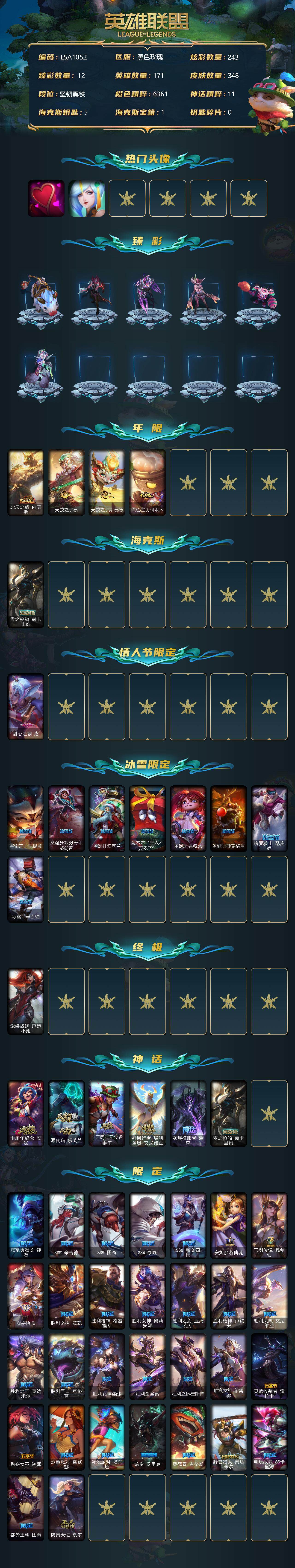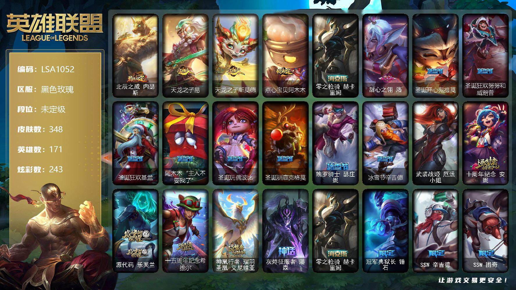 【11091997】【LSA1052】171英雄/348皮肤/1终极/6神话/43限定/12臻彩/243炫彩/40传说/73史诗/未定级账号等级:1533/爱意绵绵/春晖神女/天龙之子卡莎飞龙乘云/无畏骑士瑟庄妮赤子初心/西部魔影卢锡安贝利尔之怠/天煞劫恒星游历者/破败军团厄运小姐灵岛征伐使/灵魂莲华亚索霜见之时/可爱可爱粉红红布里茨/咖啡甜心格温酒醉樱桃/魔女阿卡丽虚荣/净雪之月莫甘娜冬虹/北