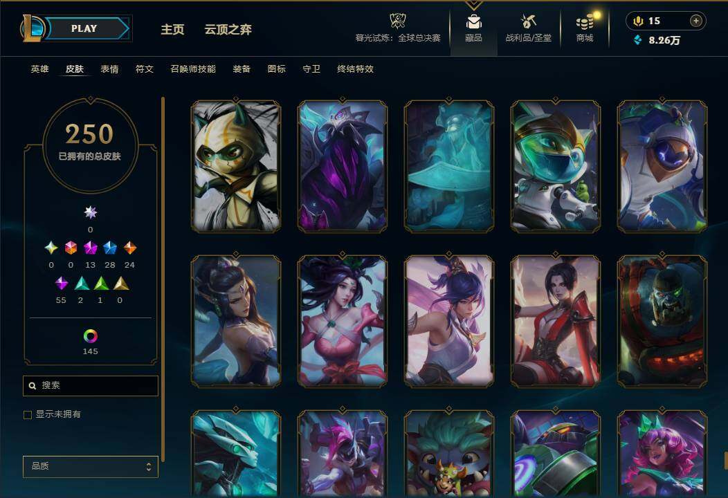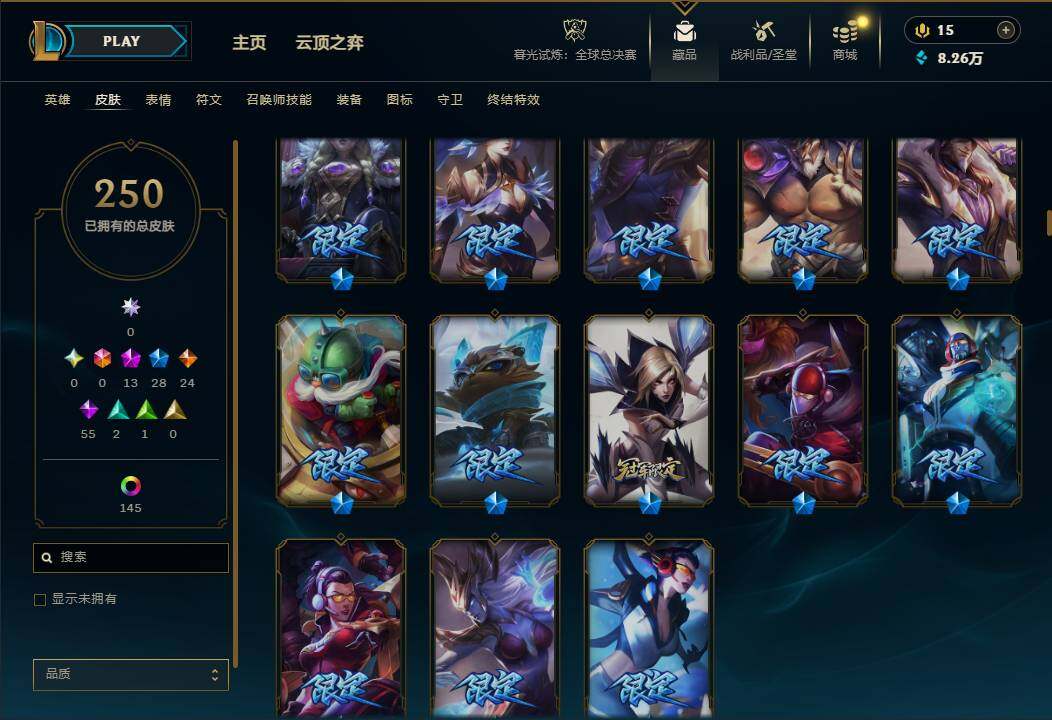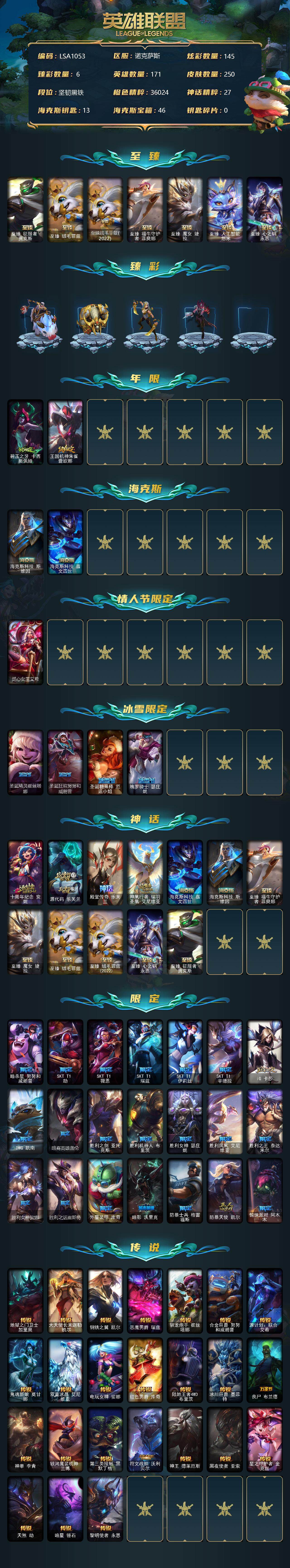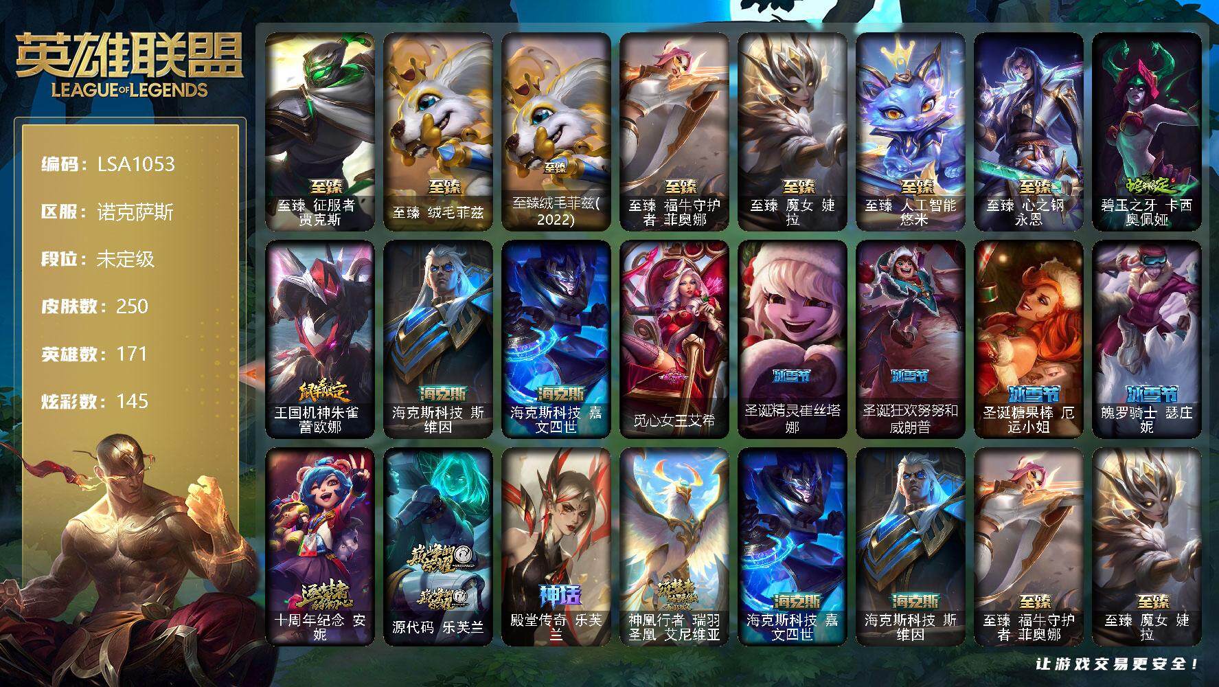 【11092020】【LSA1053】171英雄/250皮肤/13神话/28限定/6臻彩/145炫彩/24传说/55史诗/未定级账号等级:785/至臻征服者贾克斯/至臻绒毛菲兹/至臻绒毛菲兹(2022)/至臻福牛守护者菲奥娜/至臻魔女婕拉/至臻人工智能悠米/至臻心之钢永恩/无畏骑士瑟庄妮赤子初心/征服者阿利斯塔炫金/闭月之颜貂蝉炫金莲华/西部魔影卢锡安贝利尔之怠/殿堂传奇乐芙兰登神/战斗学院盖伦