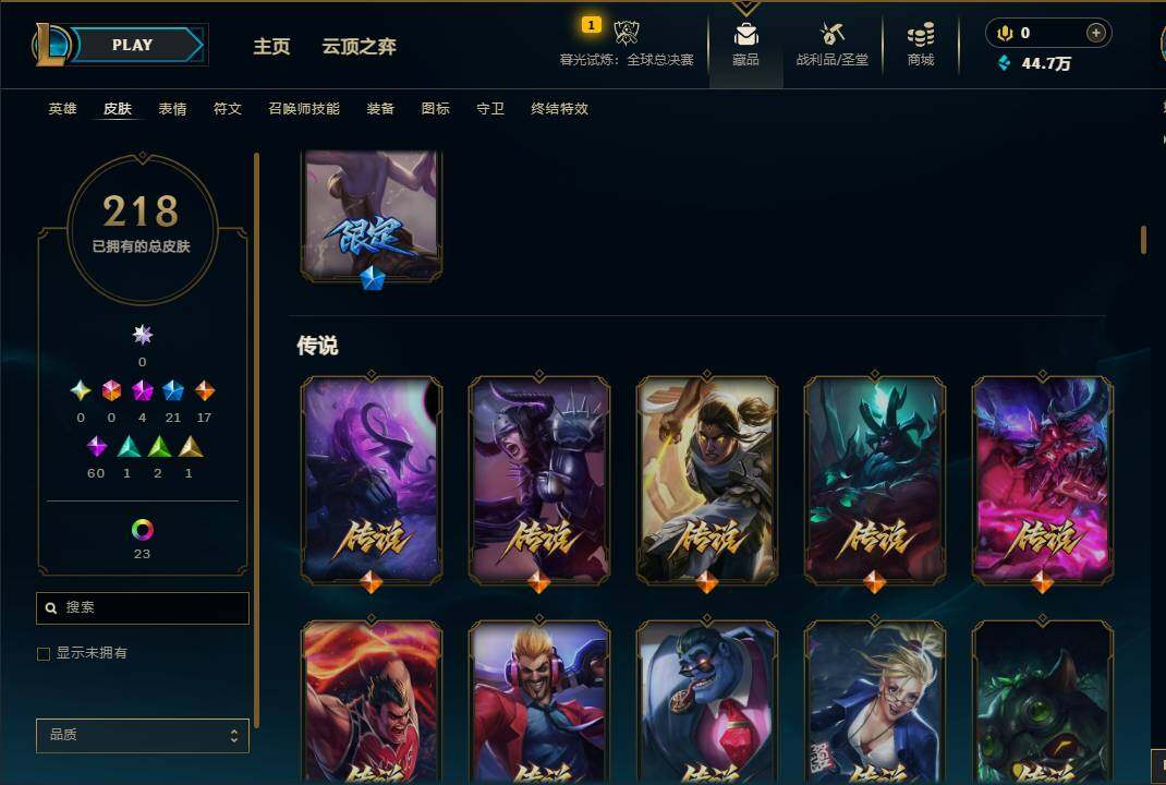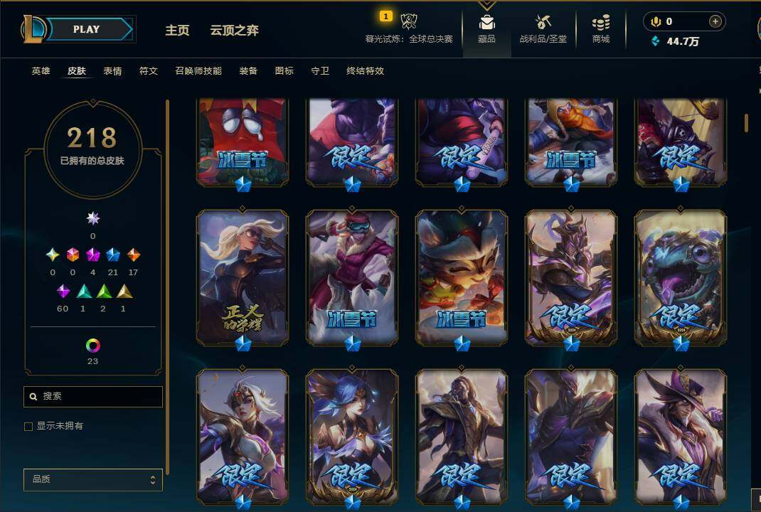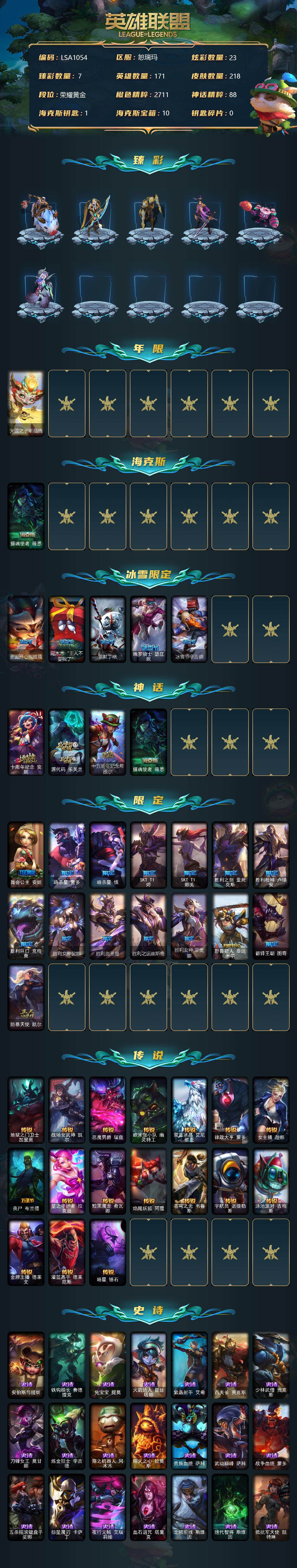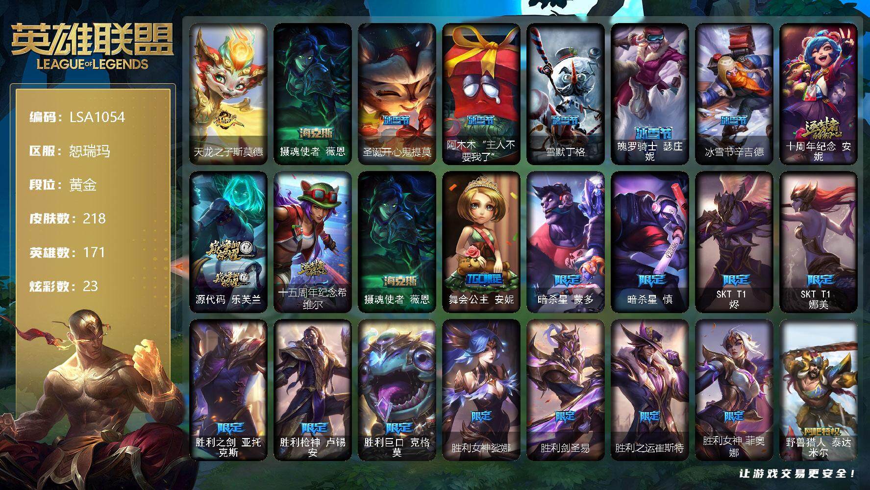 【11092025】【LSA1054】171英雄/218皮肤/4神话/21限定/7臻彩/23炫彩/17传说/60史诗/黄金账号等级:795/无畏骑士瑟庄妮赤子初心/冠军之箭艾希凯旋圣装/冠军之隐劫凯旋圣装/玉剑传说无极麒麟/可爱可爱粉红红布里茨/魔女阿卡丽虚荣/净雪之月莫甘娜冬虹/天龙之子斯莫德/摄魂使者薇恩/圣诞开心鬼提莫/阿木木:“主人不要我了”/雪默丁格/魄罗骑士瑟庄妮/冰雪节辛吉德/十周