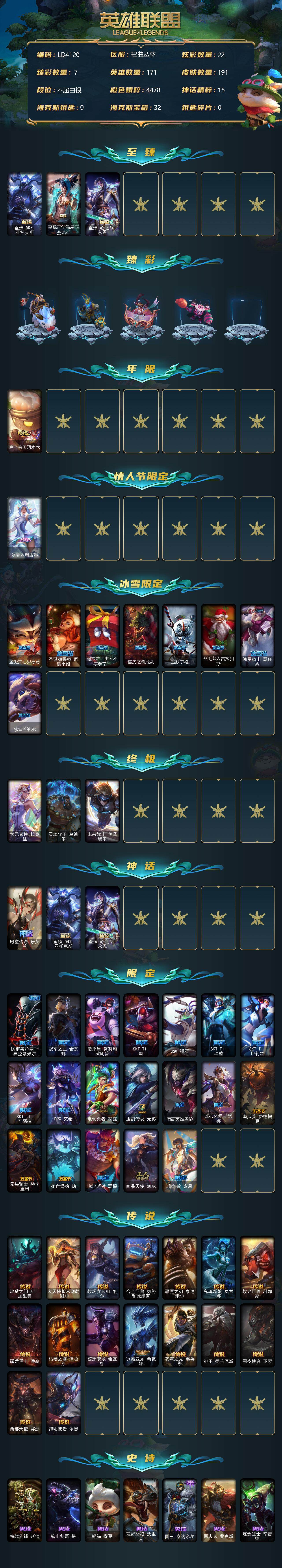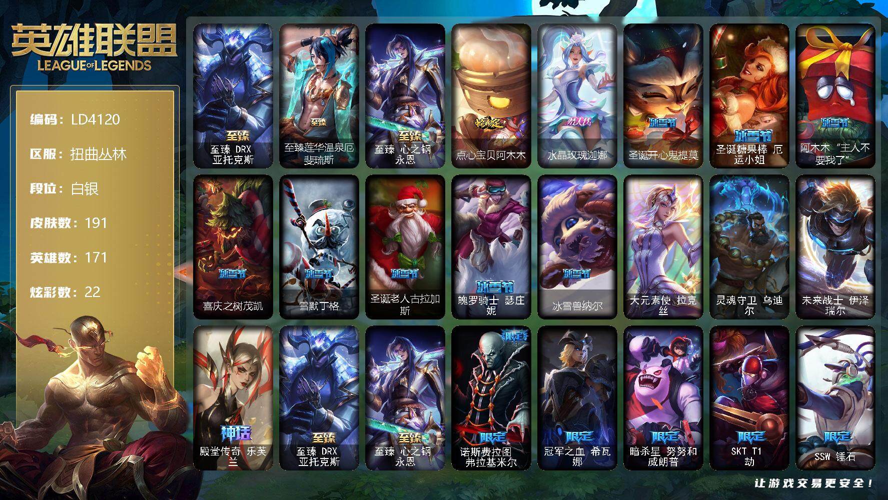 【11092040】【LD4120】171英雄/191皮肤/3终极/4神话/30限定/7臻彩/22炫彩/16传说/42史诗/白银账号等级:197/至臻DRX亚托克斯/至臻莲华温泉厄斐琉斯/至臻心之钢永恩/无畏骑士瑟庄妮赤子初心/冠军典狱长锤石凯旋圣装/玉剑传说琴仙子丁香/可爱可爱粉红红布里茨/殿堂传奇乐芙兰登神/魔女阿卡丽虚荣/魔女阿狸饕餮/点心宝贝阿木木/水晶玫瑰迦娜/圣诞开心鬼提莫/圣诞糖果