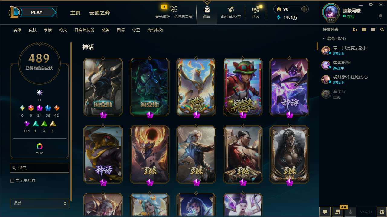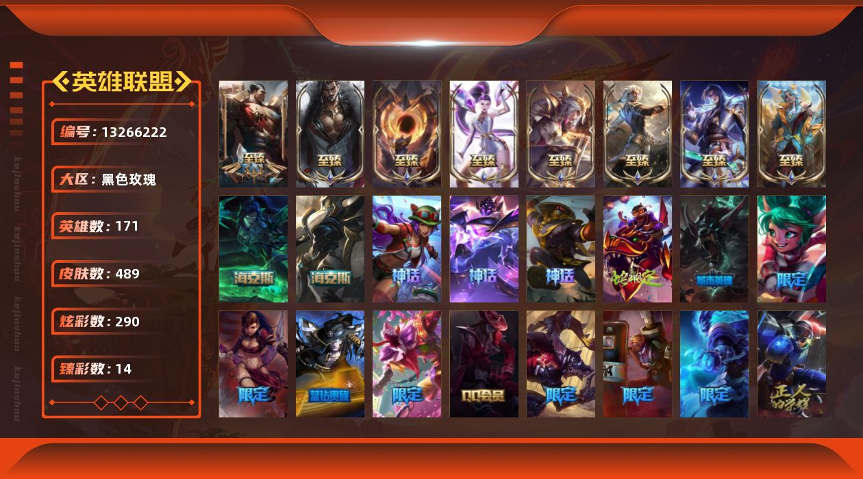 【11092114】[13266222]t29412【黑色玫瑰】489皮肤 290炫彩 14臻彩 14神话/58限定/42传说/171英雄 账号等级:776 单双排段位:钻石【重要头像】爱意绵绵 雪花 救生圈 北极星神黛安娜炫彩 圣诞捣蛋鬼金克丝 【重要皮肤】凯旋将军德莱厄斯至臻 狼神英灵斯维因至臻 天龙之子伊泽瑞尔至臻 心之钢永恩至臻 女帝黛安娜至臻 暗星墨菲特至臻 黑夜