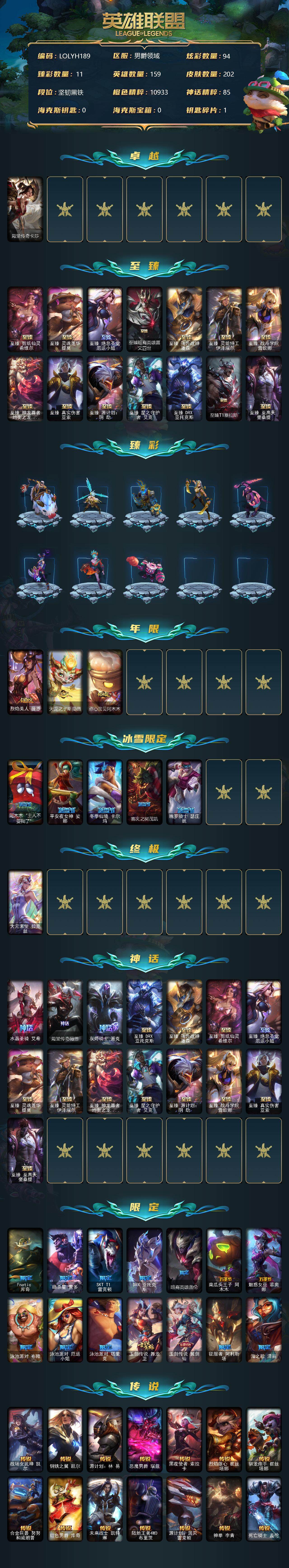【11092609】【LOLYH189】159英雄/202皮肤/1终极/17神话/22限定/11臻彩/94炫彩/30传说/18史诗/未定级/殿堂传奇卡莎/至臻剪纸仙灵希维尔/至臻灵魂莲华提莫/至臻绝息圣堂厄运小姐/至臻暗裔英雄嘉文四世/至臻飞升战神潘森/至臻灵能特工伊泽瑞尔/至臻战斗学院蕾欧娜/至臻神龙尊者均衡之龙沃利贝尔/至臻真实伤害亚索/至臻源计划:阴劫/至臻星之守护者艾克/至臻DRX亚托克