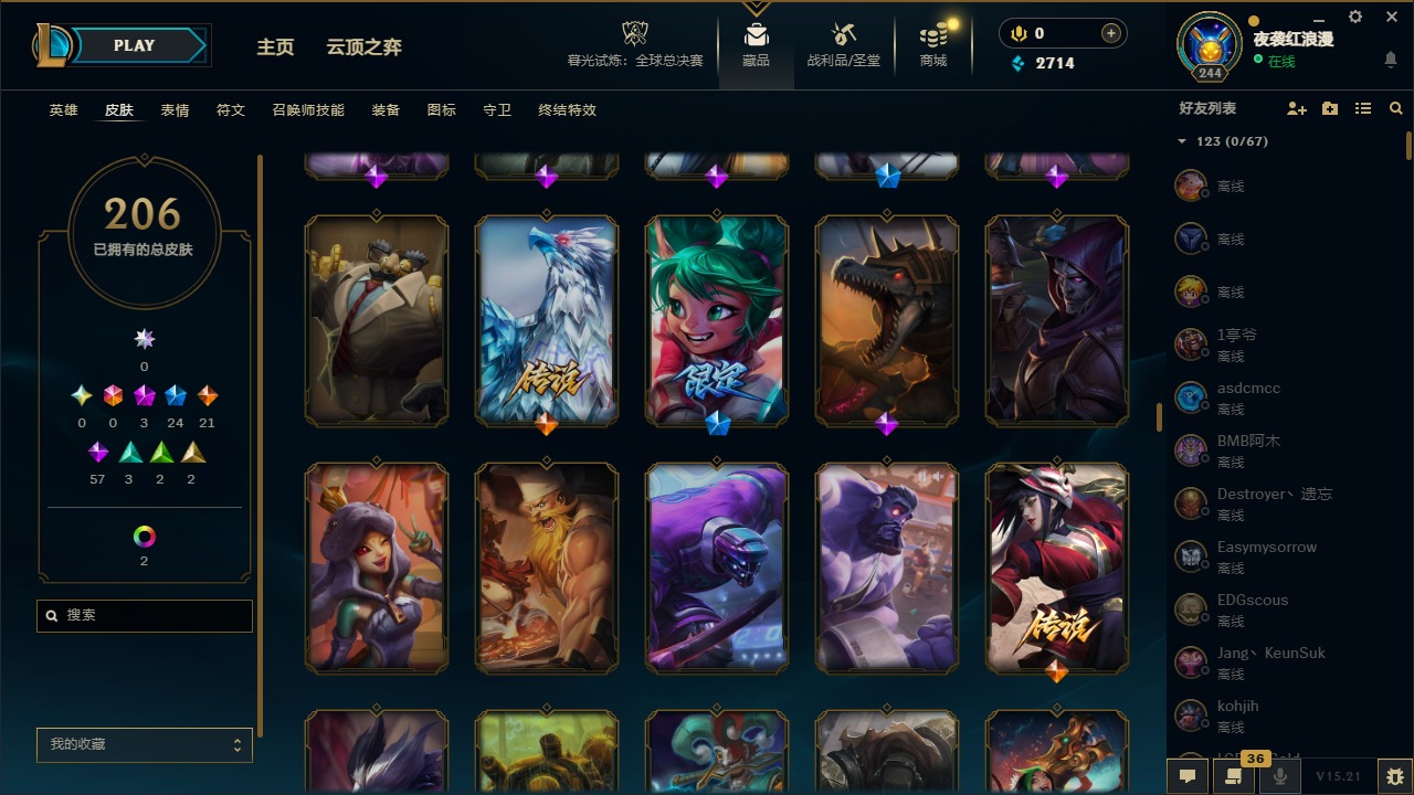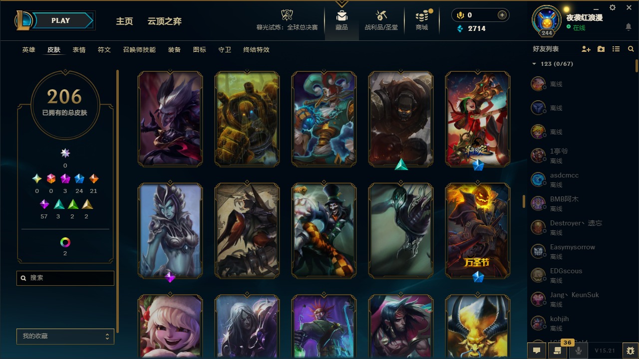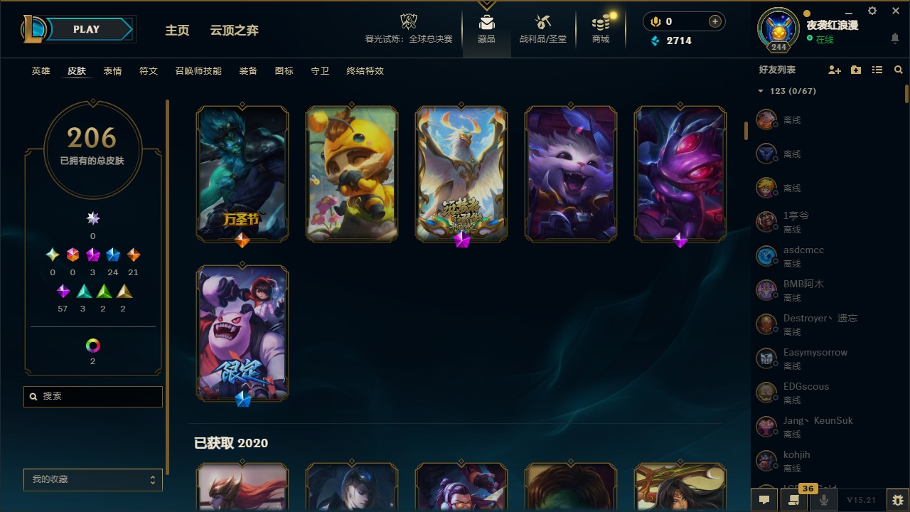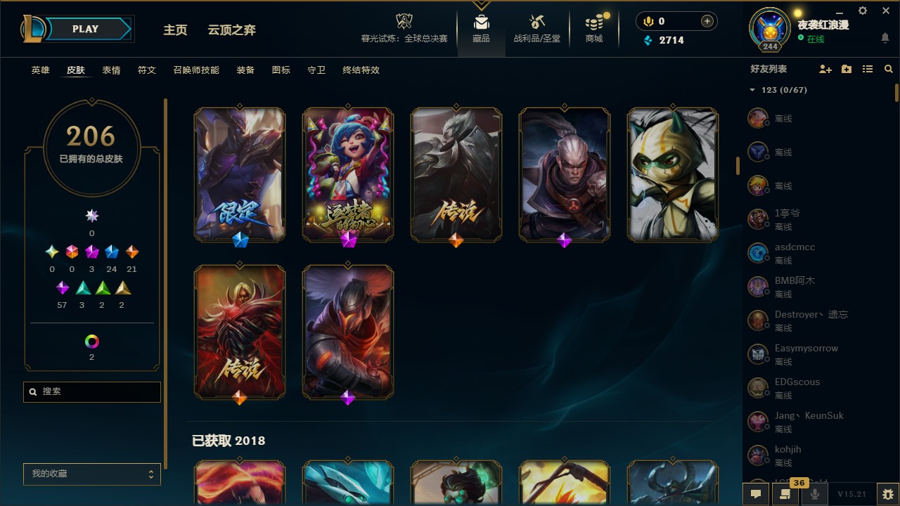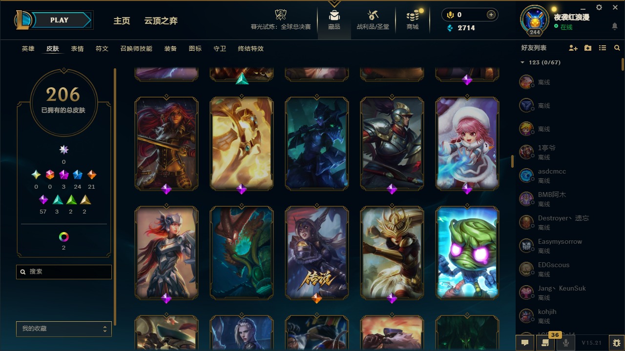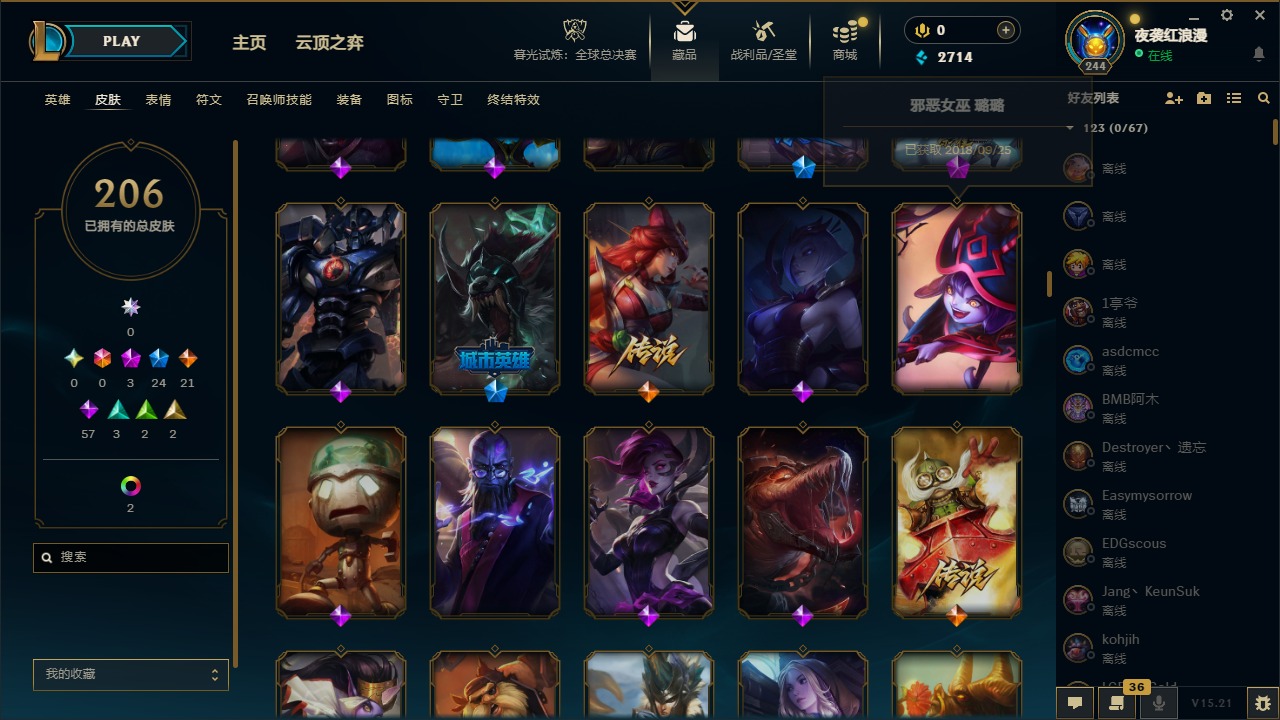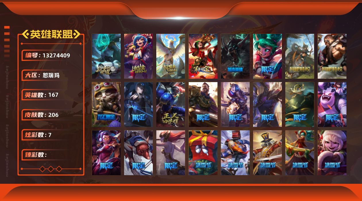 【11092671】3神话 24限定 21传说 57史诗 206皮肤 7炫彩 167英雄 可二次 可修改实名 【赛季限定皮】:胜利枪神 格雷福斯,胜利女神 奥莉安娜,胜利之剑 亚托克斯【冠军限定系列】:S1FNC 库奇,S2 暗杀星 努努,S3 SKT T1 薇恩,S4 SSW 图奇,S6 SKT T1 娜美【冰雪节限定】:阿木木:“主人不要我了”,冰雪节 辛吉德,胡桃夹子 萨科,平安夜女神 娑