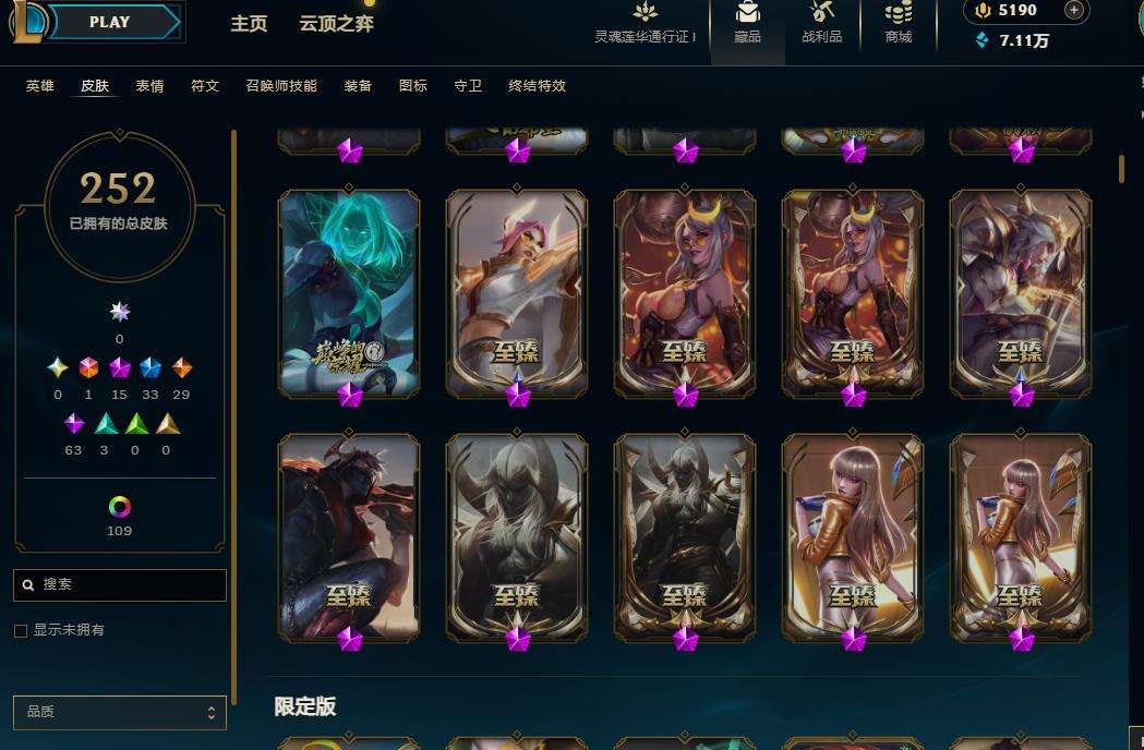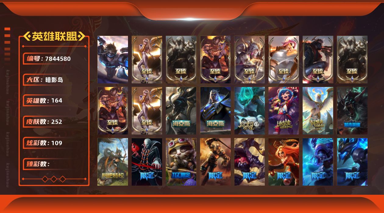 【11092879】[7844580]附赠5190点卷暗影岛英雄164/皮肤252/神话15/炫彩109未来战士/至臻 烈焰美人 薇恩(2022)/至臻 K/DA 卡莎(2022)/至臻 腥红之月 亚托克斯(2022)/至臻 K/DA 卡莎/至臻 腥红之月 亚托克斯/至臻 烈焰美人 薇恩/至臻 女帝 黛安娜/至臻 福牛守护者 菲奥娜/至臻 西部魔影 泰隆/海克斯 人马/海克斯 斯维因/觅心萝莉