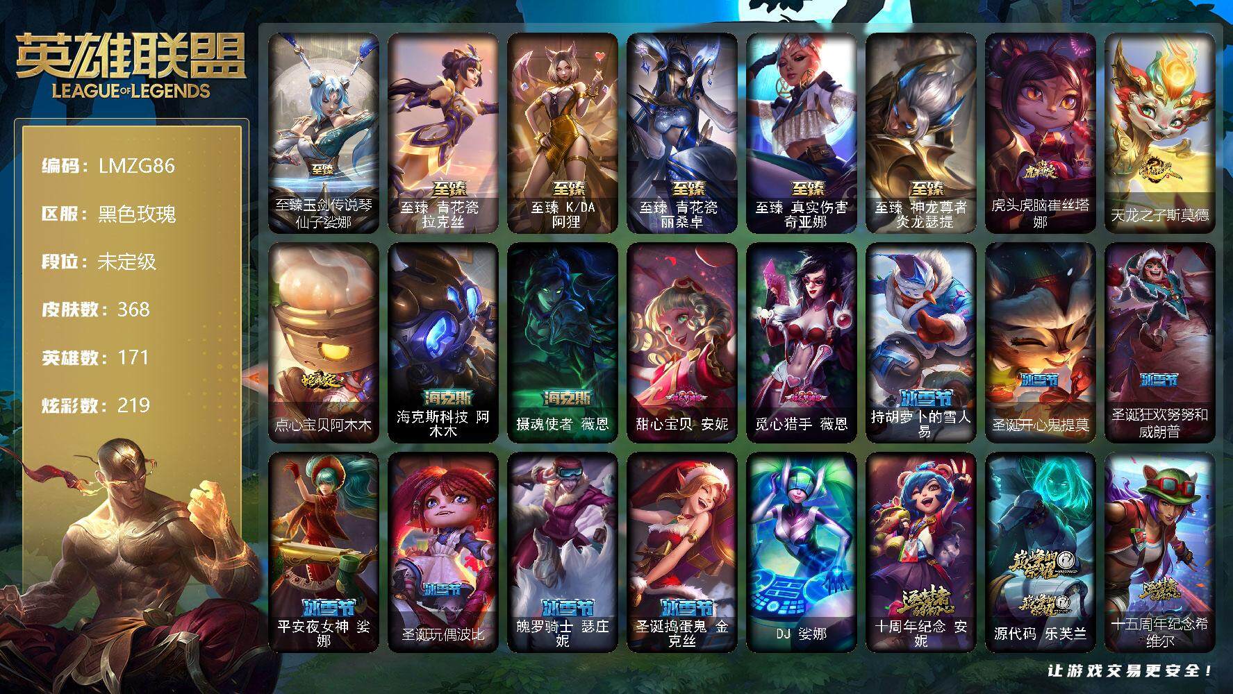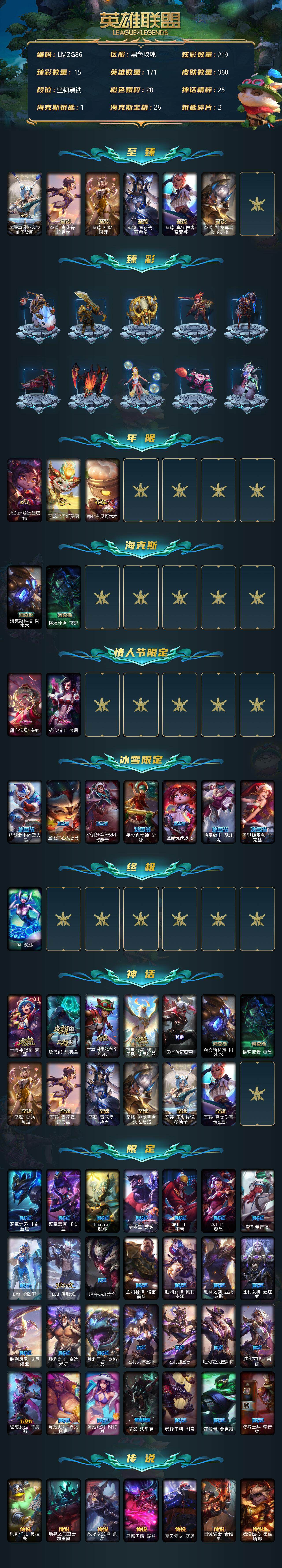 【11092924】【LMZG86】171英雄/368皮肤/1终极/13神话/41限定/15臻彩/219炫彩/44传说/68史诗/未定级/至臻玉剑传说琴仙子/至臻青花瓷拉克丝/至臻K/DA阿狸/至臻青花瓷丽桑卓/至臻真实伤害奇亚娜/至臻神龙尊者炎龙瑟提/天龙之子卡莎飞龙乘云/无畏骑士瑟庄妮赤子初心/张辽文远炫金将军/征服者阿利斯塔炫金/黎明使者锐雯黑夜使者/玉剑传说无劫胭脂/西部天使赛娜贝利尔之