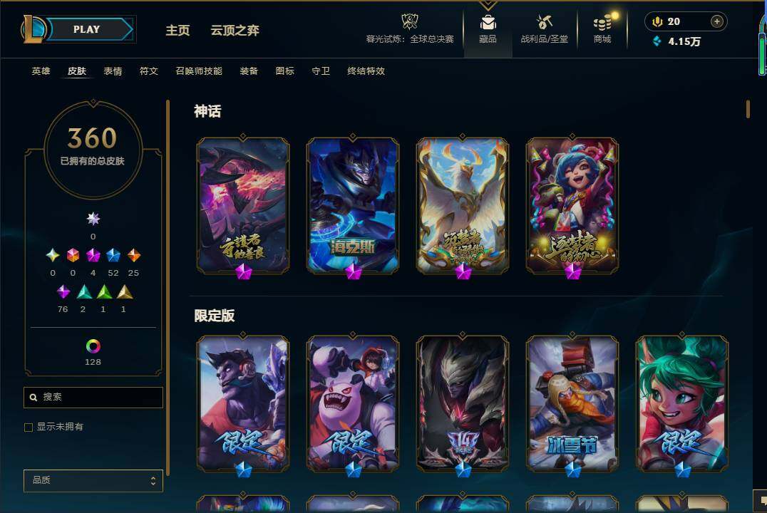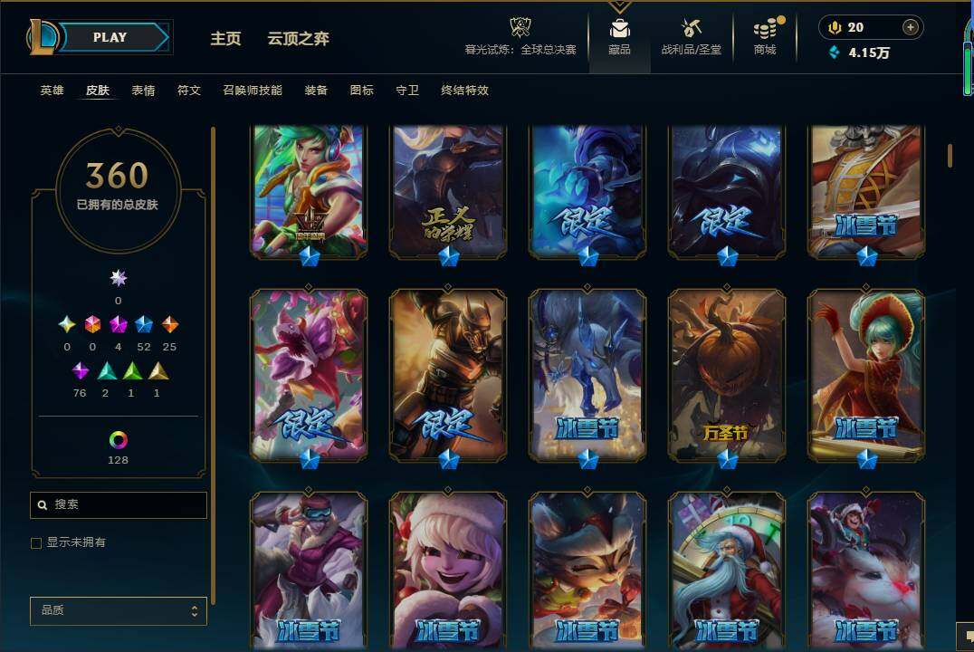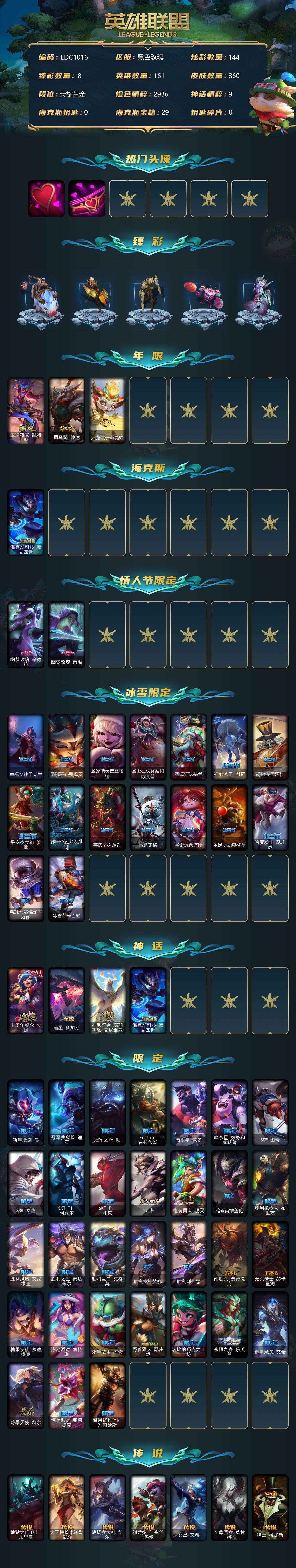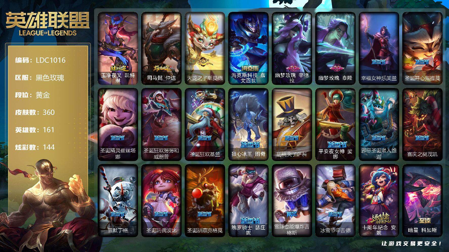 【11092984】【LDC1016】161英雄/360皮肤/4神话/52限定/8臻彩/144炫彩/25传说/76史诗/黄金/爱意绵绵/爱情之歌/天龙之子卡莎飞龙乘云/无畏骑士瑟庄妮赤子初心/征服者韦鲁斯炫金/冠军之隐劫凯旋圣装/可爱可爱粉红红布里茨/魔女阿卡丽虚荣/净雪之月莫甘娜冬虹/这货不是银狐库奇/玉净夜叉凯特琳/司马懿仲达/天龙之子斯莫德/海克斯科技嘉文四世/幽梦玫瑰辛德拉/幽梦玫瑰泰隆