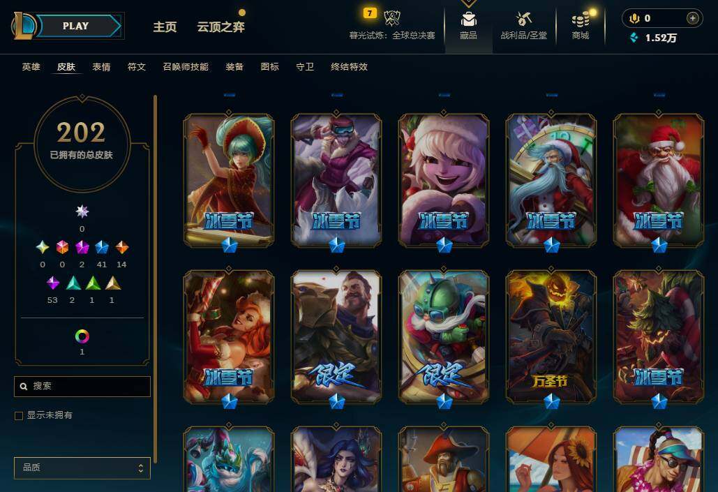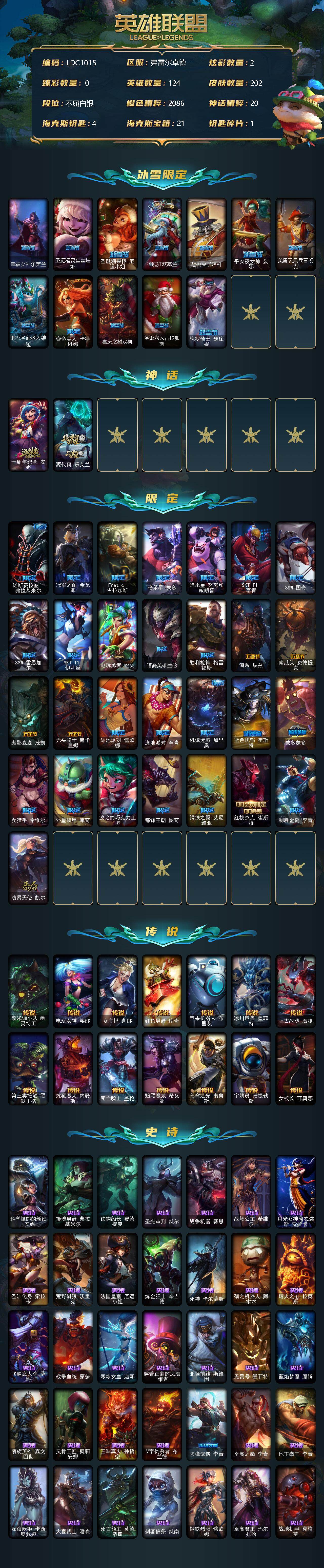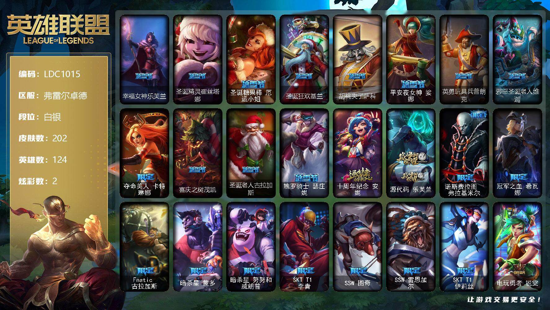 【11092986】【LDC1015】124英雄/202皮肤/2神话/41限定/2炫彩/14传说/53史诗/白银账号等级:121/幸福女神乐芙兰/圣诞精灵崔丝塔娜/圣诞糖果棒厄运小姐/圣诞狂欢基兰/胡桃夹子萨科/平安夜女神娑娜/英勇玩具兵普朗克/邪恶圣诞老人维迦/夺命美人卡特琳娜/喜庆之树茂凯/圣诞老人古拉加斯/魄罗骑士瑟庄妮/十周年纪念安妮/源代码乐芙兰/诺斯费拉图费拉基米尔/冠军之血希瓦娜/