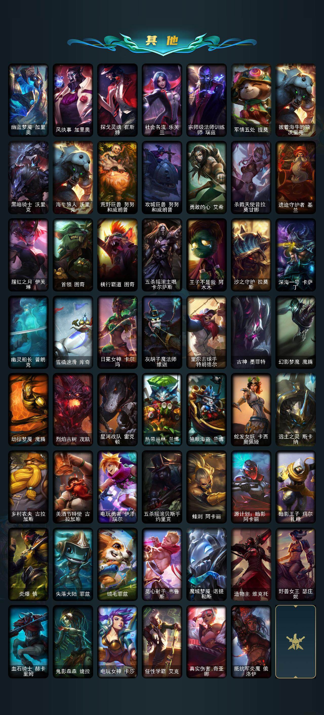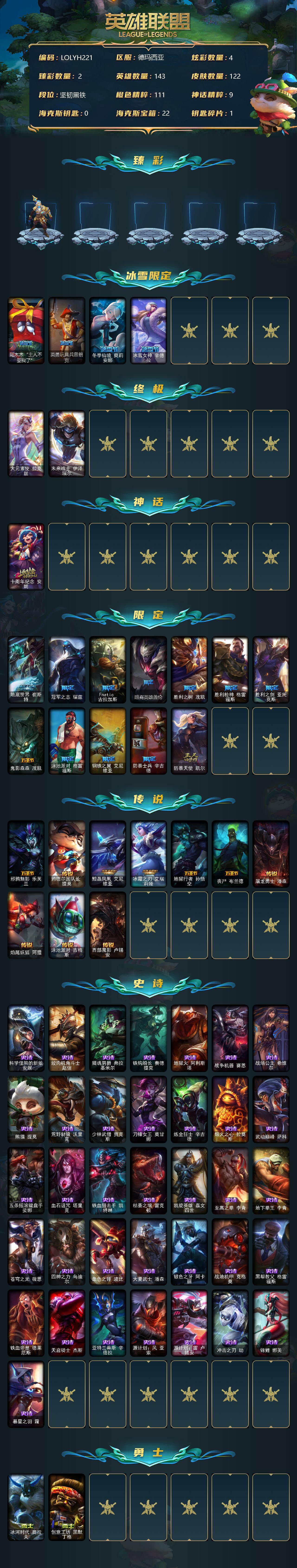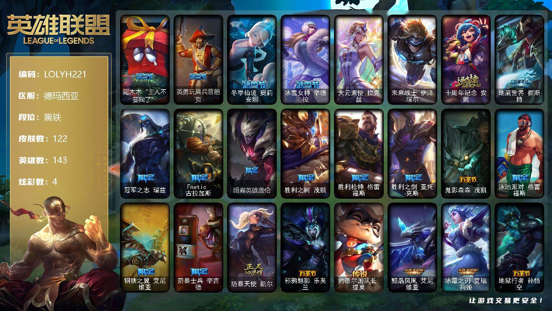 【11093035】【LOLYH221】143英雄/122皮肤/2终极/1神话/16限定/2臻彩/4炫彩/10传说/36史诗/黑铁/冠军之志瑞兹凯旋圣装/心之钢伊泽瑞尔锐意曲风/阿木木:“主人不要我了”/英勇玩具兵普朗克/冬季仙境奥莉安娜/冰雪女神辛德拉/大元素使拉克丝/未来战士伊泽瑞尔/十周年纪念安妮/地底世界崔斯特/冠军之志瑞兹/Fnatic古拉加斯/暗裔英雄盖伦/胜利之树茂凯/胜利枪神格雷