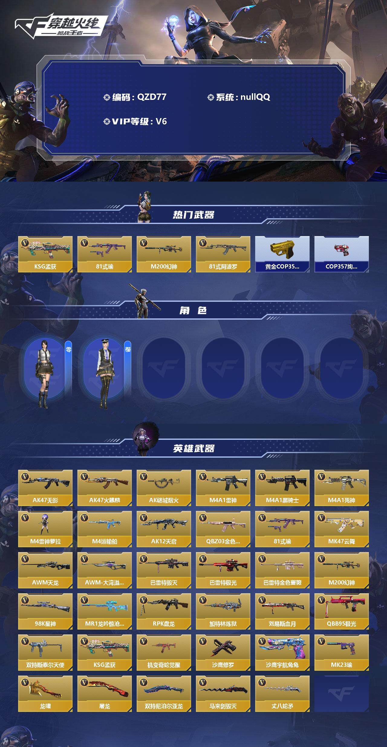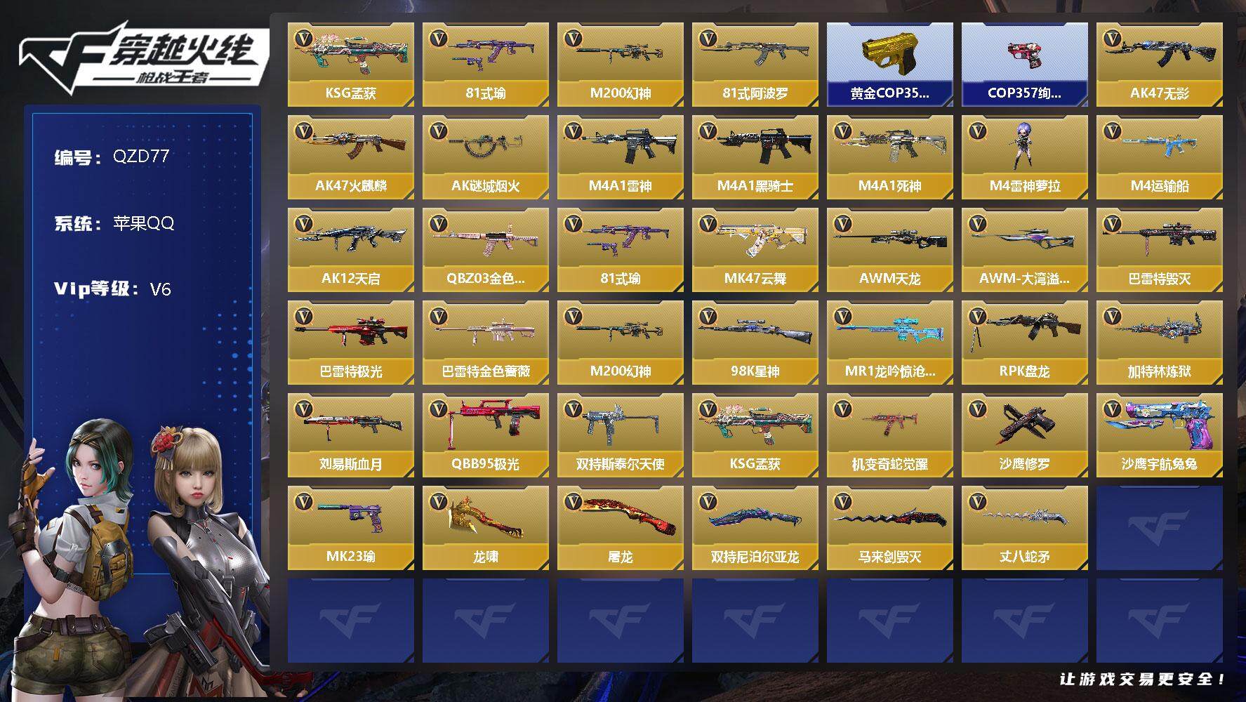 【11094376】【QZD77】VIP6/74V/KSG-孟获/81式-瑜/幻神/81式-阿波罗/黄金COP 357/COP 357-绚樱/零/樱/无影/火麒麟/AK47-谜城烟火/雷神/黑骑士/M4A1-死神/M4A1-雷神-萝拉/M4A1-运输船/AK12-天启/QBZ03-金色蔷薇/MK47-云舞/AWM-天龙/AWM-大湾溢彩/毁灭/巴雷特-极光/巴雷特-金色蔷薇/98K-星神/MR1