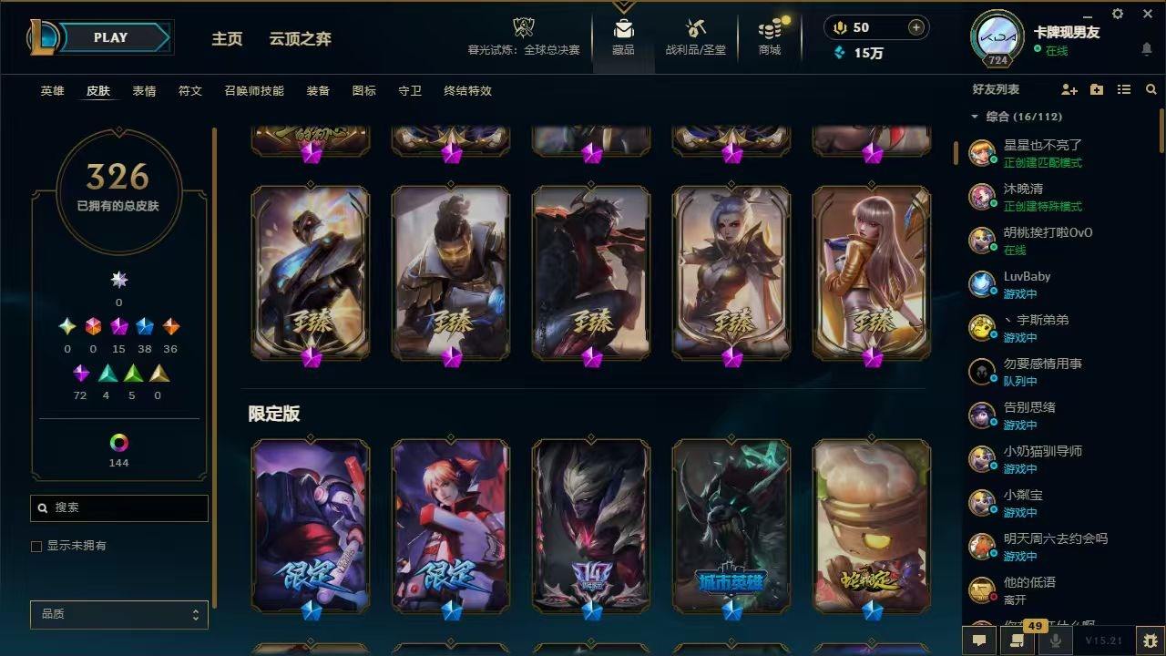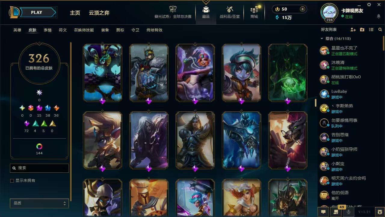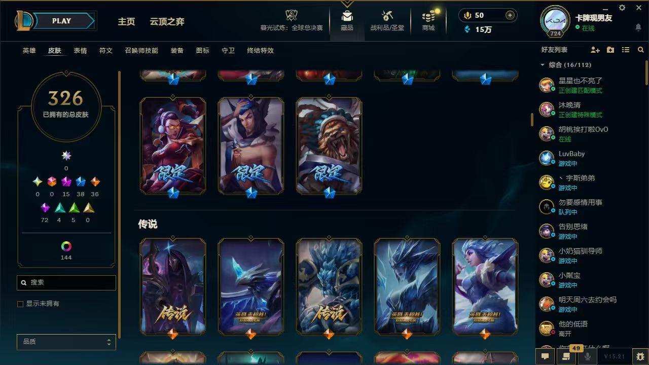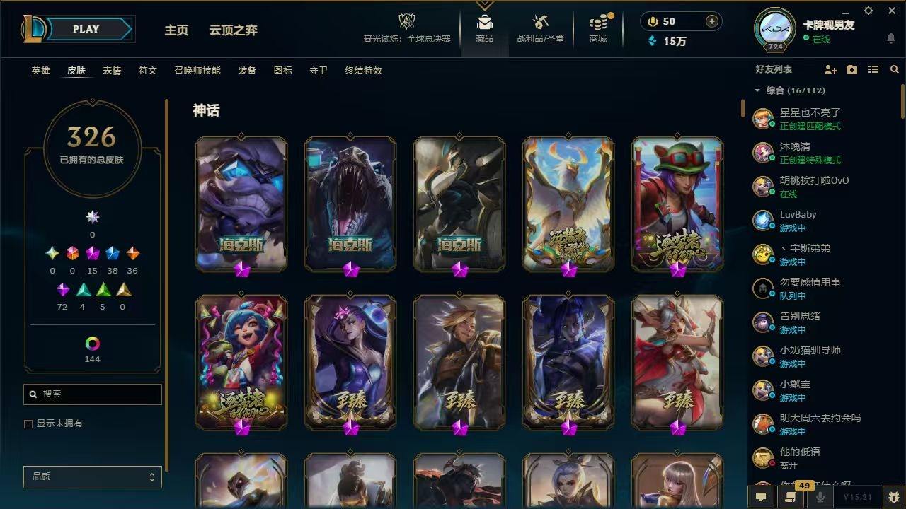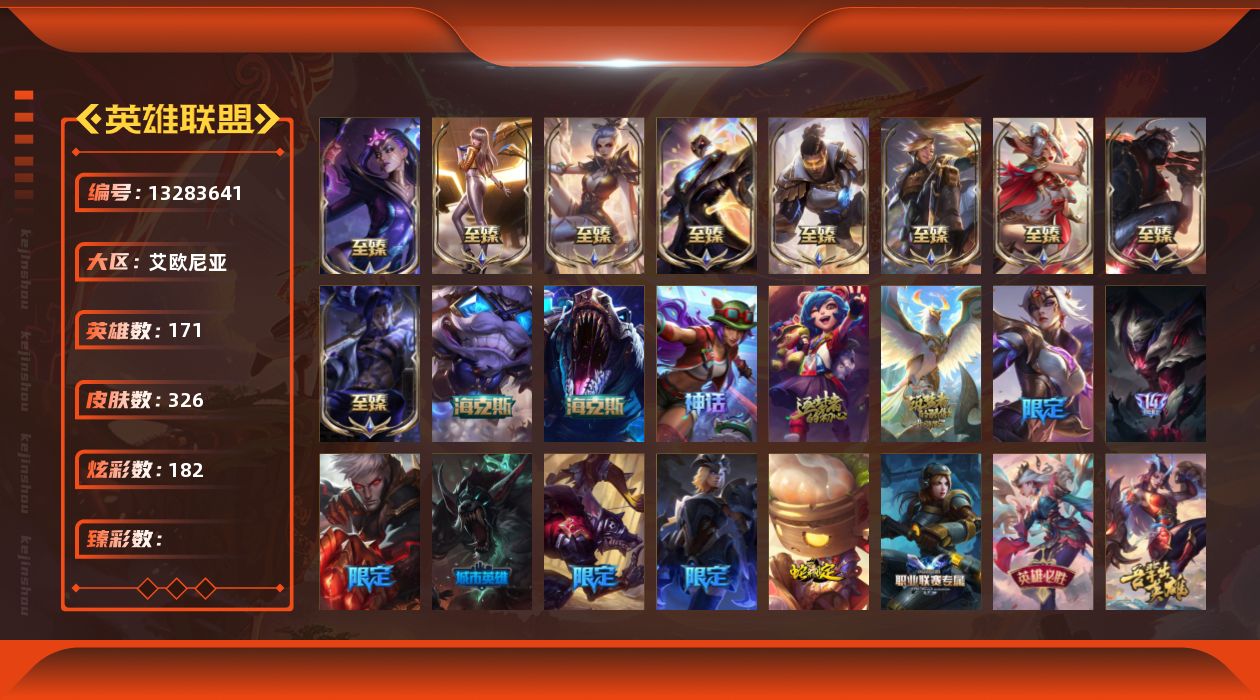 【11094617】[13283641]15神话 38限定 36传说 72史诗 326皮肤 182炫彩 171英雄 可二次 可修改实名 【至臻】:至臻 墨之影武者 亚索,至臻 暗星女王 黛安娜,至臻 K/DA 卡莎,至臻 玉剑传说 武剑仙,至臻 未来战士 锤石,至臻 未来战士 卢锡安,至臻 灵能特工 伊泽瑞尔,至臻 神凰行者 烈羽焰凰 霞,至臻 西部魔影 泰隆【海克斯】:海克斯 吉格斯,海克斯