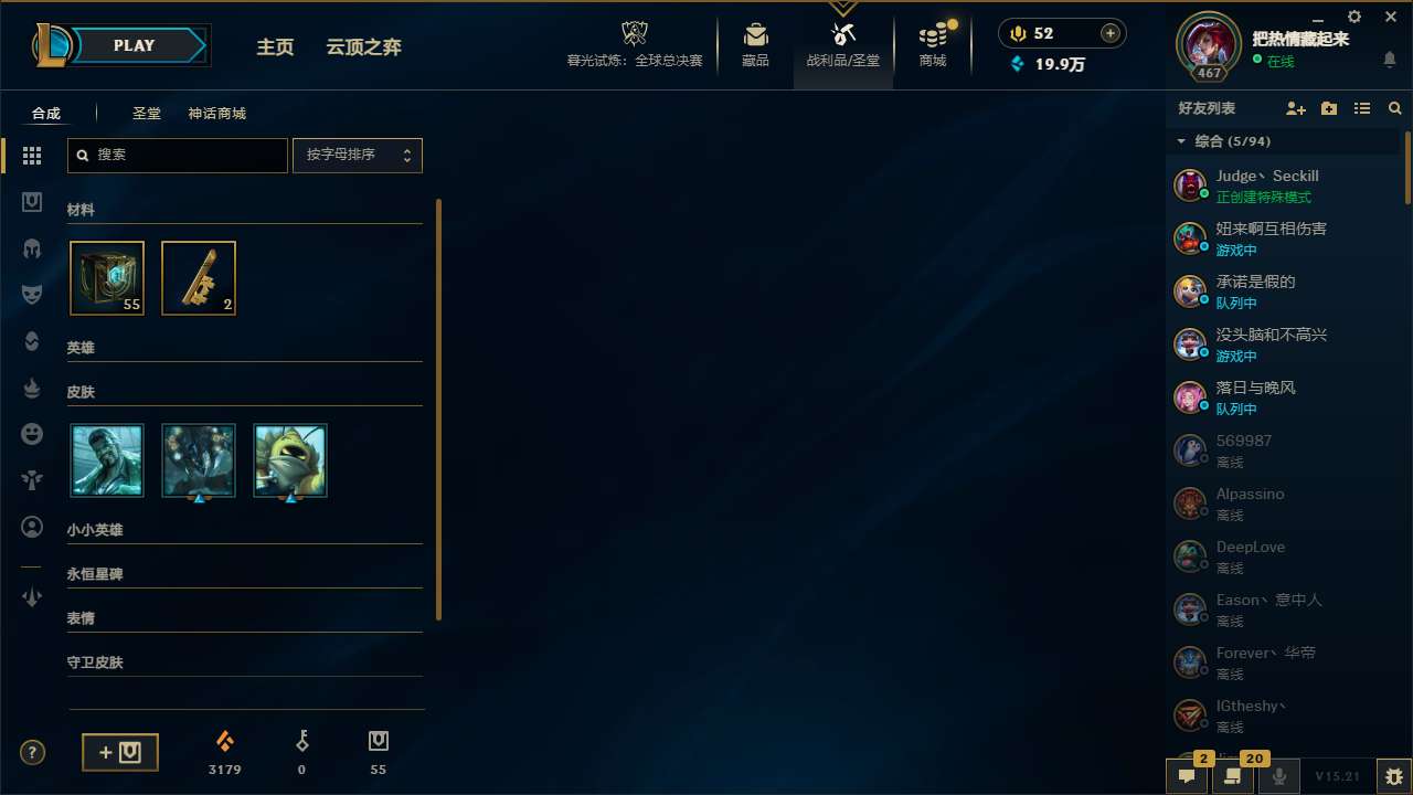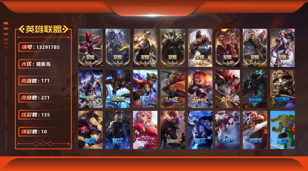 【11096547】[13291785]t29502【暗影岛】271皮肤 135炫彩 10臻彩 13神话/28限定/21传说/171英雄 账号等级:467 单双排段位:铂金【重要头像】爱情之歌 心型钥匙 KDA萨勒芬妮 不错哦 【重要皮肤】黑色玫瑰假面舞会卡特琳娜至臻 魔域梦魇泽丽至臻 T1杰斯至臻 心之钢永恩至臻 幻灵战斗猫金克丝至臻 未来战士卢锡安至臻 源计划逆流塞拉