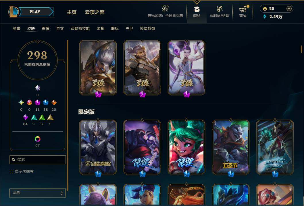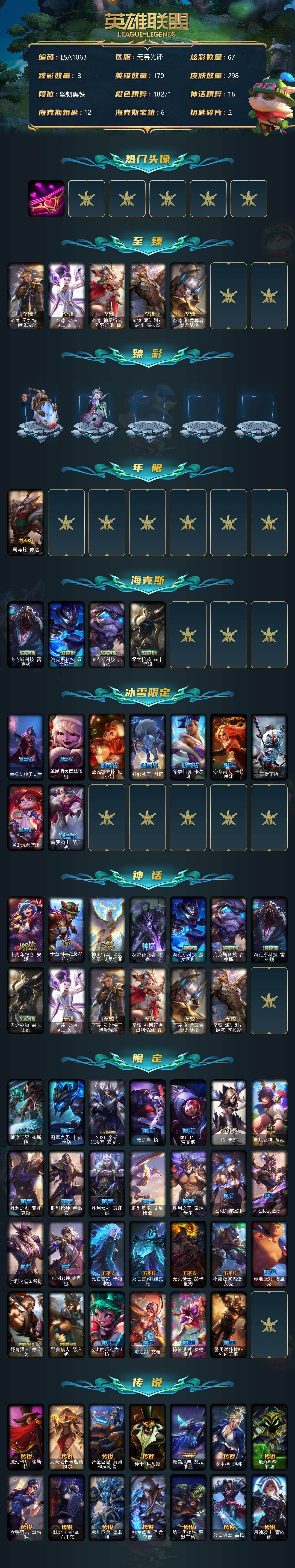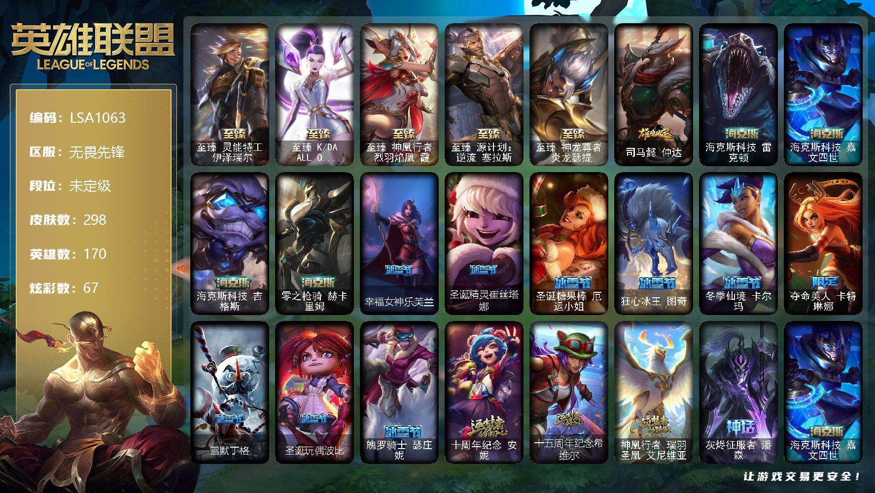 【11100727】【LSA1063】170英雄/298皮肤/13神话/38限定/3臻彩/67炫彩/20传说/64史诗/未定级账号等级:438/爱情之歌/至臻灵能特工伊泽瑞尔/至臻K/DAALLOUT卡莎/至臻神凰行者烈羽焰凰霞/至臻源计划:逆流塞拉斯/至臻神龙尊者炎龙瑟提/无畏骑士瑟庄妮赤子初心/魔女阿卡丽虚荣/净雪之月莫甘娜冬虹/司马懿仲达/海克斯科技雷克顿/海克斯科技嘉文四世/海克斯科技吉