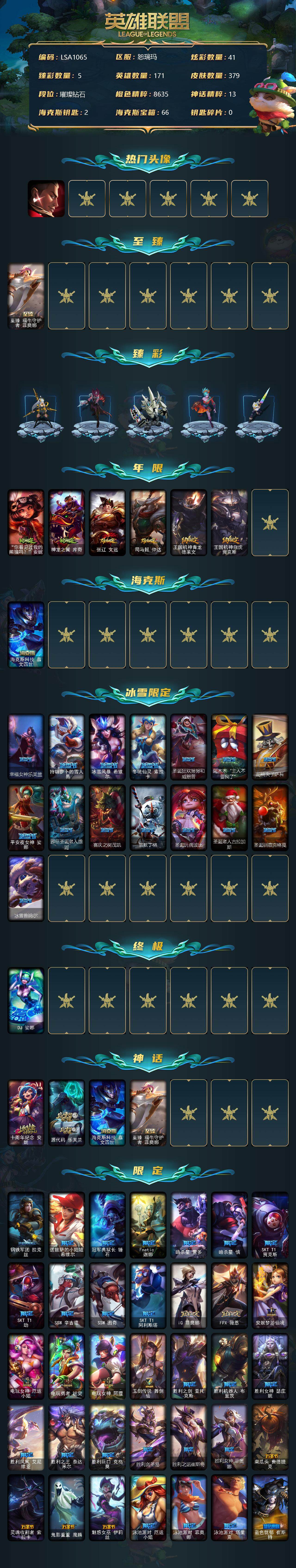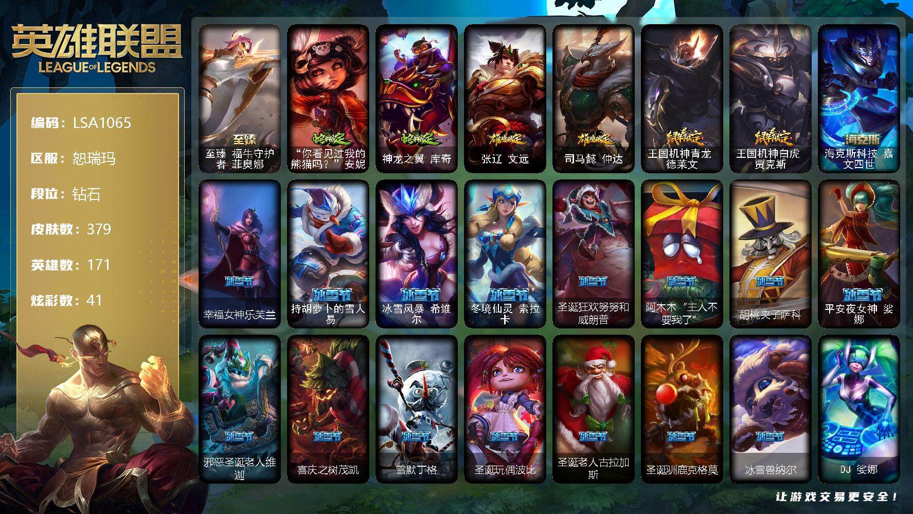 【11101146】【LSA1065】171英雄/379皮肤/1终极/4神话/69限定/5臻彩/41炫彩/31传说/93史诗/钻石账号等级:475/觅心游侠卢锡安/至臻福牛守护者菲奥娜/玉剑传说舞剑仙轩辕/西部魔影卢锡安贝利尔之怠/霸天巨兽雪崩墨菲特/灵魂莲华锐雯流火/持七彩冰棍的雪人易/“你看见过我的熊猫吗?”安妮/神龙之翼库奇/张辽文远/司马懿仲达/王国机神青龙德莱文/王国机神白虎贾克斯/海