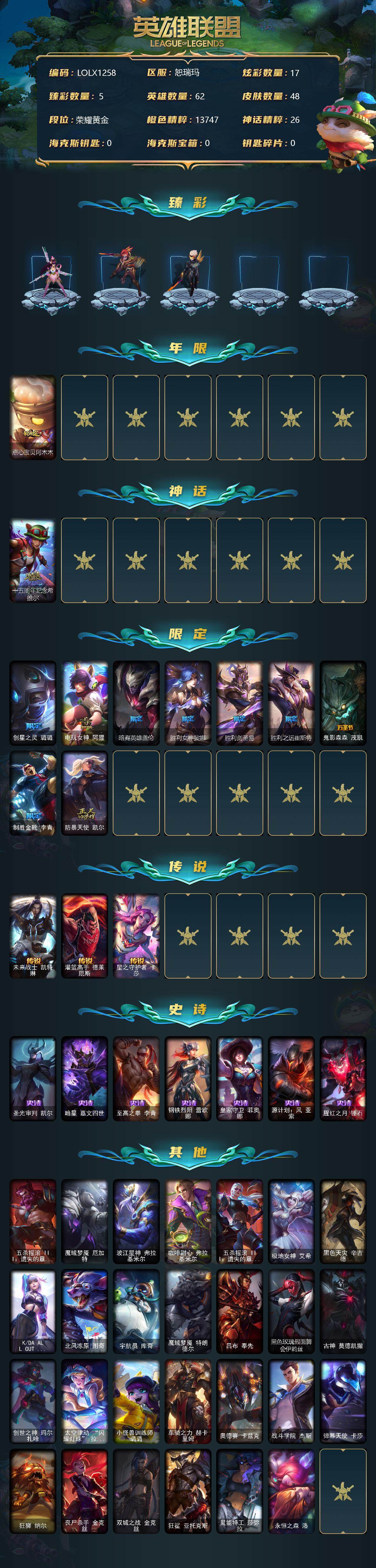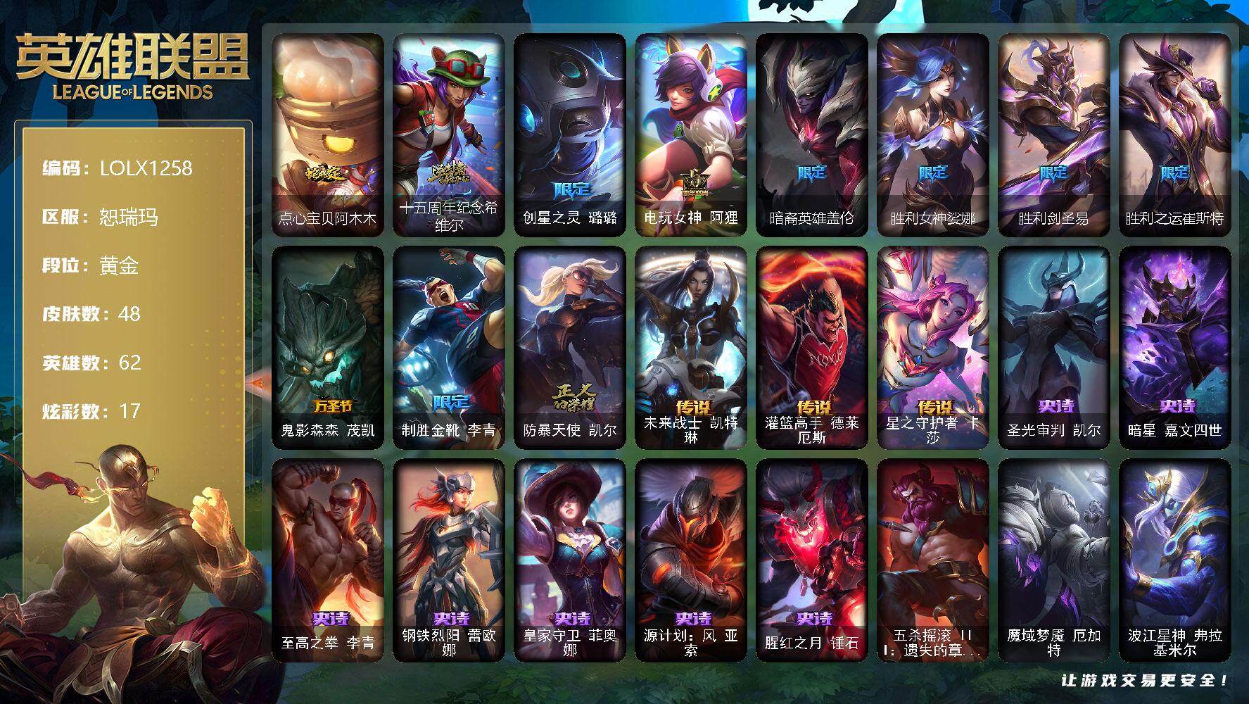 【11102452】【LOLX1258】62英雄/48皮肤/1神话/10限定/5臻彩/17炫彩/3传说/7史诗/黄金/玉剑传说舞剑仙承影/黎明使者锐雯黑夜使者/源计划火菲奥娜惩戒/星之守护者阿卡丽热情之光/霸天异形卡兹克丛林灾厄/点心宝贝阿木木/十五周年纪念希维尔/创星之灵璐璐/电玩女神阿狸/暗裔英雄盖伦/胜利女神娑娜/胜利剑圣易/胜利之运崔斯特/鬼影森森茂凯/制胜金靴李青/防暴天使凯尔/未来战