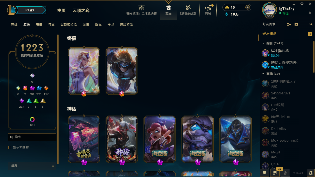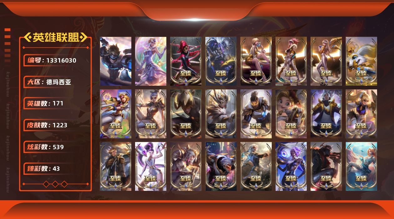 【11103013】[13316030]t29505【德玛西亚】1223皮肤 539炫彩 43臻彩 38神话/221限定/117传说/171英雄 账号等级:556 云顶神话:1【重要头像】云顶战斗学院伊泽瑞尔 觅心游侠卢锡安 觅心之翼奎因 星守卡莎 EDG厄斐琉斯 EDG佛耶戈 EDG格雷福斯 EDG悠米 EDG佐伊 星守金克丝炫彩 青花瓷伊泽瑞尔 送披萨的小姐姐希维尔