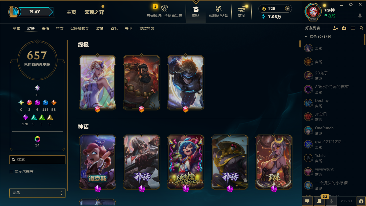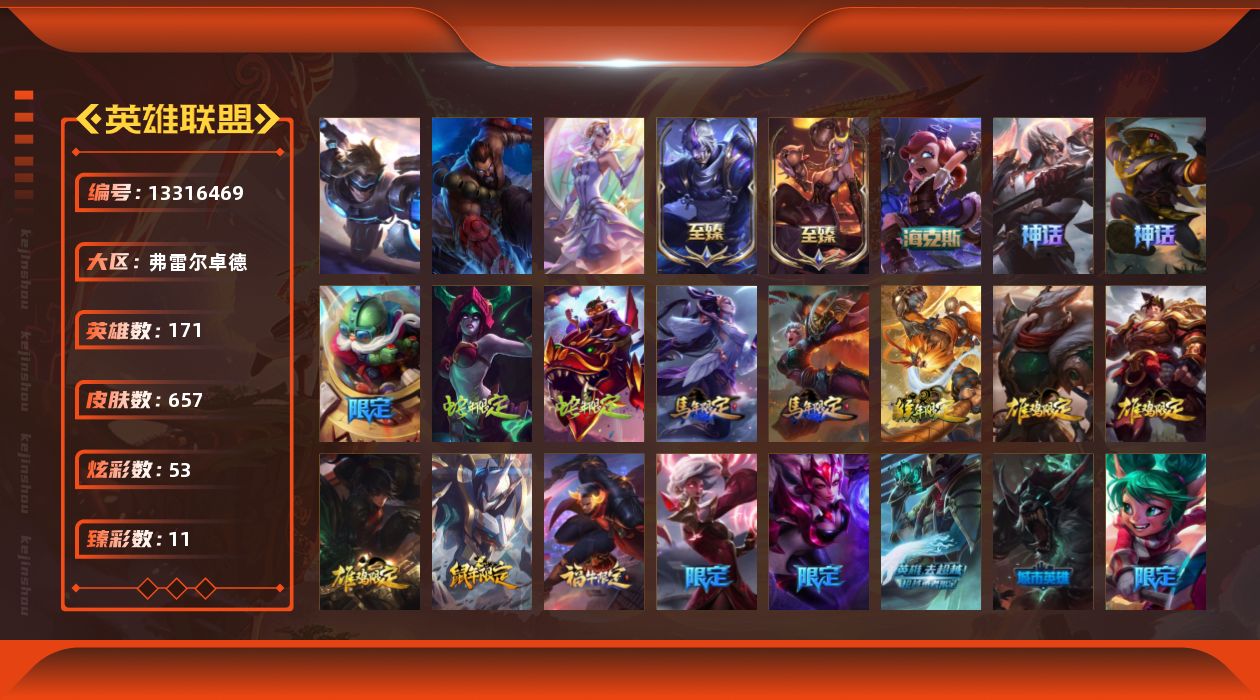 【11103127】[13316469]t29521【弗雷尔卓德】657皮肤 53炫彩 11臻彩 6神话/115限定/58传说/171英雄 账号等级:228【重要皮肤】灵魂莲华劫至臻 烈焰美人薇恩至臻 圣洁神王德莱厄斯 海克斯科技安妮 新卧虎藏龙贾克斯 冰原狙击凯特琳 钢铁军团拉克丝 电玩女神厄运小姐 电玩勇者锐雯 龙的传人李青 银龙裁决泰隆 替父从军花木兰 碧玉之牙卡西
