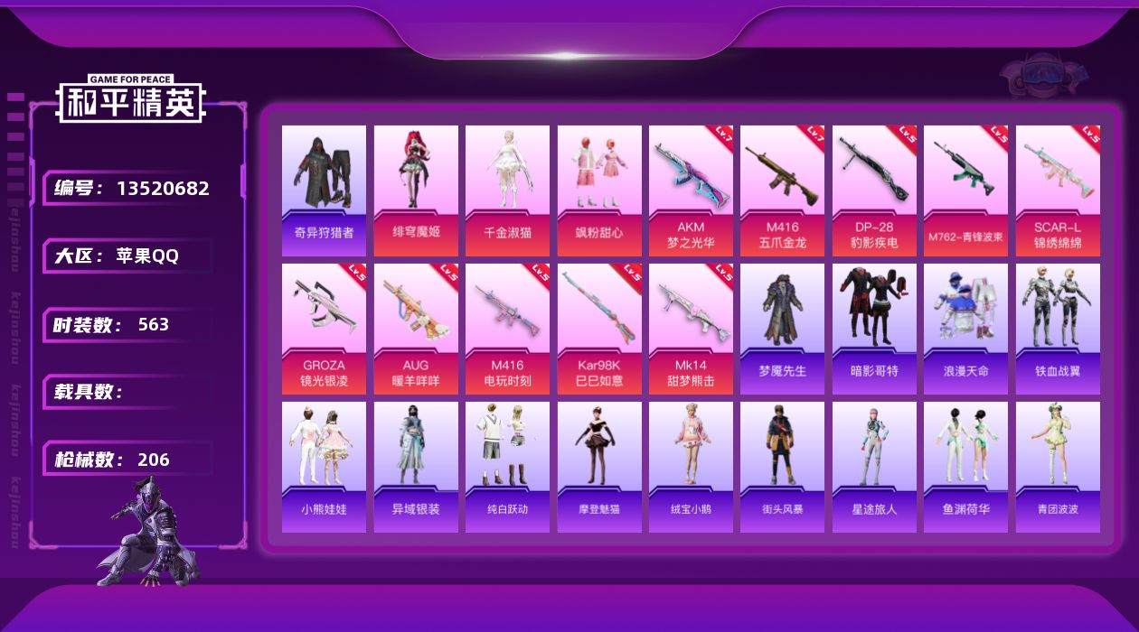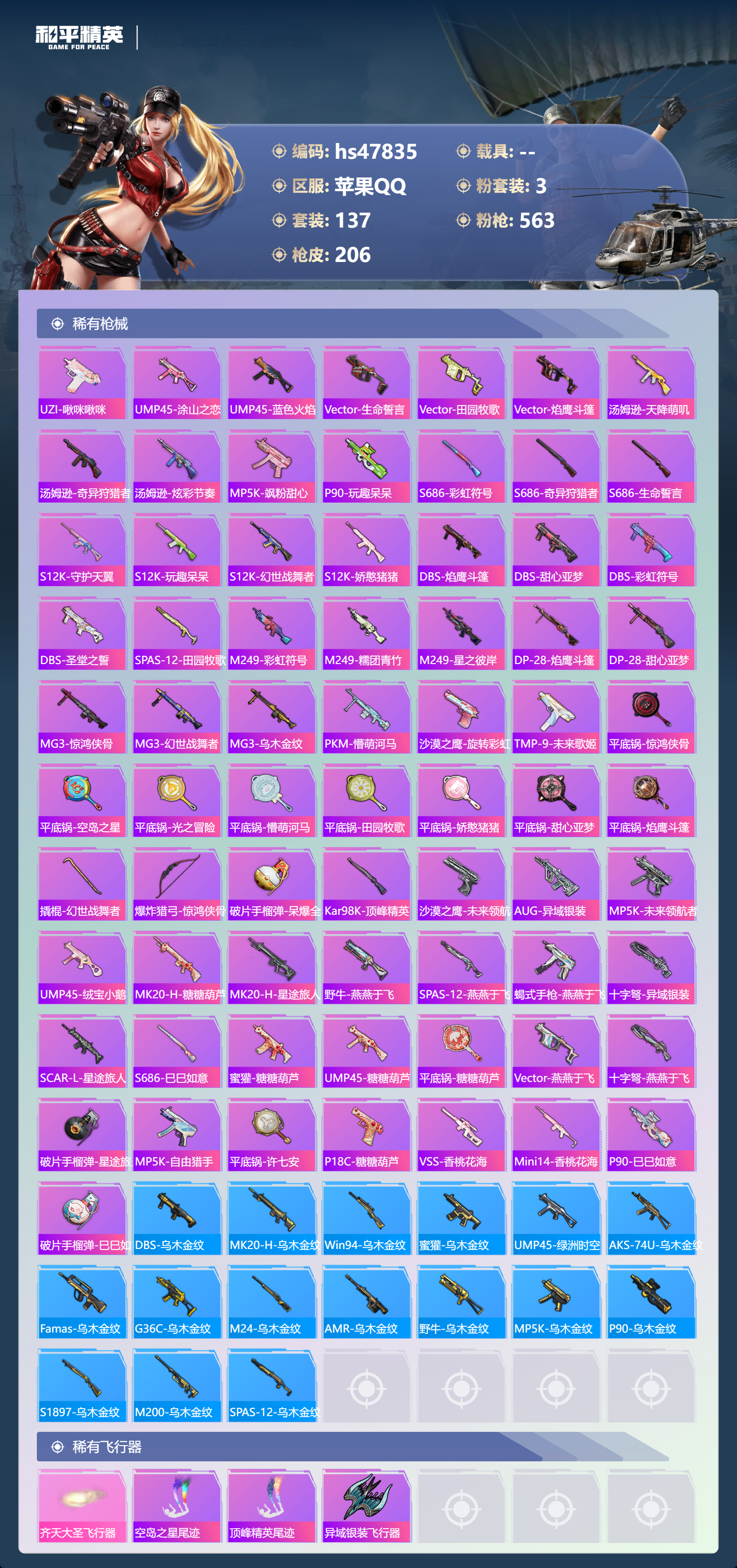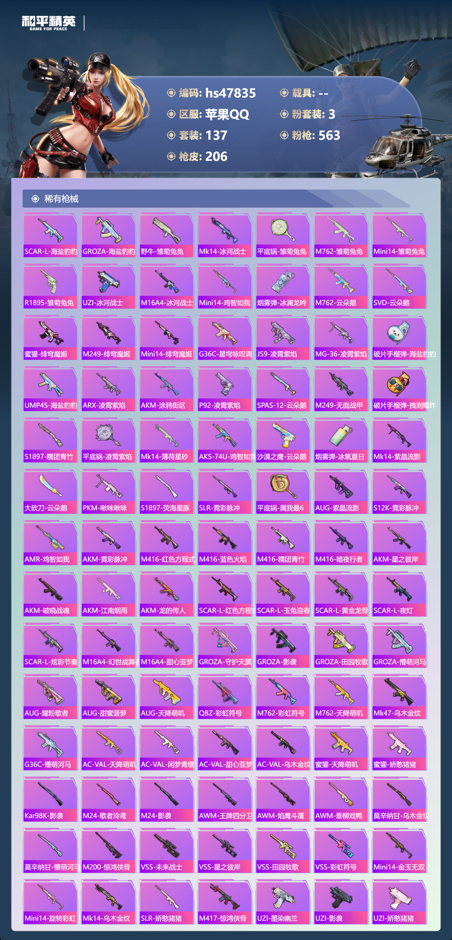 【11155964】【不可二次】【苹果QQ】龟仙人 水银刺客 S686-奇异狩猎者 M762-青锋波束 M416-五爪金龙 漫步者 奇异狩猎者 齐天大圣飞行器 狂沙舞者 M416-电玩时刻 SCAR-L-锦绣绵绵 AKM-梦之光华 粉红小猪 抹茶蜜豆 浪漫天命 暗影哥特