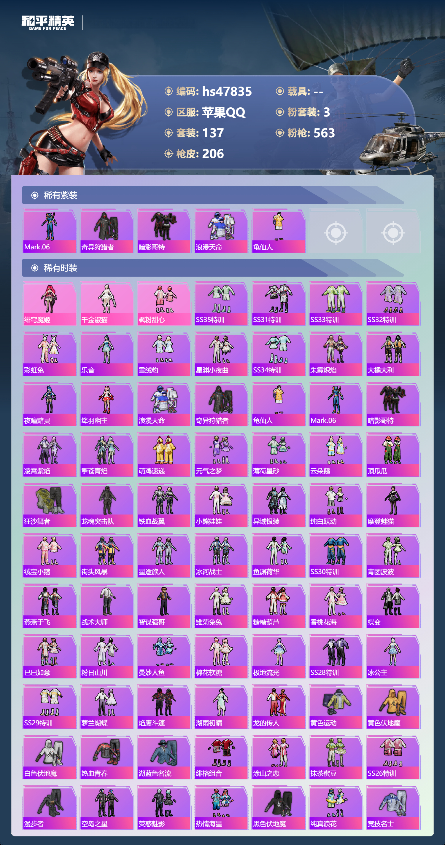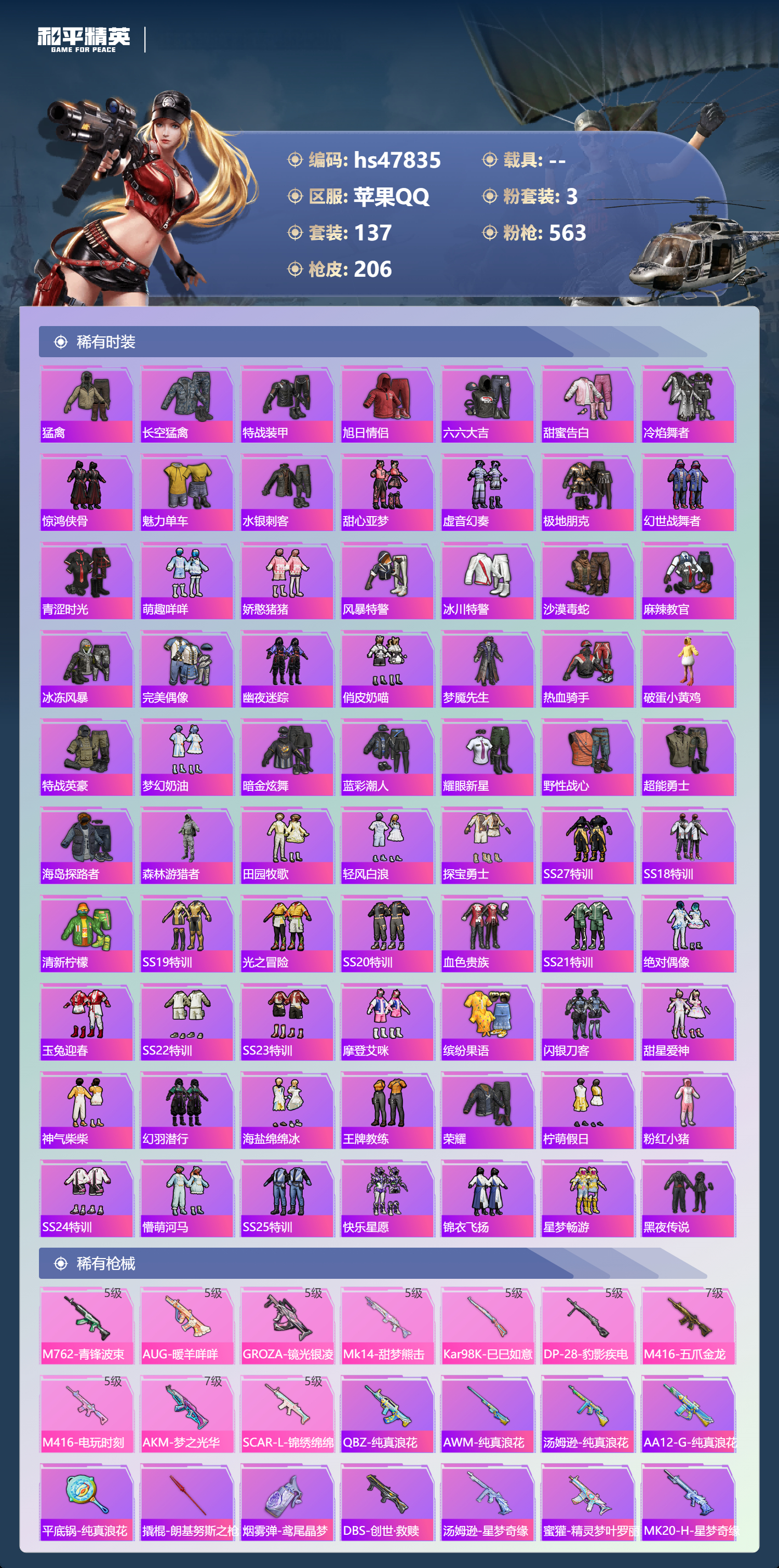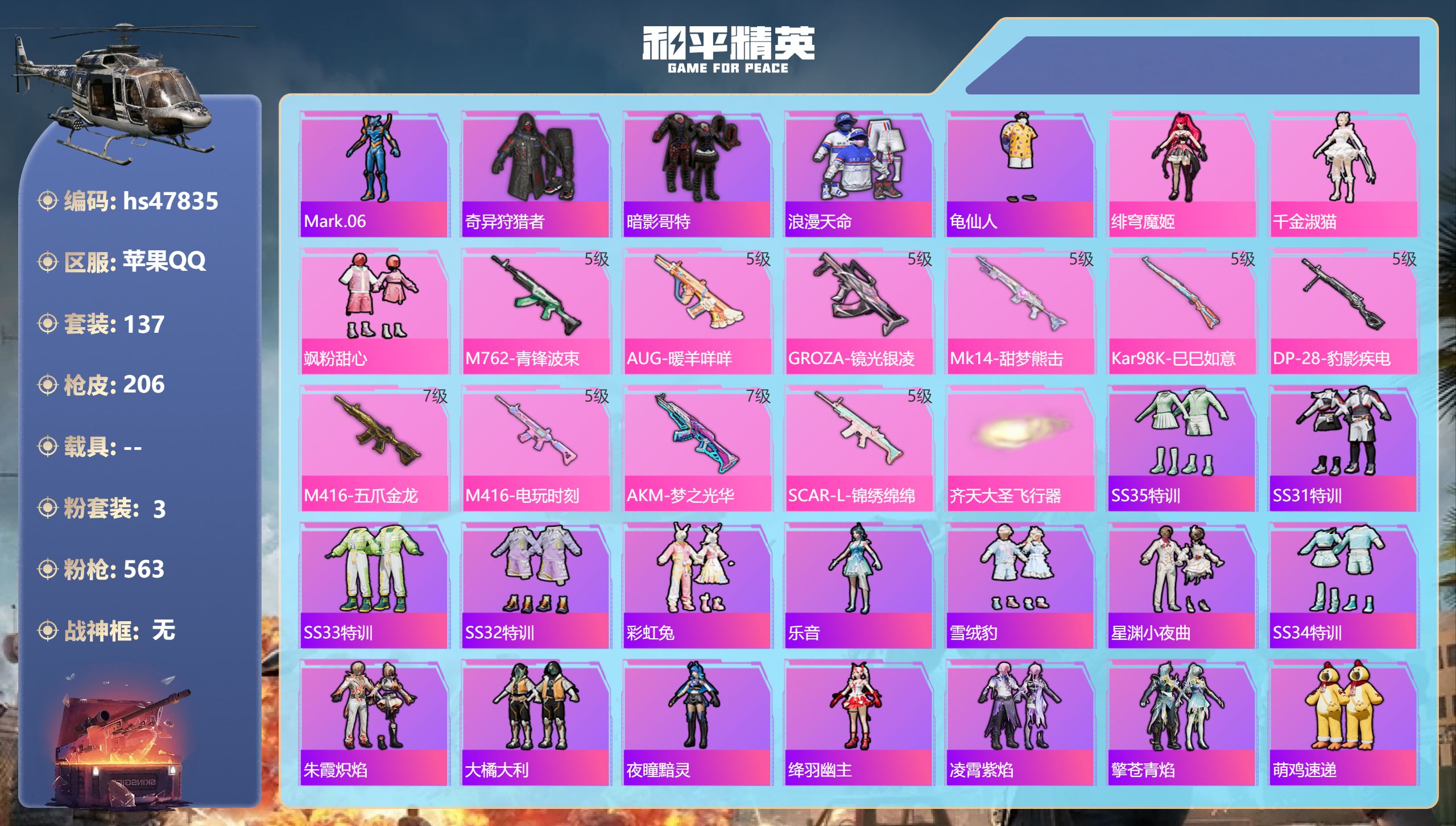 【11155964】【不可二次】【苹果QQ】龟仙人 水银刺客 S686-奇异狩猎者 M762-青锋波束 M416-五爪金龙 漫步者 奇异狩猎者 齐天大圣飞行器 狂沙舞者 M416-电玩时刻 SCAR-L-锦绣绵绵 AKM-梦之光华 粉红小猪 抹茶蜜豆 浪漫天命 暗影哥特