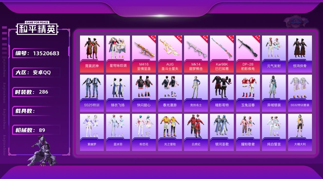 【11155969】[13520683]实名: 可修改 时装数: 286 枪械数: 89 战备数: 67 热门装扮: 霓裳武神,星穹咏叹调 稀有枪皮: M416至情至圣,Kar98K-巳巳如意,AUG-圣斗士星矢,MK14-甜梦熊击,DP-28-豹影疾电