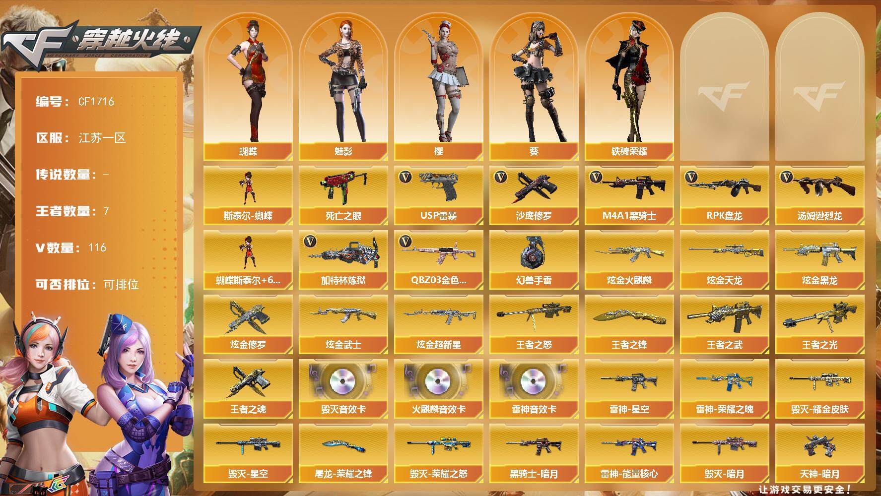 【9548】【9548】【CF1716】【商品标题】:江苏一区-116V-7王者-6炫金【6烈龙】【斯泰尔-蝴蝶】【死亡之眼】【6盘龙】【QBZ95-幻兽】【