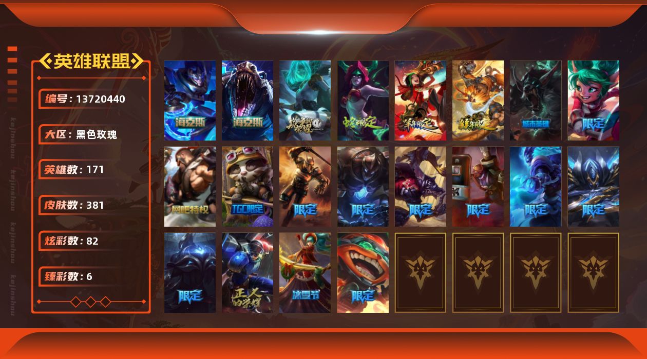 【9911】[13720440]t30354 皇冠账号【黑色玫瑰】原皮龙瞎 381皮肤 82炫彩 6臻彩 4神话/51限定/31传说/171英雄 账号等级:531 单双排段位:铂金【重要头像】心型钥匙 沐浴震惊 【重要皮肤】海克斯科技雷克顿 海克斯科技嘉文四世 胜利剑圣易 胜利女神娑娜 胜利之王泰达米尔 胜利巨口克格莫 电玩女神阿狸 龙的传人李青 神龙烈焰金克丝 碧玉之牙卡