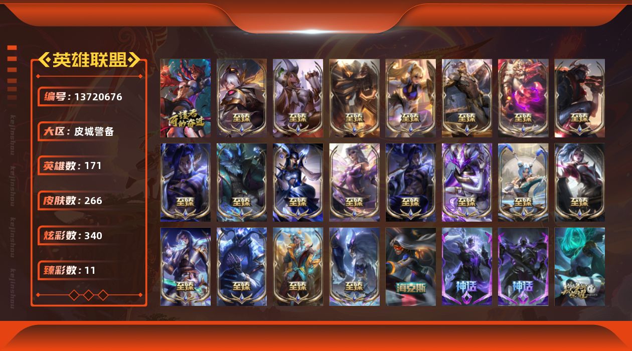 【9977】[13720676]t30361【皮城警备】266皮肤 340炫彩 11臻彩 25神话/40限定/41传说/171英雄 账号等级:1074 单双排段位:翡翠【重要头像】心型钥匙 魔女伊芙琳炫彩 KDA萨勒芬妮 灵魂莲华厄斐琉斯 绝息圣堂霞 送披萨的小姐姐希维尔 战斗学院伊泽瑞尔神话炫彩 真实伤害艾克 至臻青花瓷丽桑卓 西部魔影卢锡安炫彩头 水晶圣骑蕾欧娜炫彩头