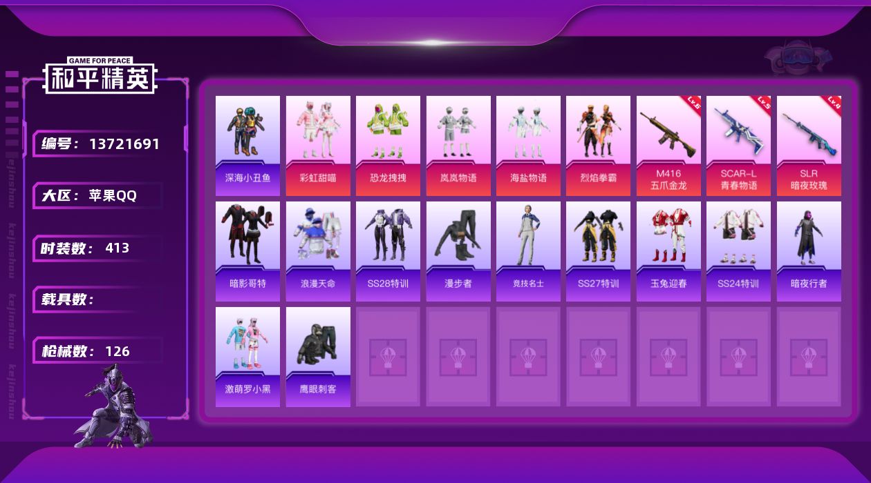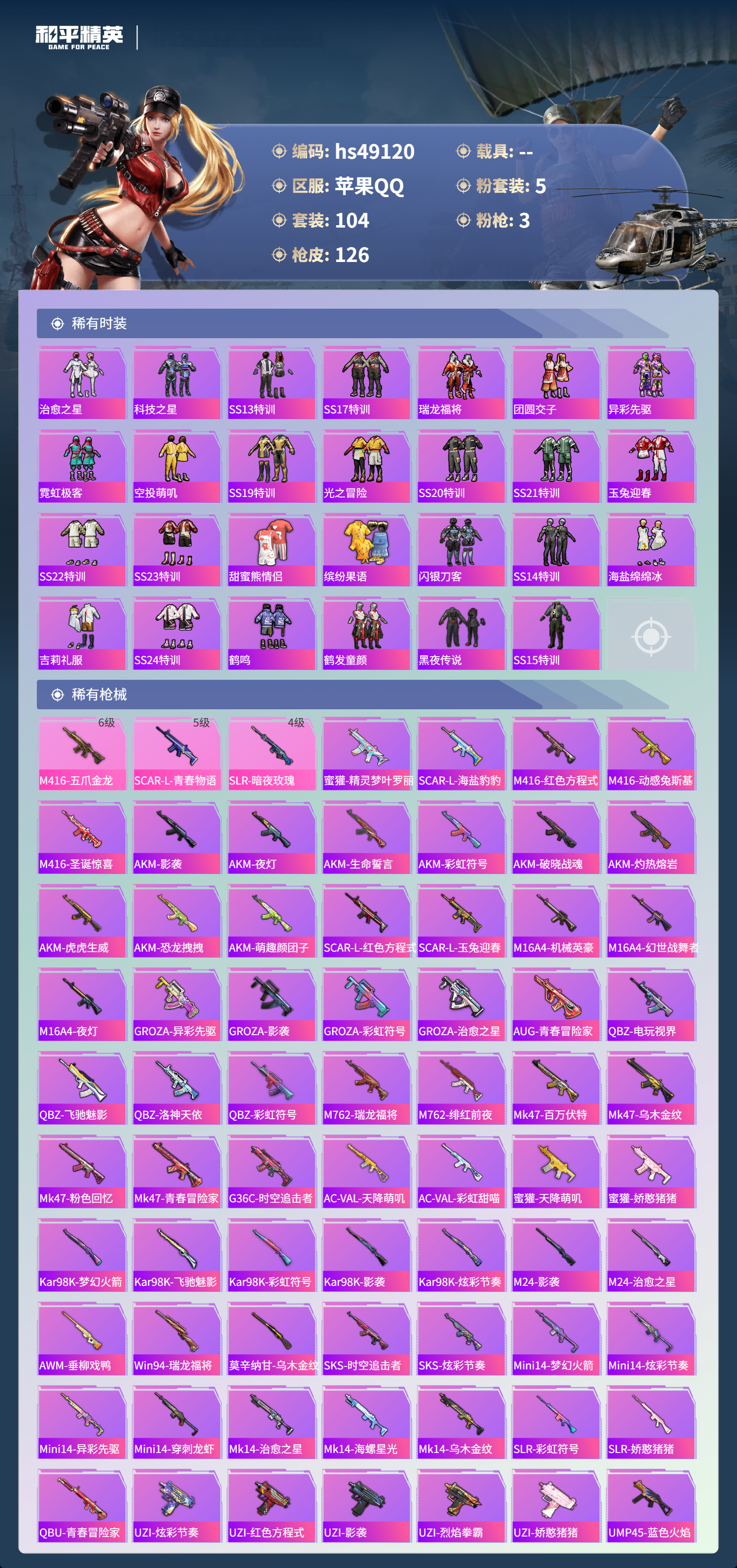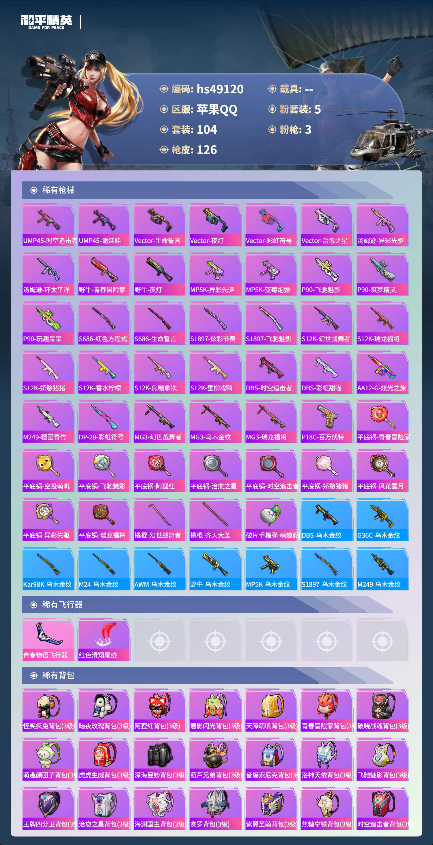 【10267】【可二次】【苹果QQ】恐龙拽拽 VSS-烈焰拳霸 M416-五爪金龙 漫步者 岚岚物语 M762-瑞龙福将 狂沙舞者 豚鼠丹丹 青春物语飞行器 海盐物语 烈焰拳霸 深海小丑鱼 瑞龙福将 SLR-暗夜玫瑰 浪漫天命 SCAR-L-青春物语 暗影哥特 雪山精英 激萌罗小黑 团圆交子