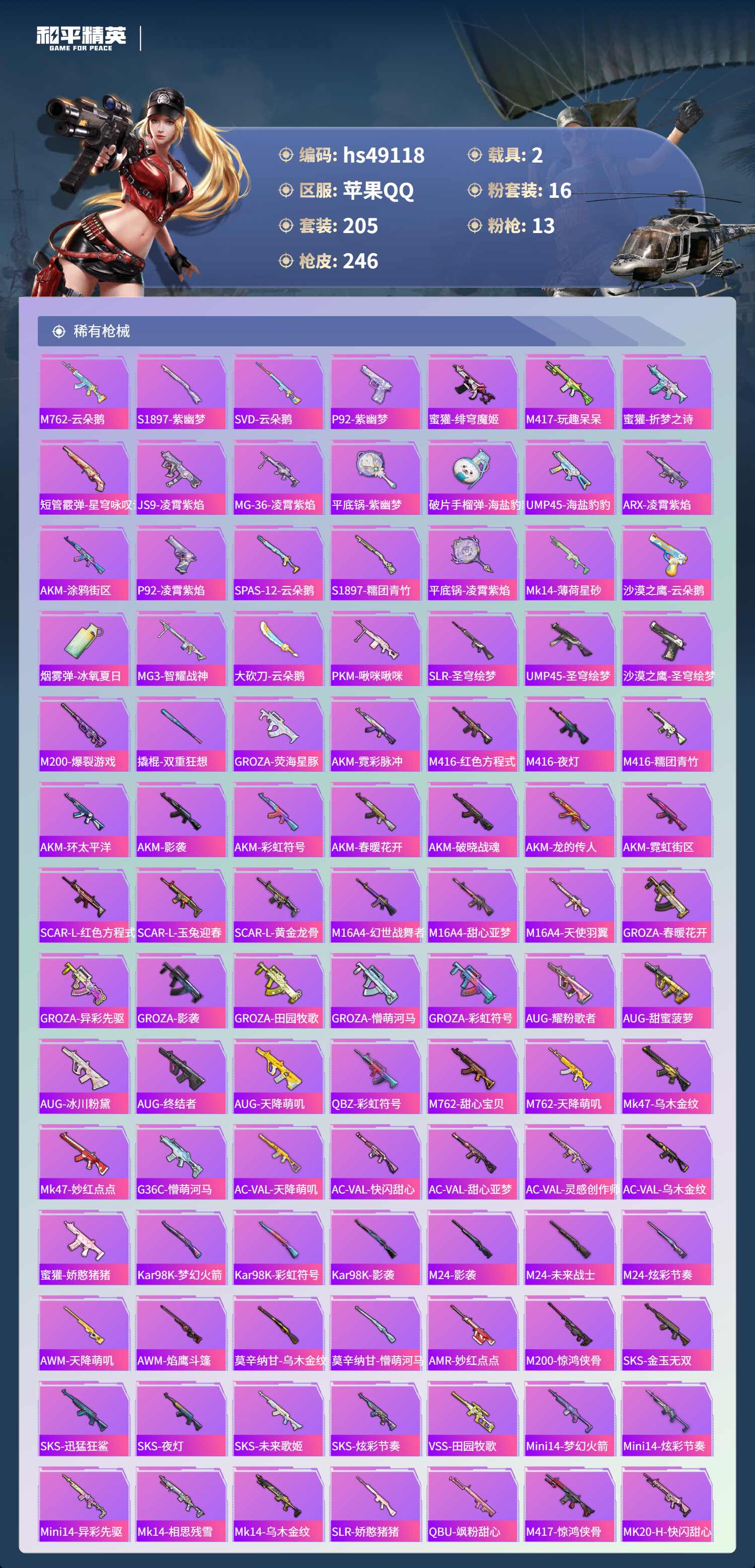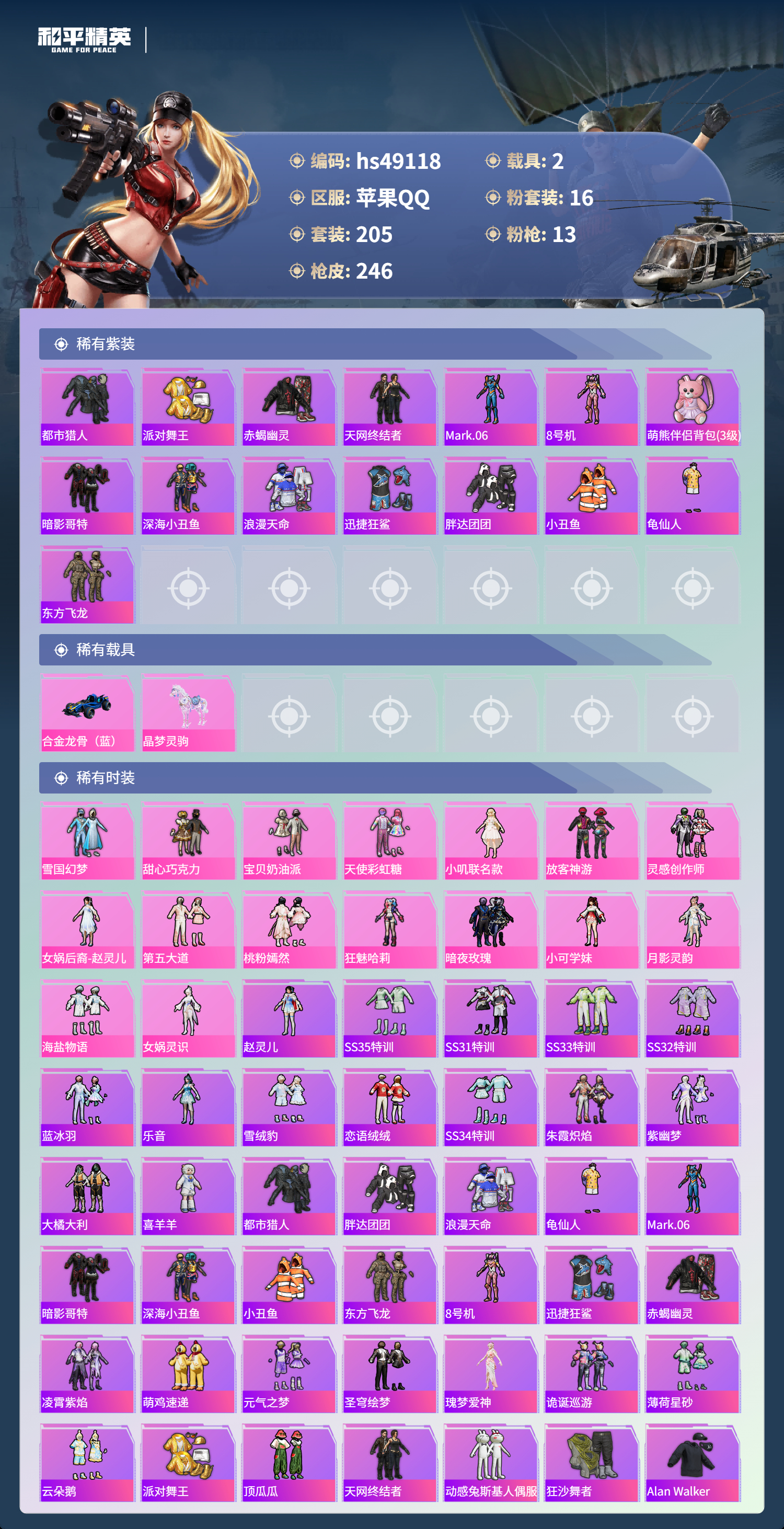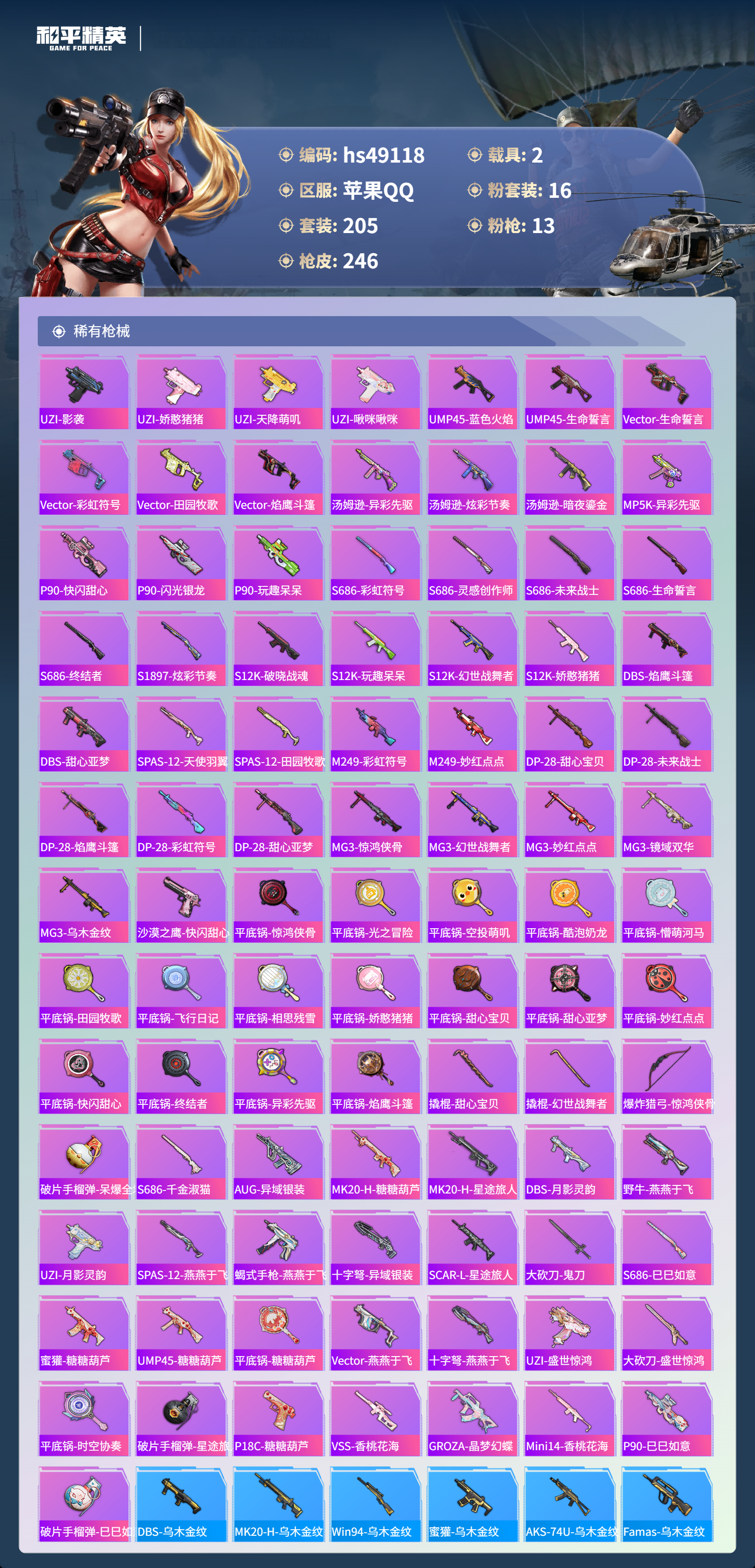 【10286】【不可二次】【苹果QQ】合金龙骨蓝色 龟仙人 AKM-绿萝繁花 水银刺客 雪国梦幻 漫步者 都市猎人 小叽联名款 东方飞龙 赤蝎幽灵 放客神游 M416-至情至圣 海盐物语 UMP45-量子极限 M416-心之恋语 深海小丑鱼 浪漫天命 梦幻火箭飞行器 胖达团团 纯白誓言 破片手榴弹-粉粉猫爪 SCAR-L-梦幻火箭 迅捷狂鲨 暗夜契约 SCAR-L梦幻火箭 甜心巧克力 狂沙舞者