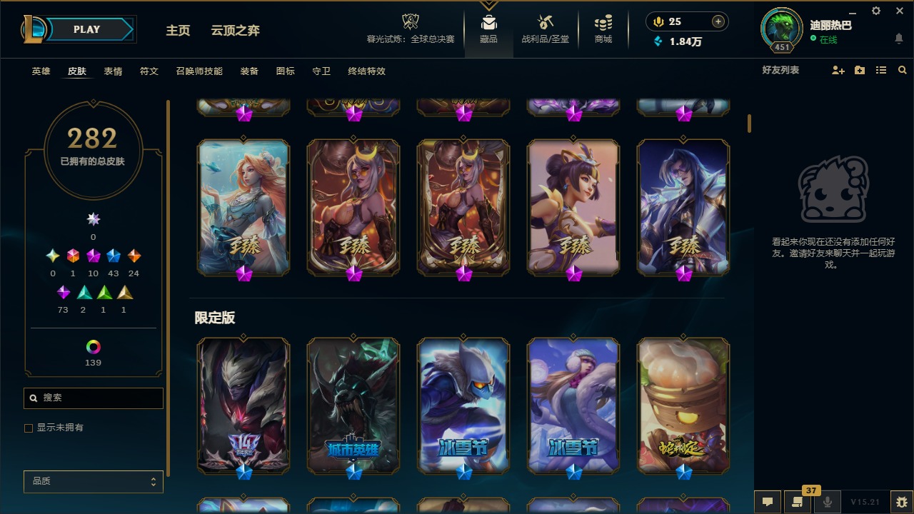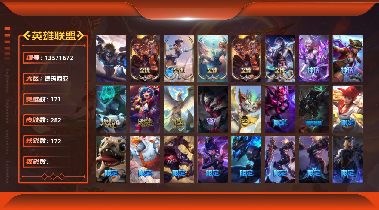 【10448】[13571672]1终极 10神话 43限定 24传说 73史诗 282皮肤 172炫彩 171英雄 可二次 可修改实名 【至臻】:至臻 烈焰美人 薇恩(2022),至臻 心之钢 永恩,至臻 烈焰美人 薇恩,至臻 青花瓷 拉克丝,至臻 海之歌 萨勒芬妮,水晶圣骑 蕾欧娜【限定】:玉剑传说 舞龙卫【情人节限定】:觅心游侠 卢锡安,甜心宝贝 娑娜,幽梦玫瑰 辛德拉【赛季限定皮】:胜利