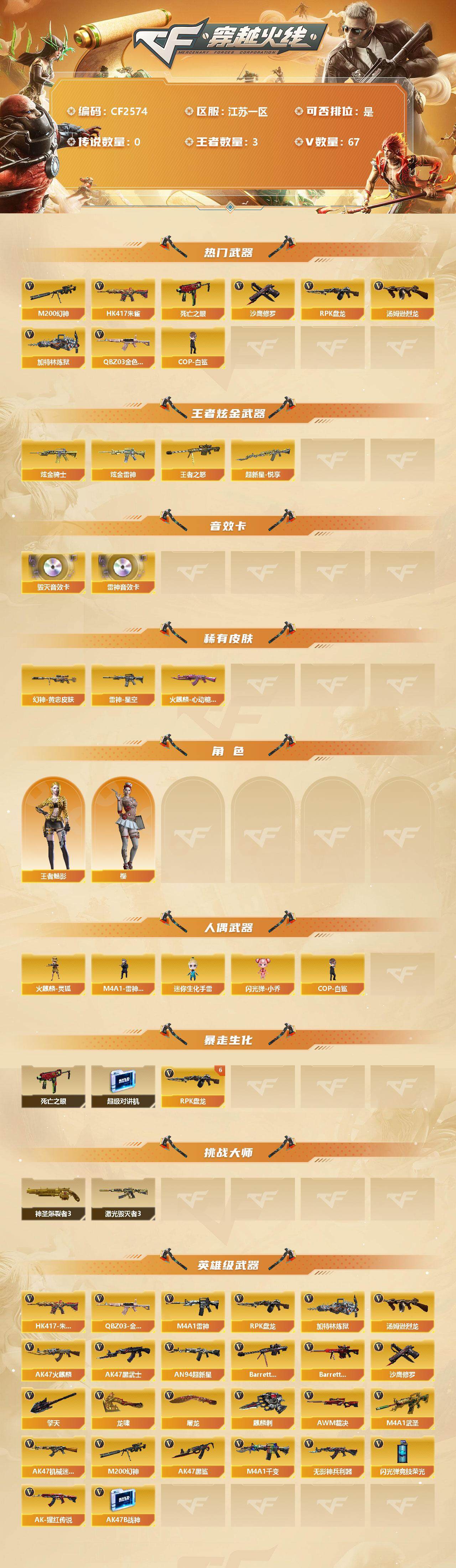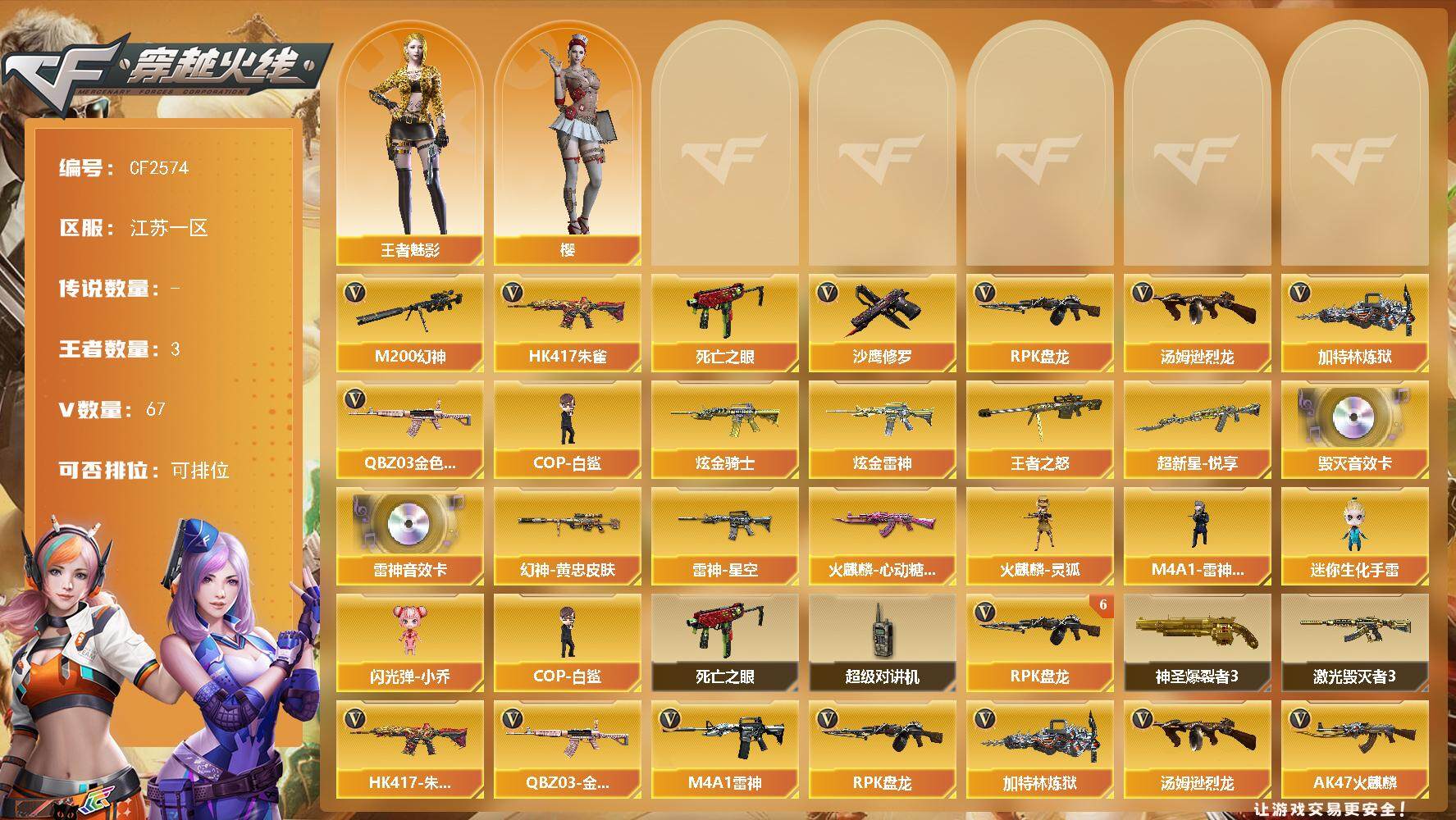 【10754】【10754】【CF2574】【商品标题】:江苏一区-67V-3王者-4炫金【幻神1皮】【死亡之眼】【6盘龙】【M200-幻神】【M200-幻神