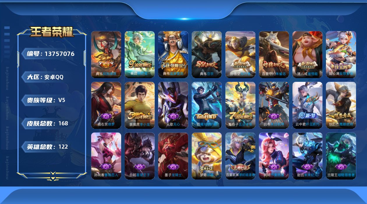 [13757076]【金标典韦】贵族等级: V5 英雄数: 122 皮肤数: 168 传说皮: 典韦战鼓燎原 限定皮: 李小龙,岱宗,朱雀志,高山流水,孙行者,猪悟能,五谷丰年,鸣野蒿