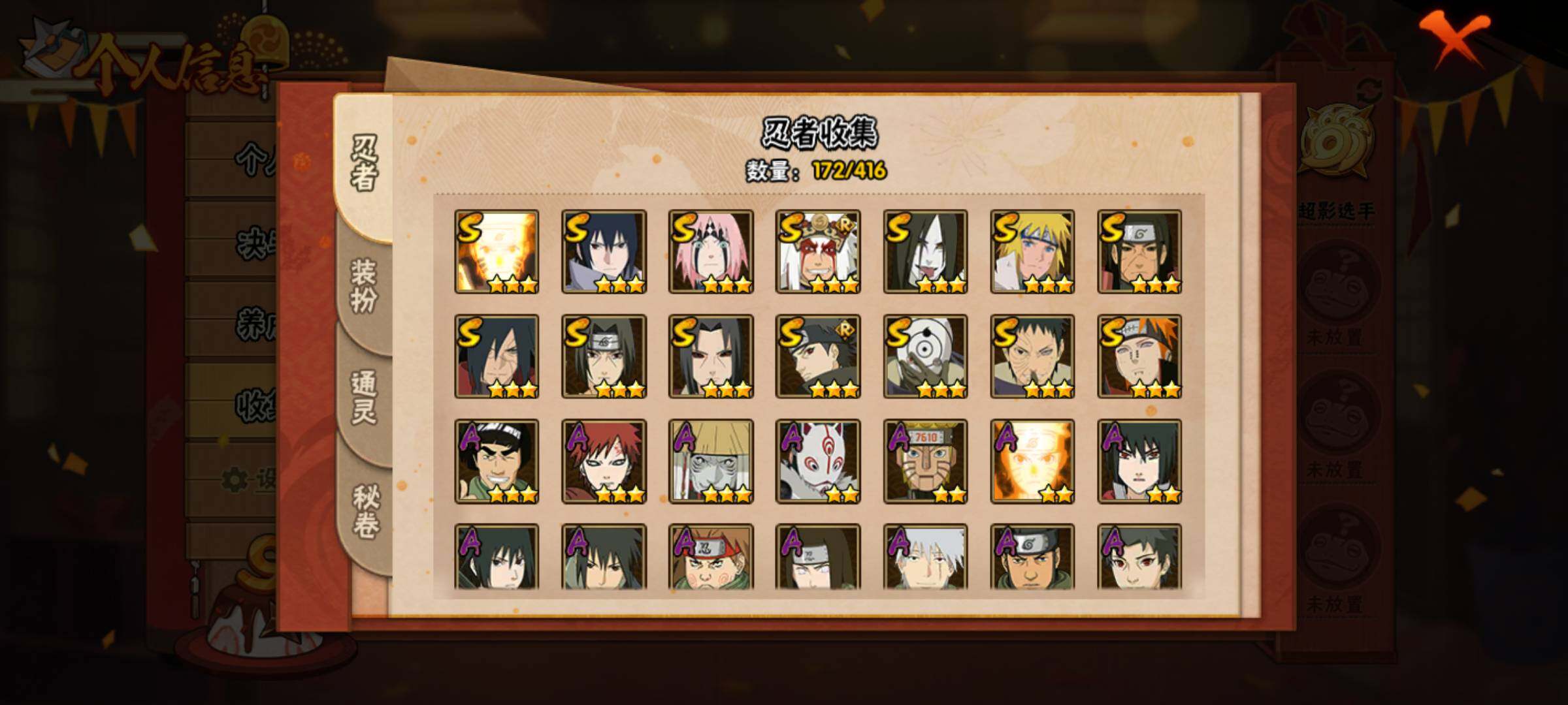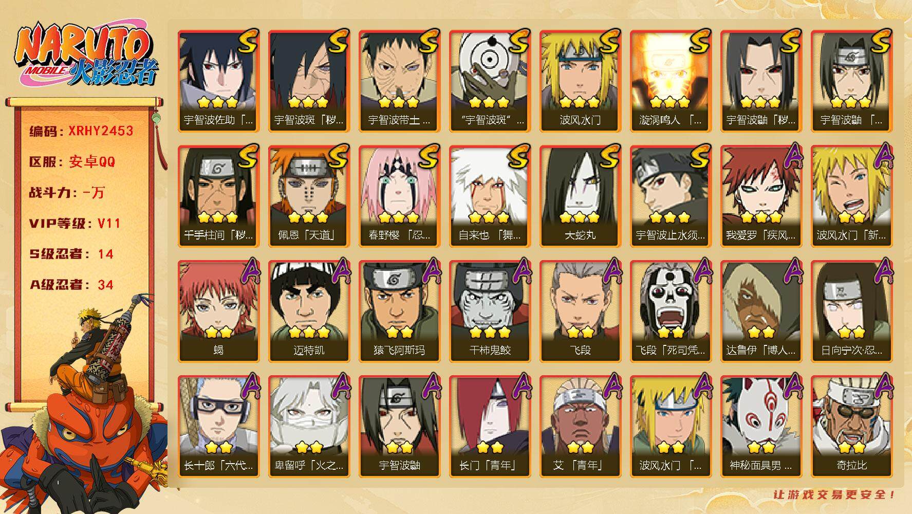 [14117364]Xr45423-安q-无二次-14S级忍者数-34A级忍者数 【S级忍者】:千手柱间「秽土转生」(3星),宇智波鼬「秽土转生」(3星),宇智波斑「秽土转生·解」(3星),春野樱「忍界大战」(3星),宇智波带土「忍界大战」(3星),宇智波鼬「须佐能乎」(3星),宇智波止水「须佐能乎」(3星),自来也「舞之豪杰」(3星),大蛇丸(3星...