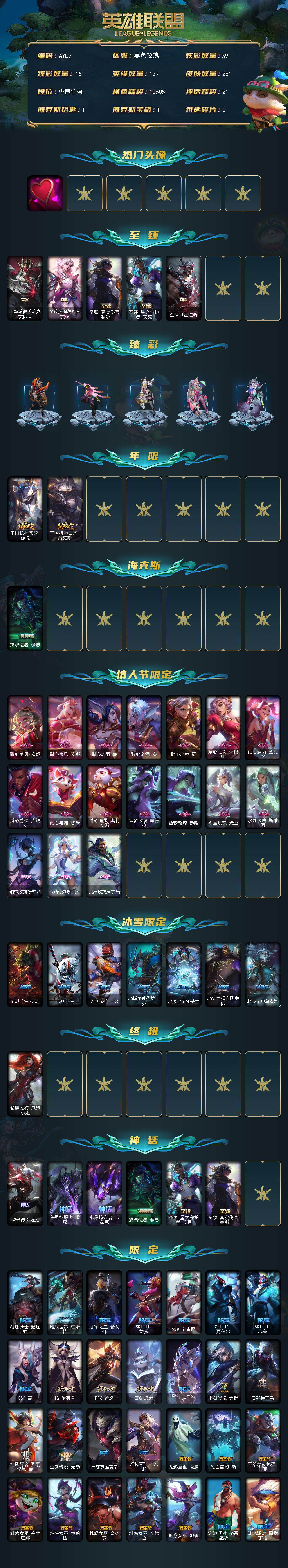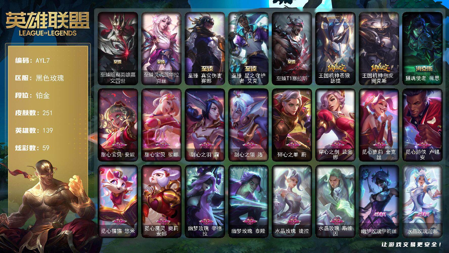 可二次【店主推荐捡漏号!可直接换绑】铂金段位-139英雄-251皮肤-59炫彩-1终极-9神话-65限定-30传说-20史诗 【热门头像】:爱意绵绵头像 【至臻皮肤】:至臻暗裔英雄嘉文四世,至臻灵魂莲华拉克丝,至臻真实伤害赛娜,至臻星之守护者艾克,至臻T1塞拉斯 【臻彩皮肤】:巅峰之拳瑟提明镜止水,玉剑传说无影竞星,咖啡甜心金...