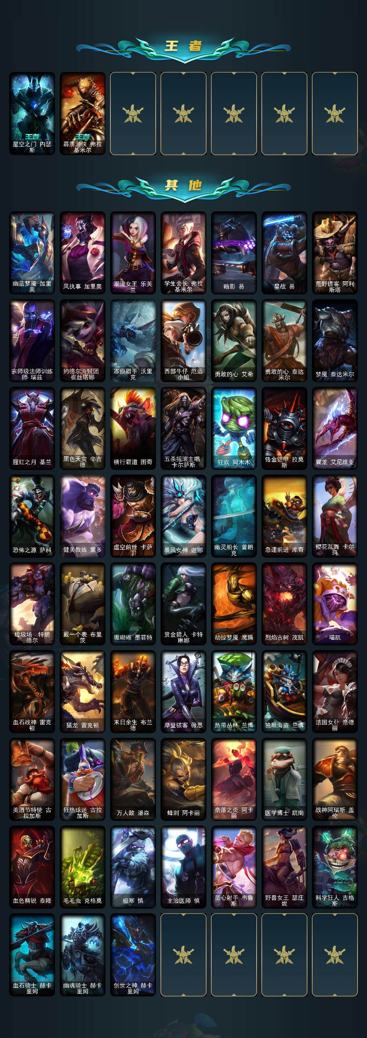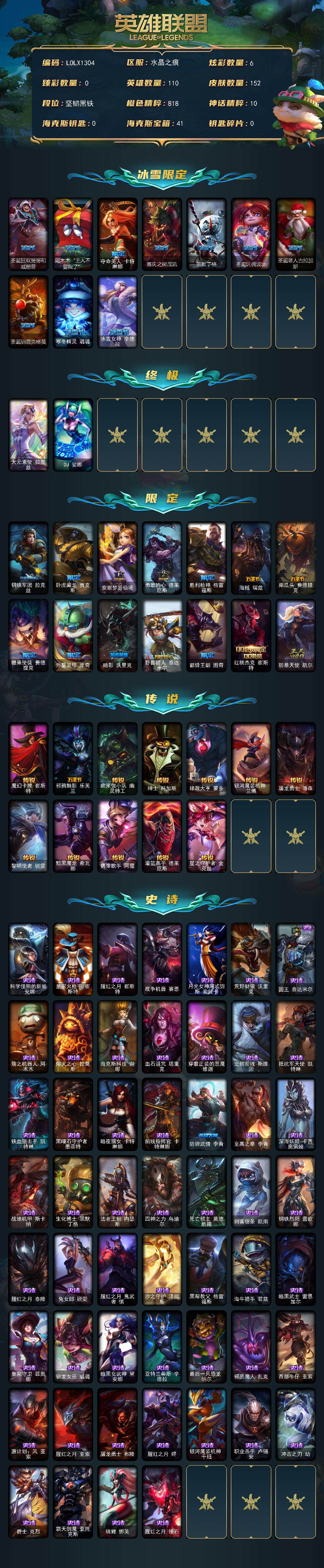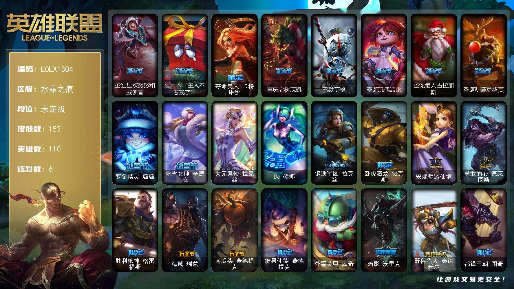 【72346】【LOLX1304】110英雄/152皮肤/2终极/24限定/6炫彩/12传说/53史诗/未定级/圣诞狂欢努努和威朗普/阿木木:“主人不要我了”/夺命美人卡特琳娜/喜庆之树茂凯/雪默丁格/圣诞玩偶波比/圣诞老人古拉加斯/圣诞驯鹿克格莫/寒冬精灵璐璐/冰雪女神辛德拉/大元素使拉克丝/DJ娑娜/钢铁军团拉克丝/卧虎藏龙贾克斯/安妮梦游仙境/勇敢的心德莱厄斯/胜利枪神格雷福斯/海贼瑞兹/