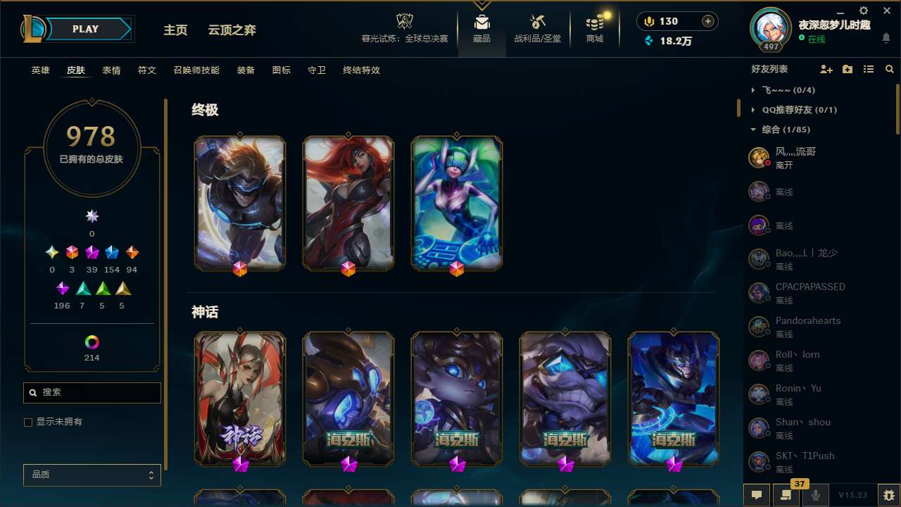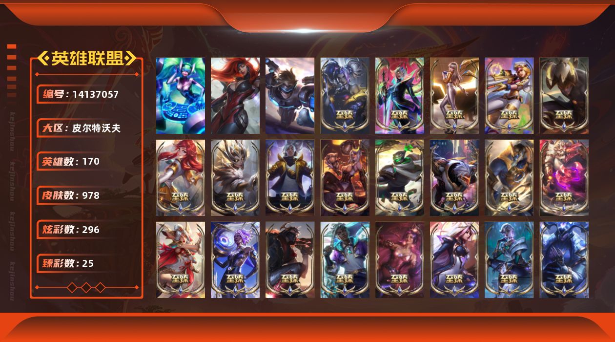 【73809】[14137057]t31225【皮尔特沃夫】978皮肤 296炫彩 25臻彩 39神话/154限定/94传说/170英雄 账号等级:497【重要头像】爱意绵绵 爱情之歌 心型钥匙 泳池派对凯特琳 救生圈 魄罗宇航员 星守金克丝炫彩 幼犬内瑟斯 幼犬沃里克 披萨鸡 战斗学院伊泽瑞尔神话炫彩 不错哦 至臻月蚀骑士赛娜 至臻魔女婕拉 灌篮高手诺手炫彩头 【