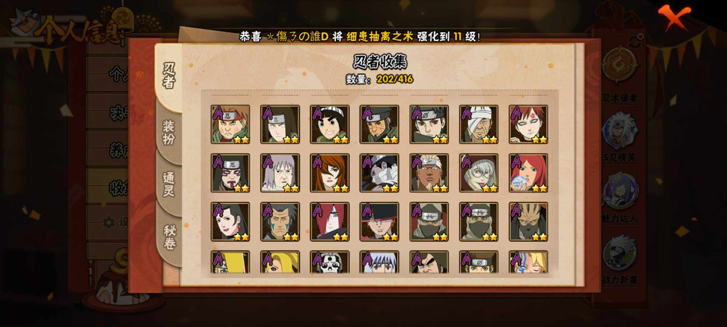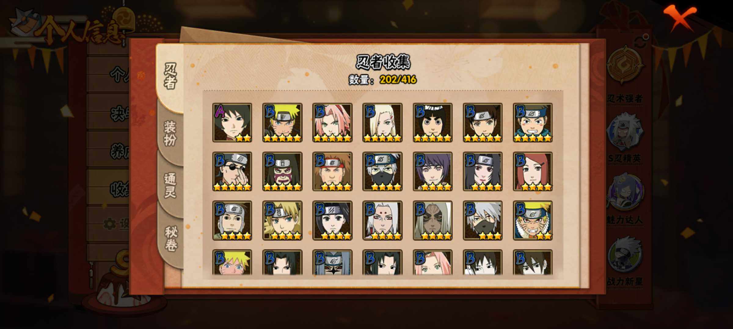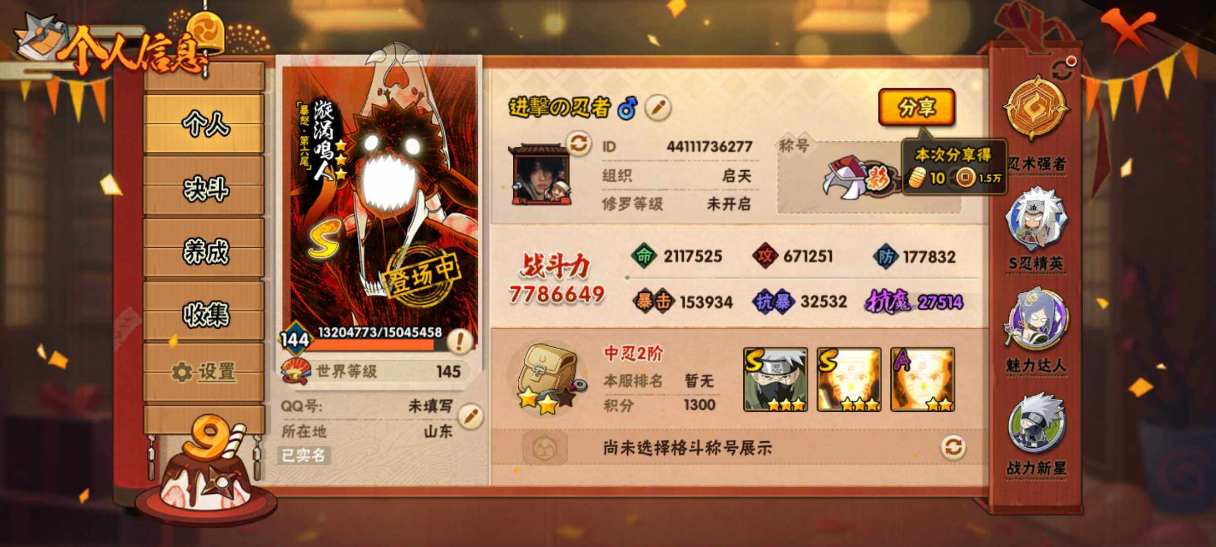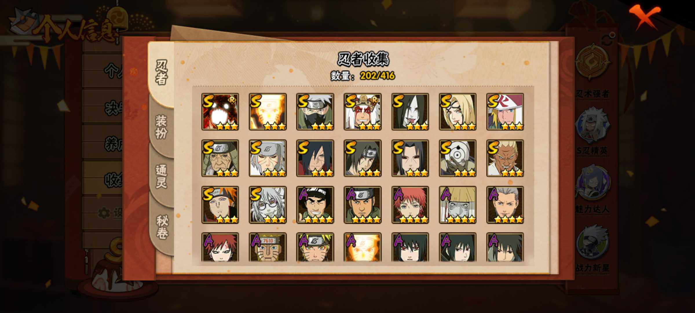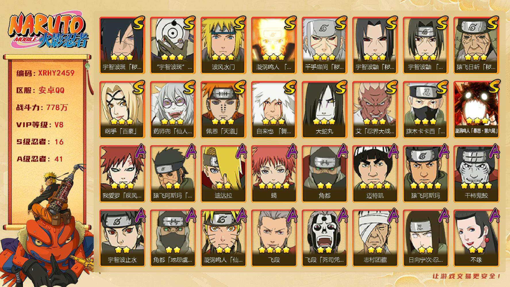 [14163718]Xr44548-可修改-16S级忍者数-41A级忍者数 【S级忍者】:猿飞日斩「秽土转生」(3星),千手扉间「秽土转生」(3星),宇智波鼬「秽土转生」(3星),宇智波斑「秽土转生·解」(3星),艾「忍界大战」(3星),宇智波鼬「须佐能乎」(3星),旗木卡卡西「须佐能乎」(3星),自来也「舞之豪杰」(3星),大蛇丸(3星),纲手「百...