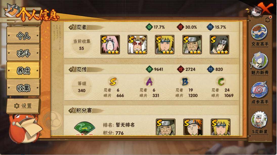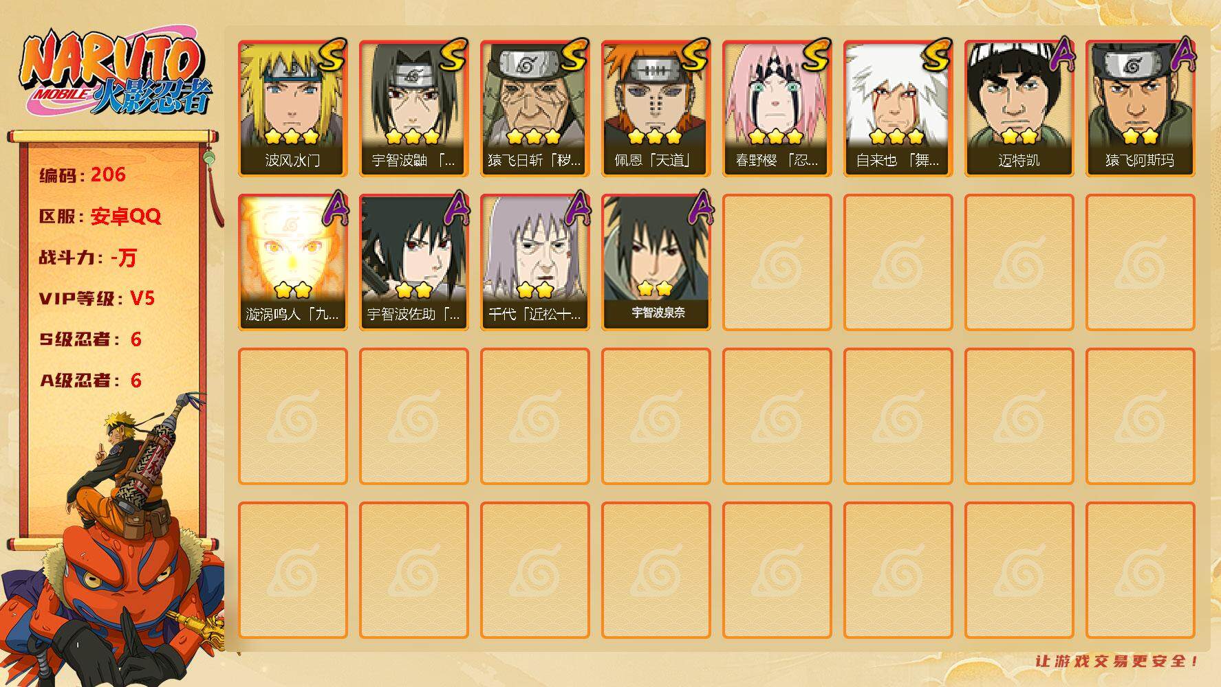 [10523793]【商品标题】:6S级忍者数-6A级忍者数 【S级忍者】:猿飞日斩「秽土转生」(3星),春野樱「忍界大战」(3星),宇智波鼬「须佐能乎」(3星),自来也「舞之豪杰」(3星),波风水门(3星),佩恩「天道」(3星) 【A级忍者】:漩涡鸣人「九尾查克拉」(2星),迈特凯(2星),猿飞阿斯玛(2星),宇智波佐助「须佐能乎」(2星),...