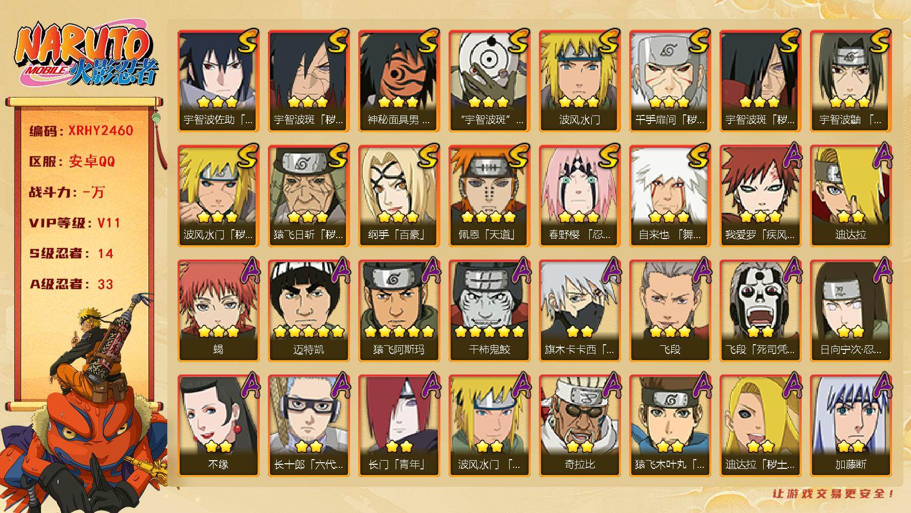 [14208247]Xr45656-苹果q区-无二次 14S级忍者数-33A级忍者数 【S级忍者】:猿飞日斩「秽土转生」(3星),波风水门「秽土转生」(3星),千手扉间「秽土转生」(3星),宇智波斑「秽土转生」(3星),宇智波斑「秽土转生·解」(3星),春野樱「忍界大战」(3星),宇智波鼬「须佐能乎」(3星),自来也「舞之豪杰」(3星),纲手「百豪...