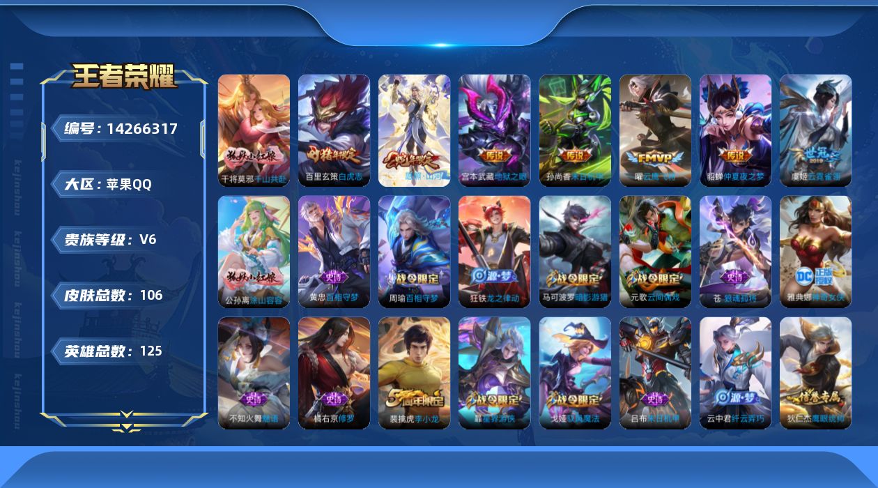 【95660】【可二次】【QQ(苹果)】幻想奇妙夜 科学大爆炸 星界游侠 鹰眼统帅 虎啸剑宗 地狱之眼 原初探秘者 街头霸王 野性能量 沙漠行僧 海之征途 仲夏夜之梦 死亡骑士 天狼运算者 精灵王 万华元夜 茶境仙 东方不败 异域舞娘 威尼斯狂欢 修罗 超能战警 狂想玩偶喵 特工魅影 金属风暴 醍醐杖 少女阿狸 德古拉伯爵 逆浪荇歌 赵云 鬼剑武藏 阴阳师 云霓雀翎 踏雪寻梅 谧流熔炉 探海日记