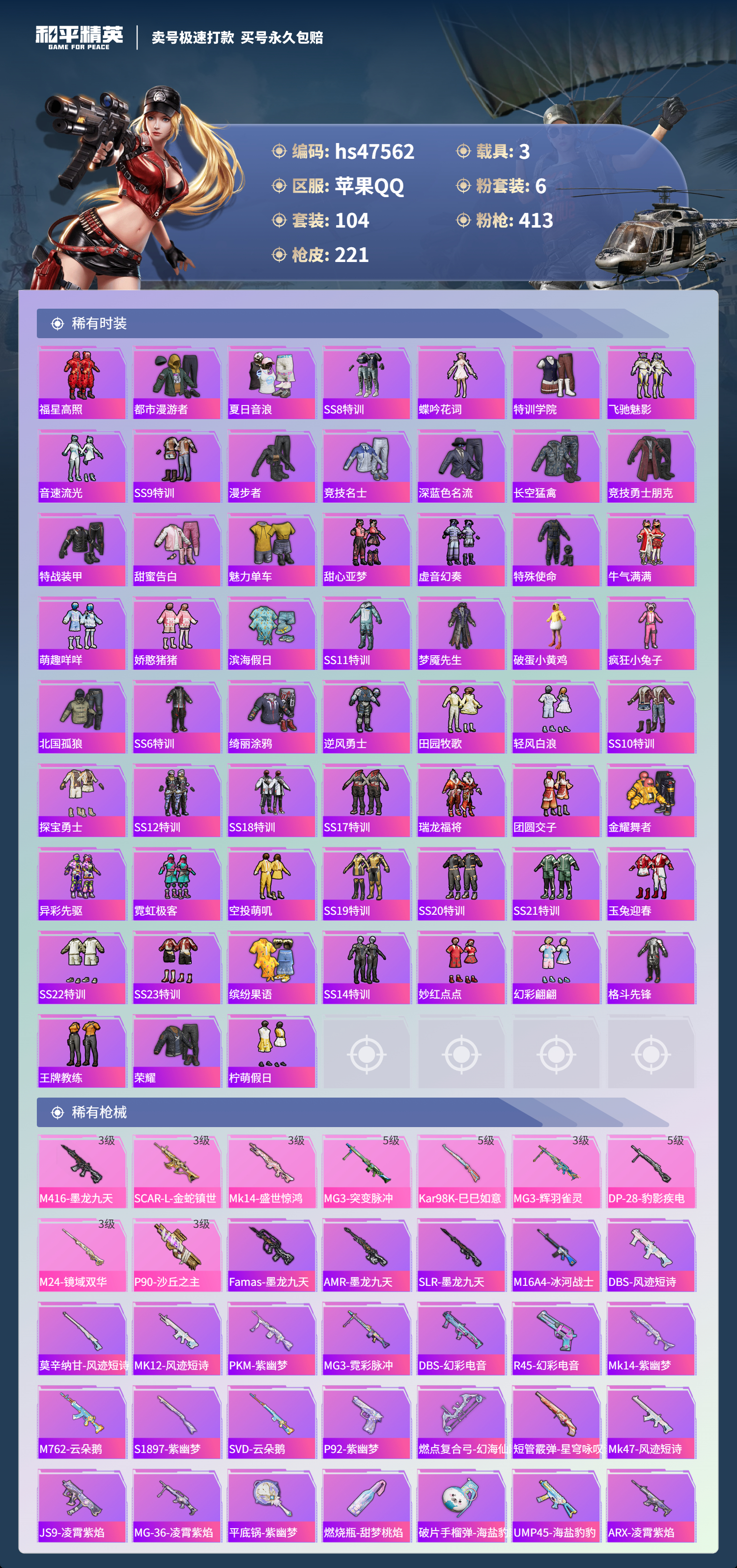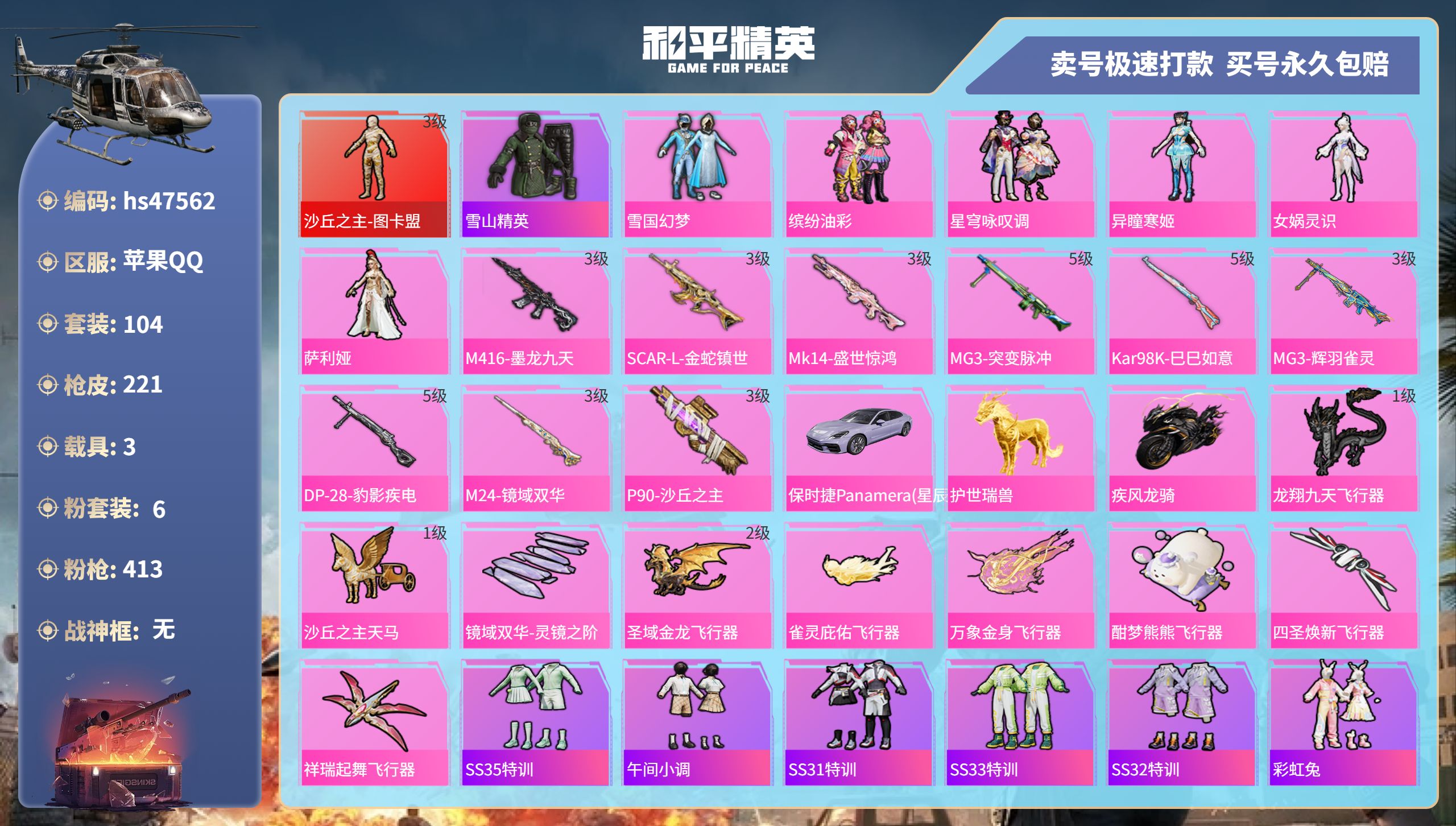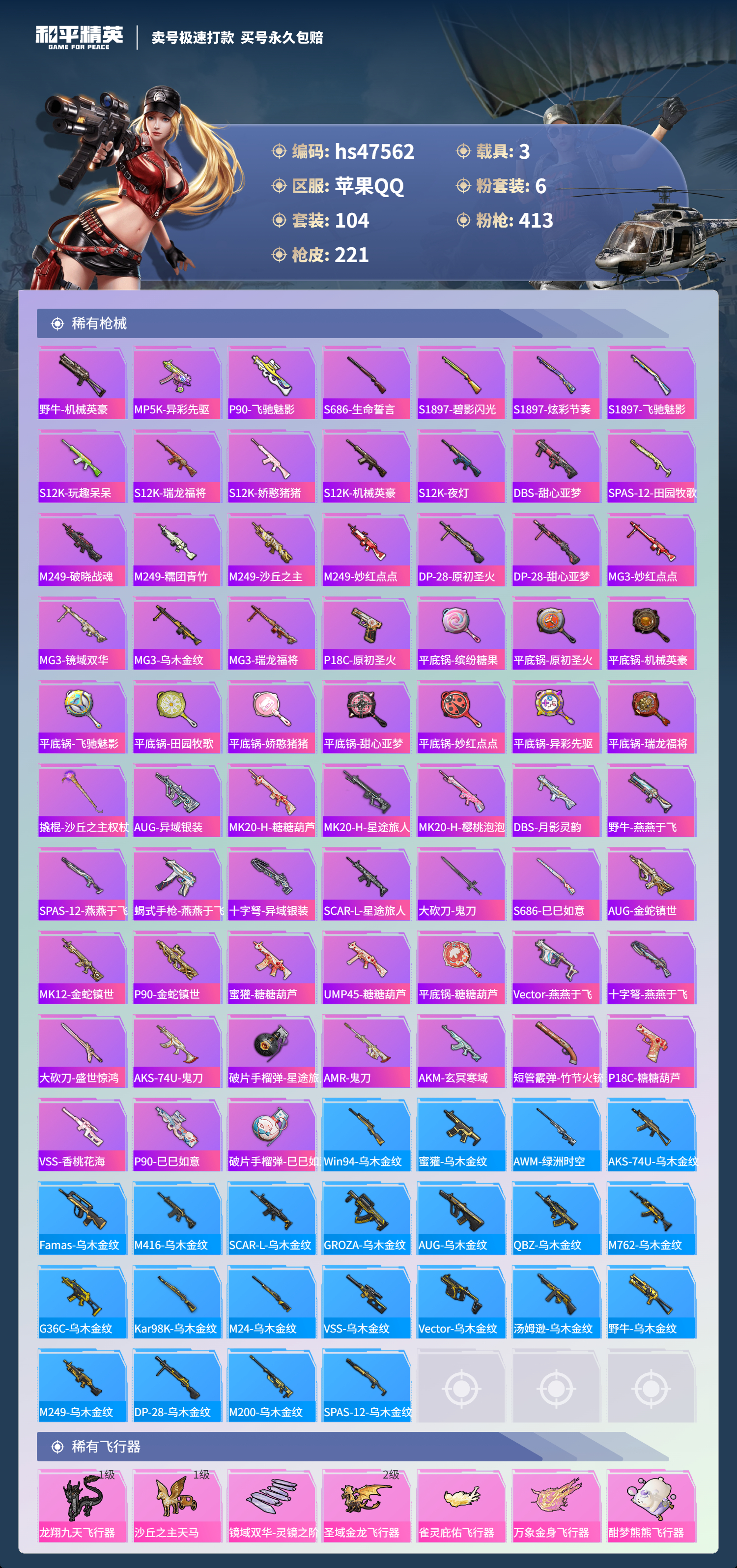 【95773】【不可二次】【苹果QQ】M24-镜域双华 MG3-突变脉冲 雪国梦幻 漫步者 P90-沙丘之主 M762-瑞龙福将 机械英豪 龙翔九天飞行器 M416-墨龙九天 沙丘之主-图卡盟 雪国幻梦 四圣焕新飞行器 缤纷油彩 瑞龙福将 雪山精英 团圆交子 疾风龙骑