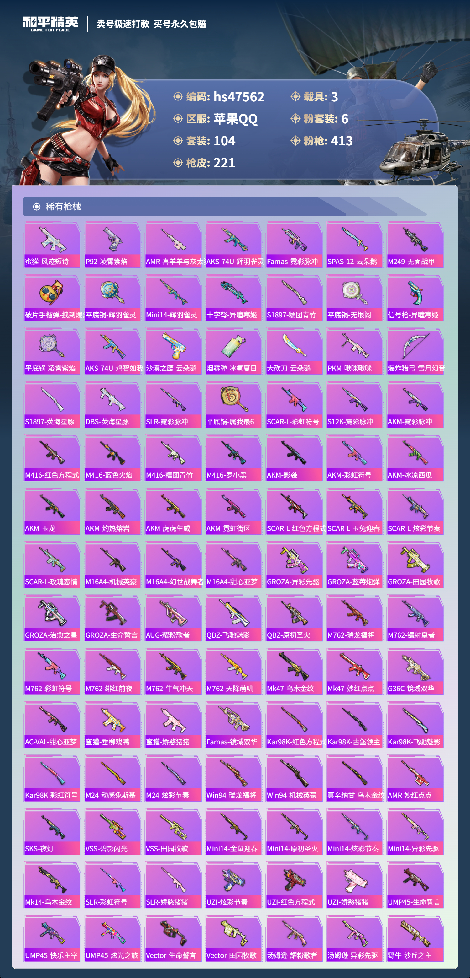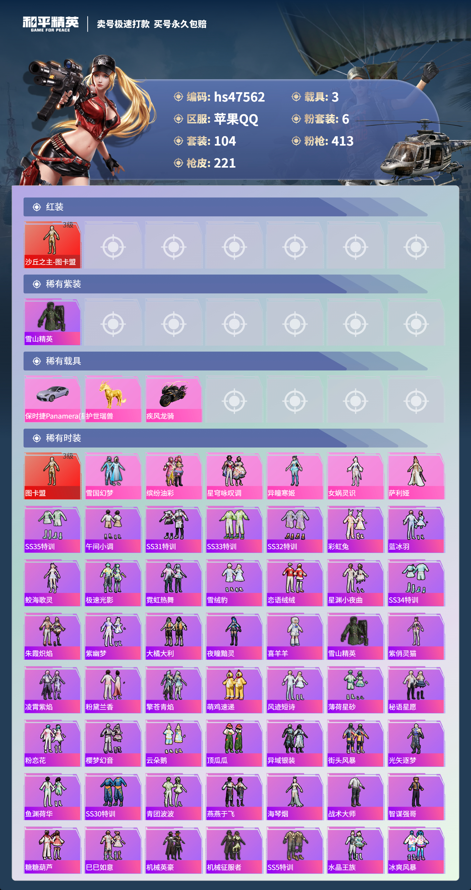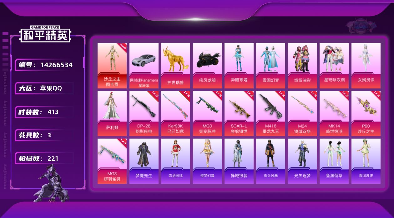【95773】【不可二次】【苹果QQ】M24-镜域双华 MG3-突变脉冲 雪国梦幻 漫步者 P90-沙丘之主 M762-瑞龙福将 机械英豪 龙翔九天飞行器 M416-墨龙九天 沙丘之主-图卡盟 雪国幻梦 四圣焕新飞行器 缤纷油彩 瑞龙福将 雪山精英 团圆交子 疾风龙骑