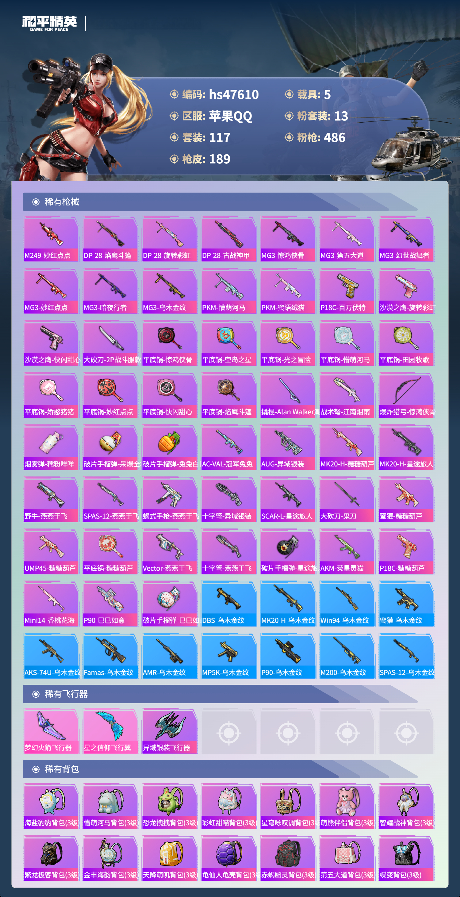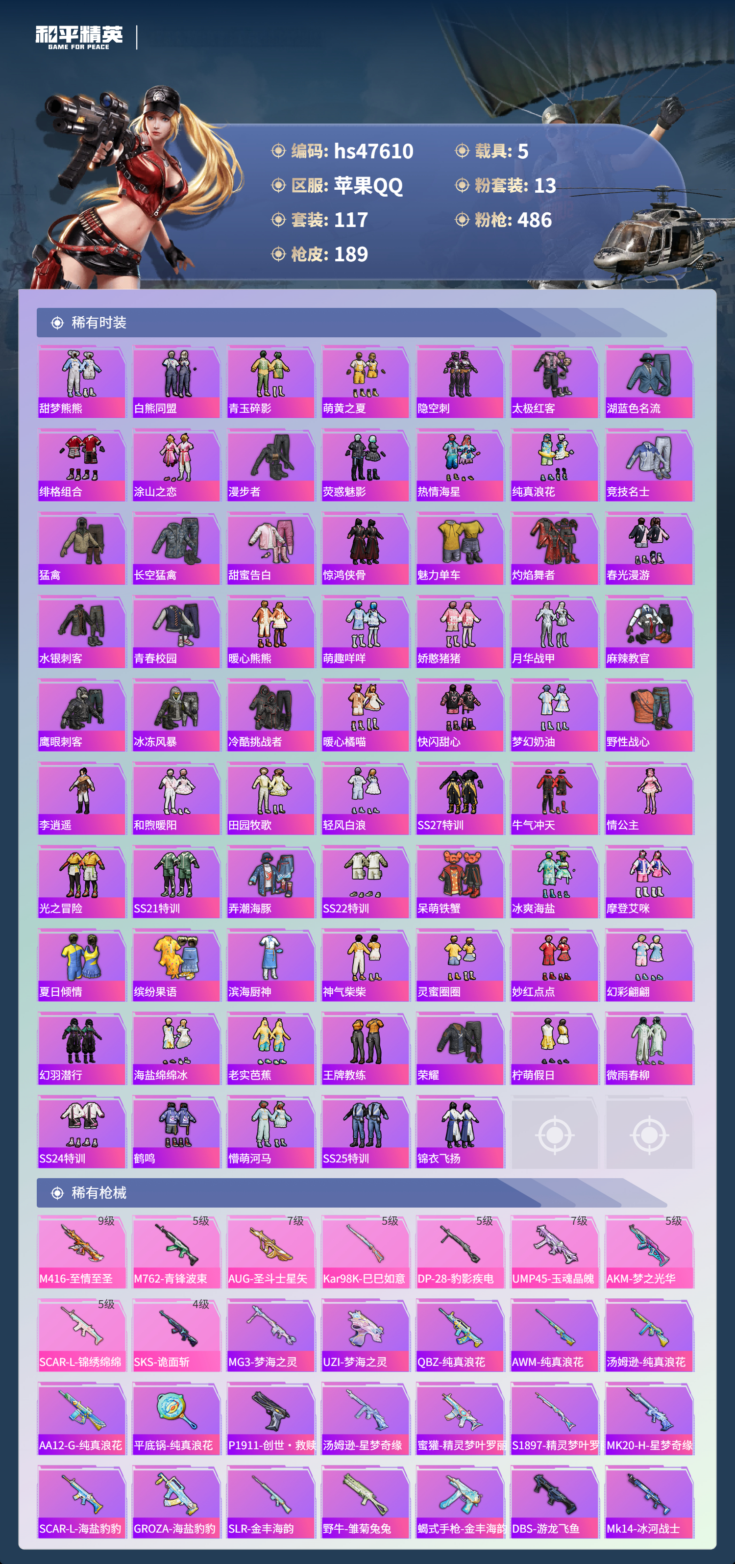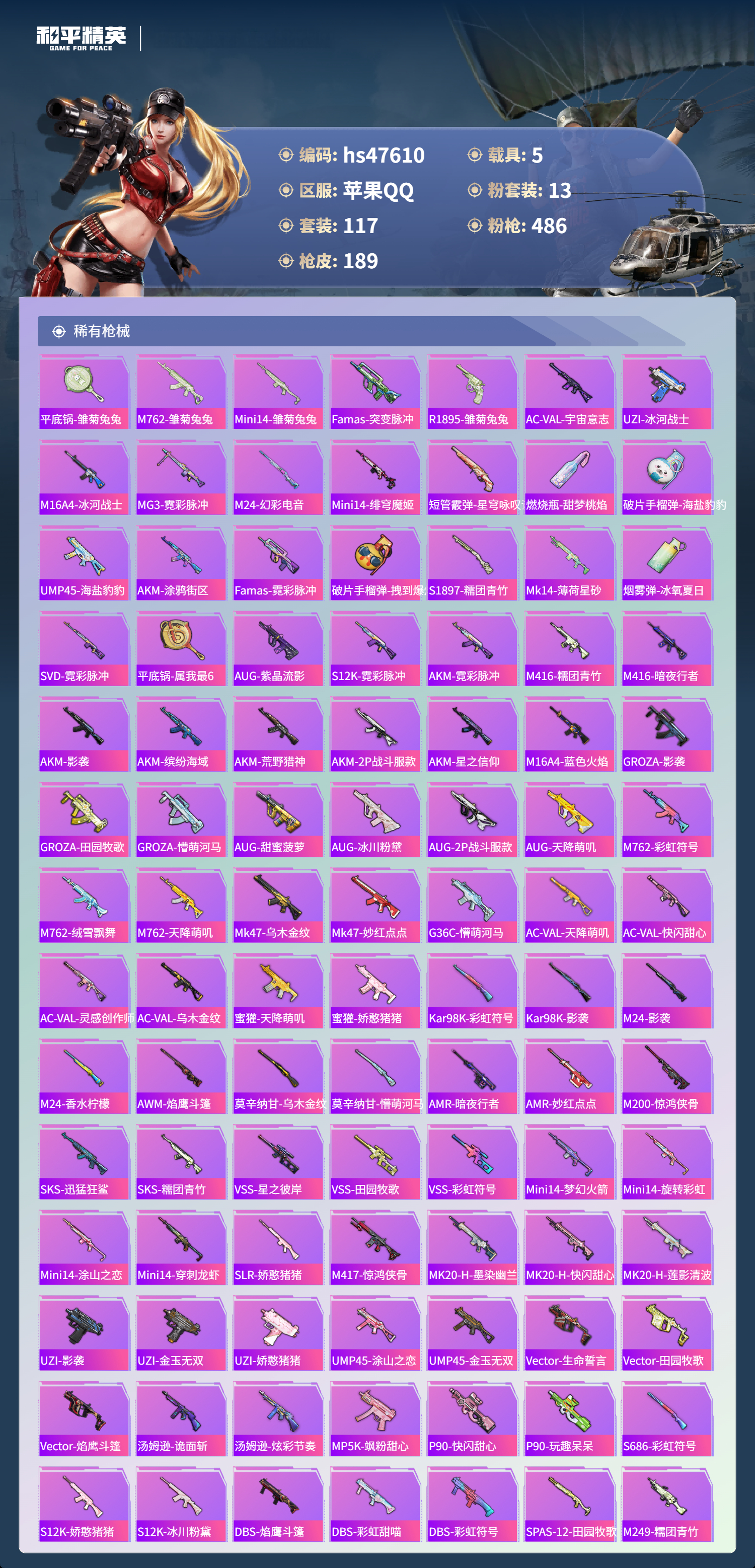 【95778】【不可二次】【苹果QQ】龟仙人 水银刺客 M762-青锋波束 漫步者 花间之火 都市猎人 东方飞龙 极限特训 赤蝎幽灵 放客神游 M416-至情至圣 深海小丑鱼 M24-香水柠檬 激萌小黄鸭 浪漫天命 梦幻火箭飞行器 星梦玉骢 合金龙骨红色 迅捷狂鲨 UMP45-玉魂晶魄 潮萌小黄鸭 相思残雪 SKS-诡面斩 SCAR-L-锦绣绵绵 梦幻火箭 AKM-梦之光华 AKM-缤纷海域 幻