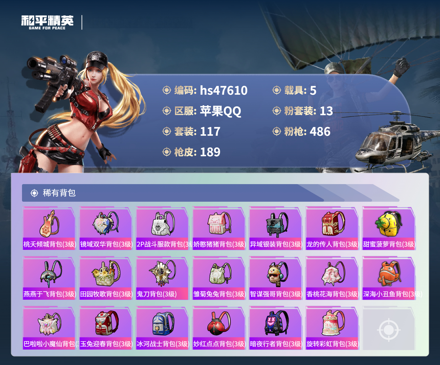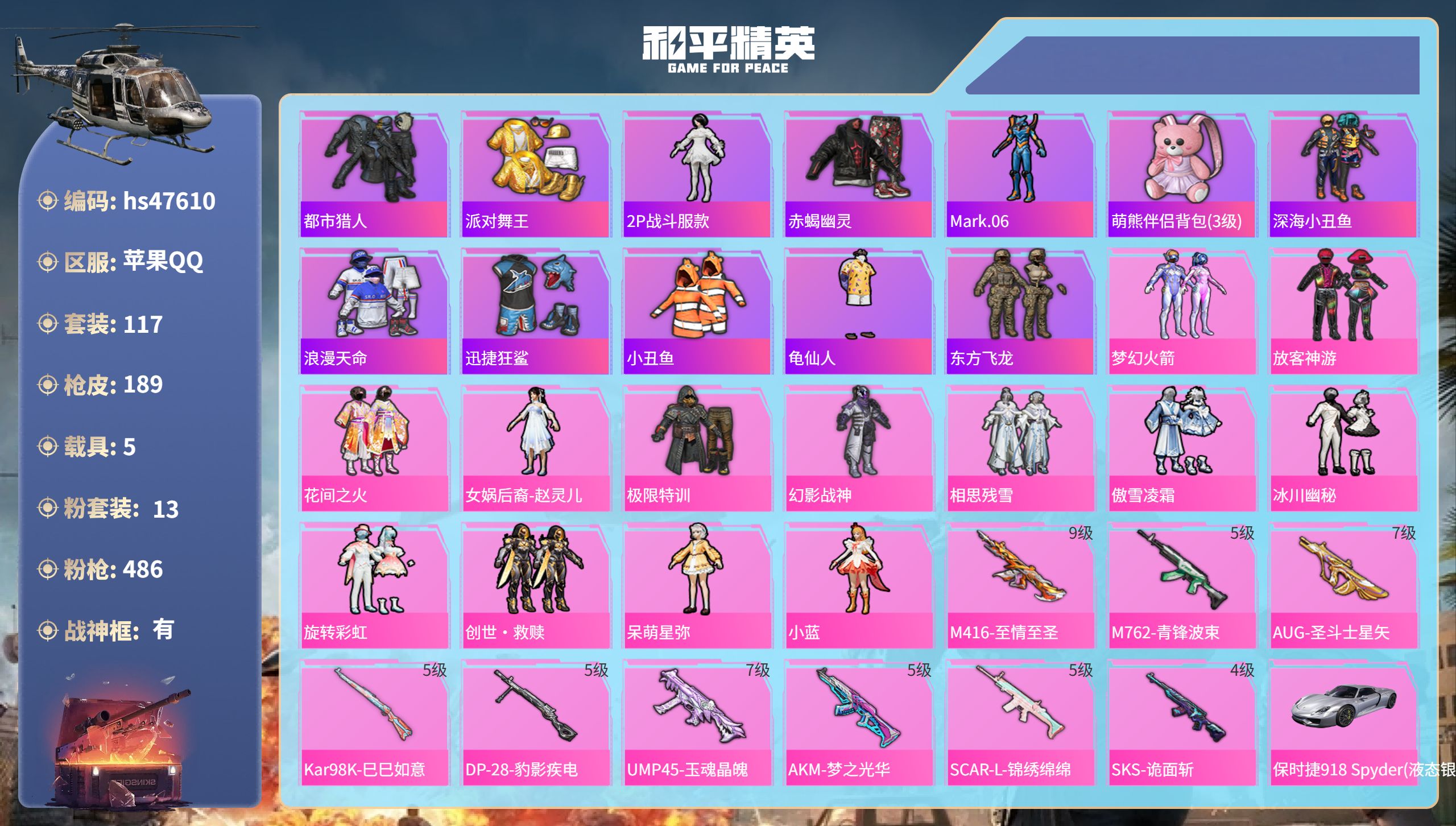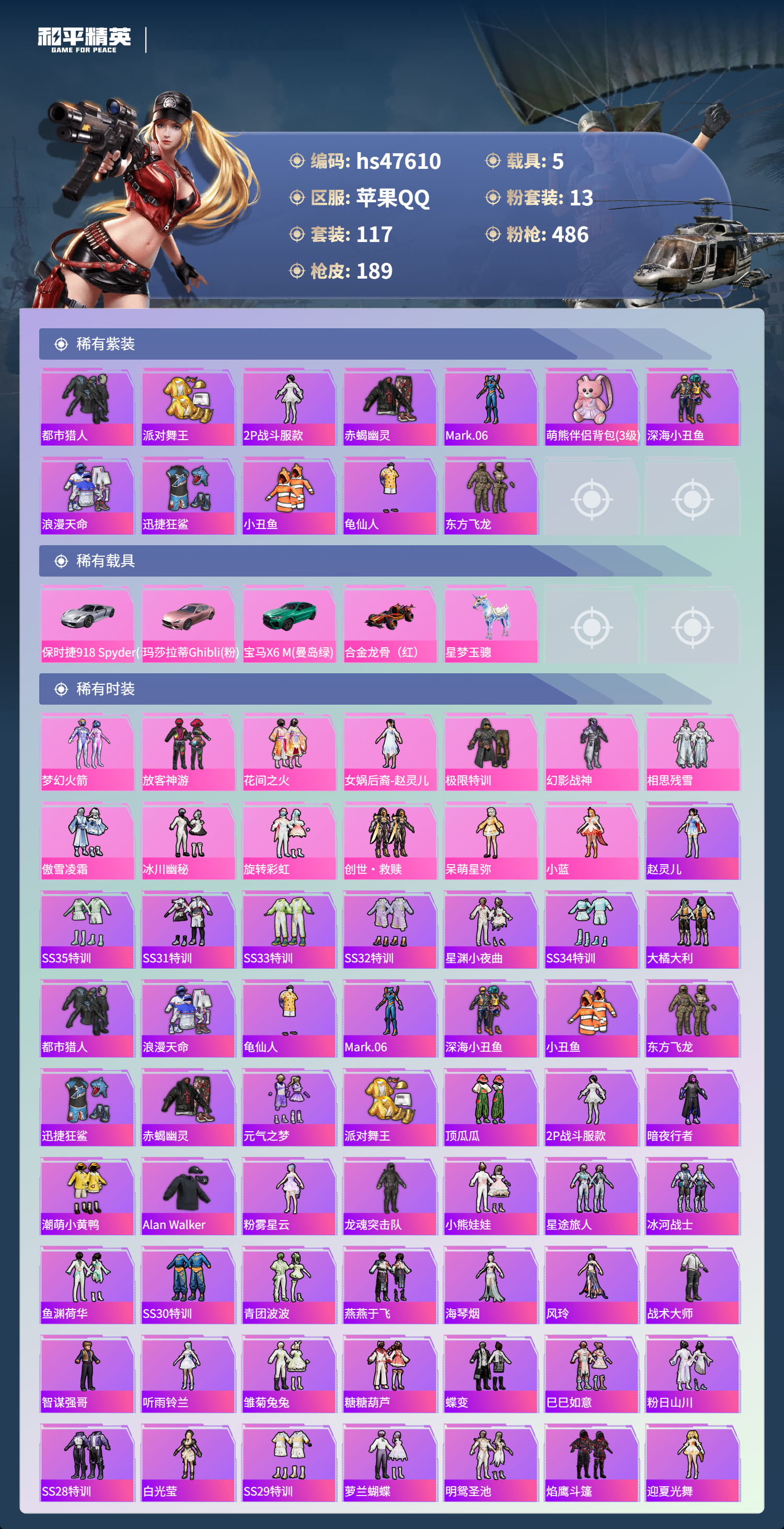 【95778】【不可二次】【苹果QQ】龟仙人 水银刺客 M762-青锋波束 漫步者 花间之火 都市猎人 东方飞龙 极限特训 赤蝎幽灵 放客神游 M416-至情至圣 深海小丑鱼 M24-香水柠檬 激萌小黄鸭 浪漫天命 梦幻火箭飞行器 星梦玉骢 合金龙骨红色 迅捷狂鲨 UMP45-玉魂晶魄 潮萌小黄鸭 相思残雪 SKS-诡面斩 SCAR-L-锦绣绵绵 梦幻火箭 AKM-梦之光华 AKM-缤纷海域 幻