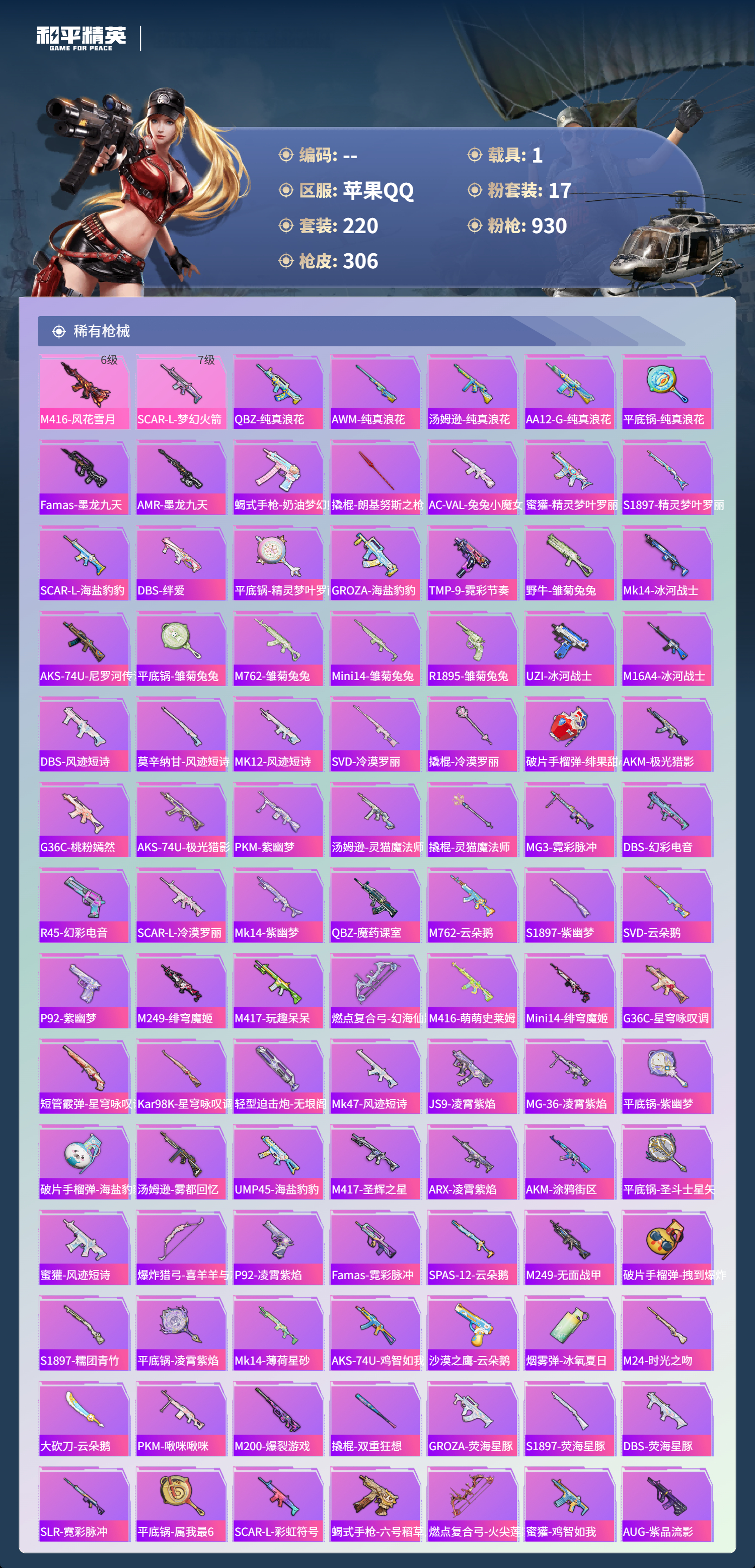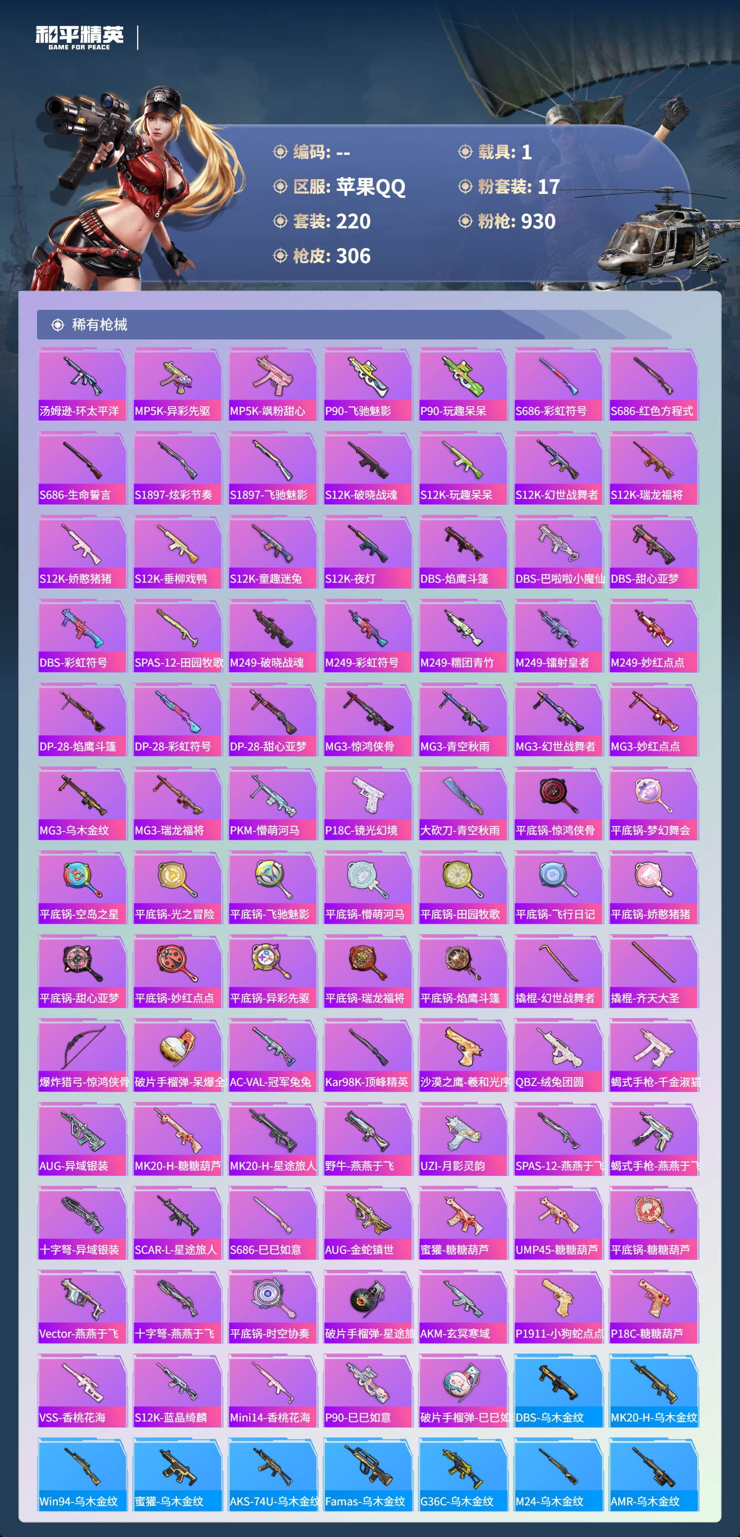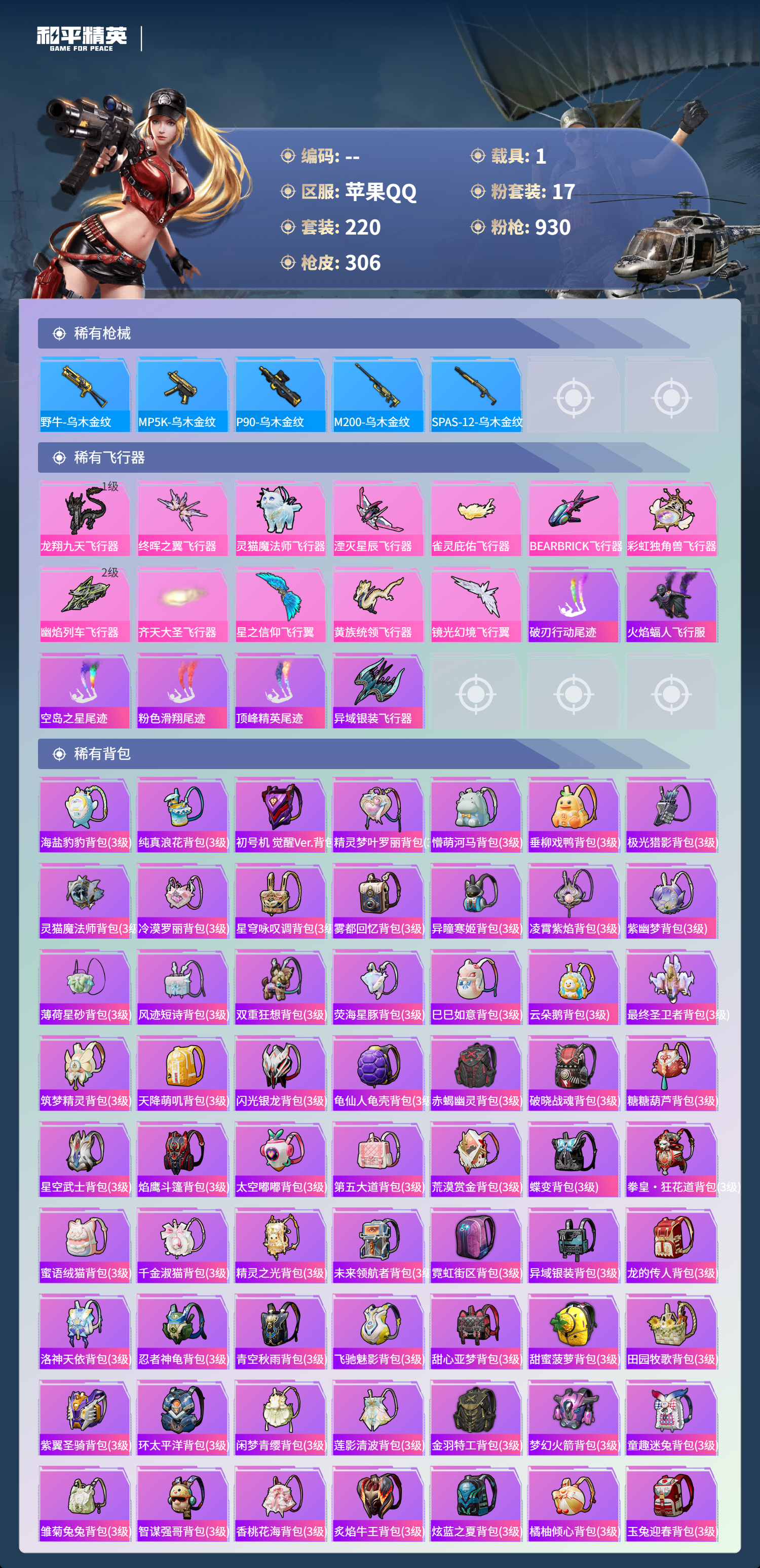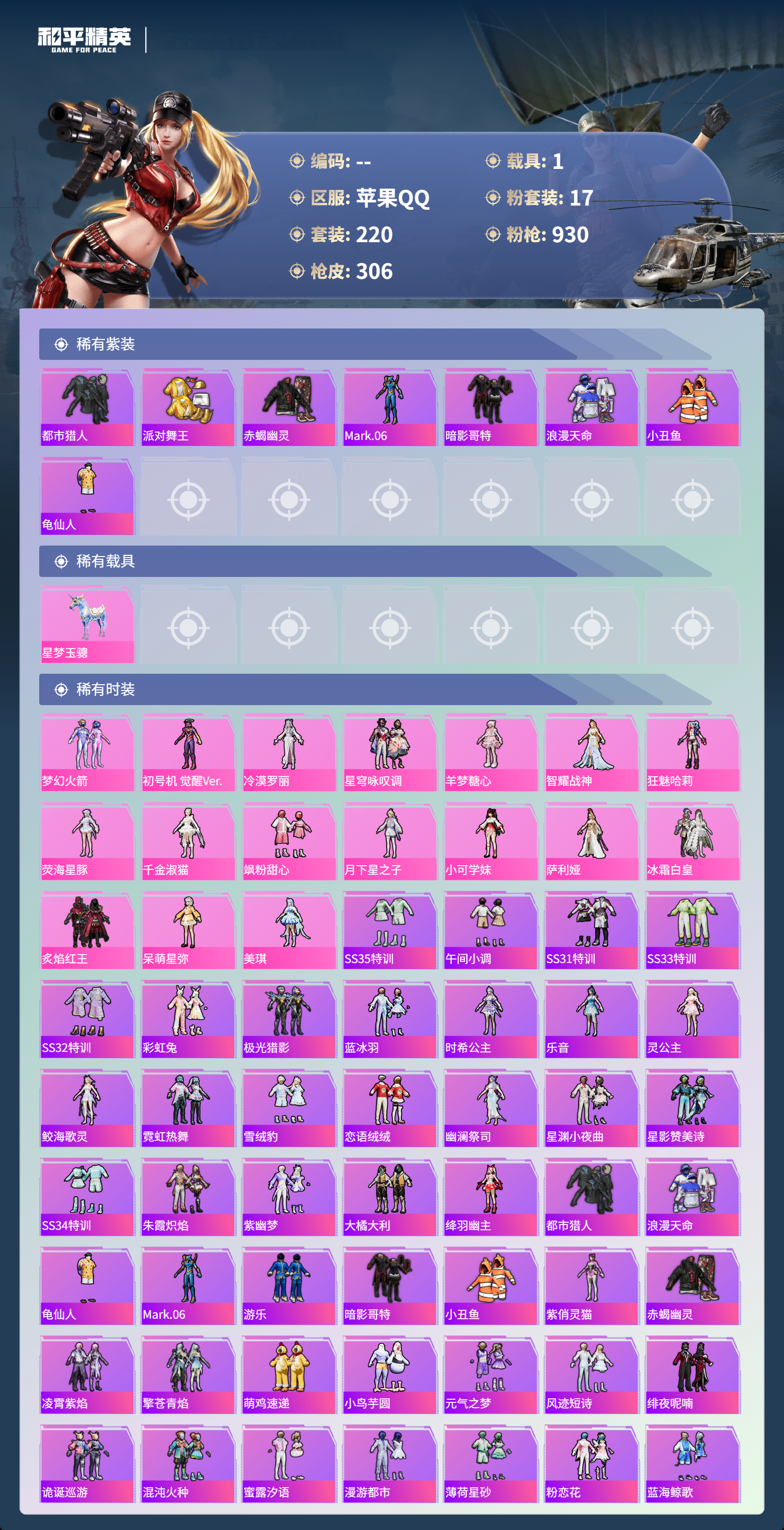 【95779】【不可二次】【苹果QQ】龟仙人 漫步者 都市猎人 炙焰红王 极速红龙 赤蝎幽灵 瑞龙福将 浪漫天命 AWM-黄金龙骨 镜光幻境飞行翼 团圆交子 SCAR-L-梦幻火箭 星梦玉骢 M762-瑞龙福将 齐天大圣飞行器 SCAR-L梦幻火箭 龙翔九天飞行器 黄族统领飞行器 M416-风花雪月 梦幻火箭 AKM-缤纷海域 派对舞王 暗影哥特 冰霜白皇 星之信仰飞行翼