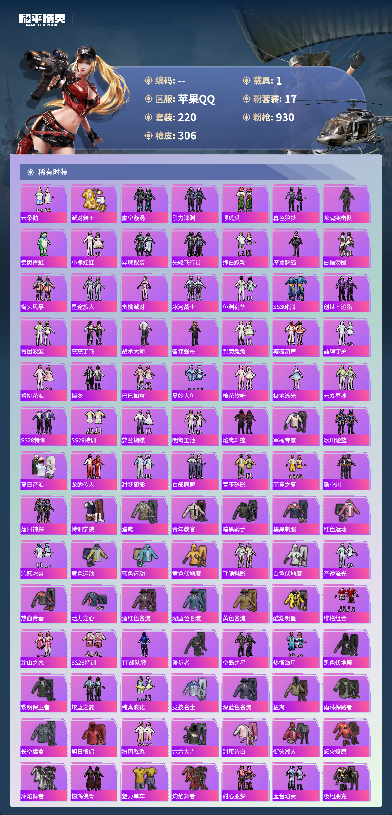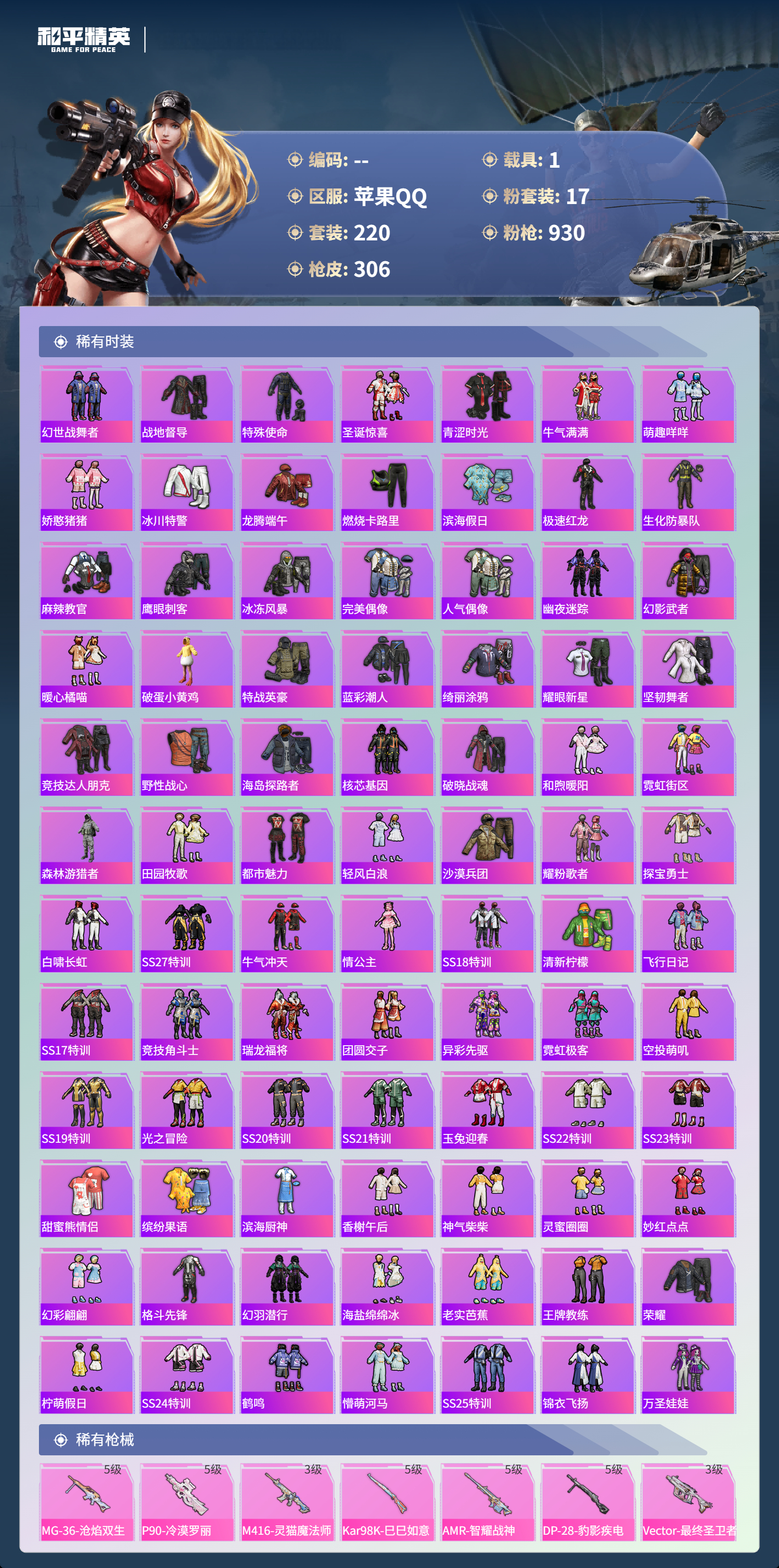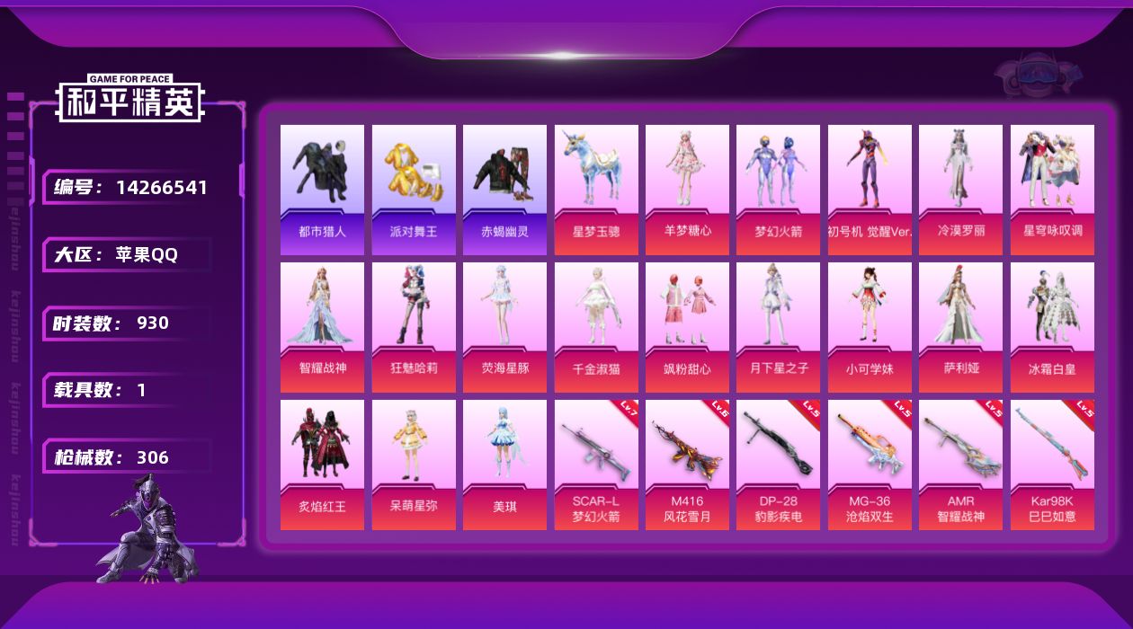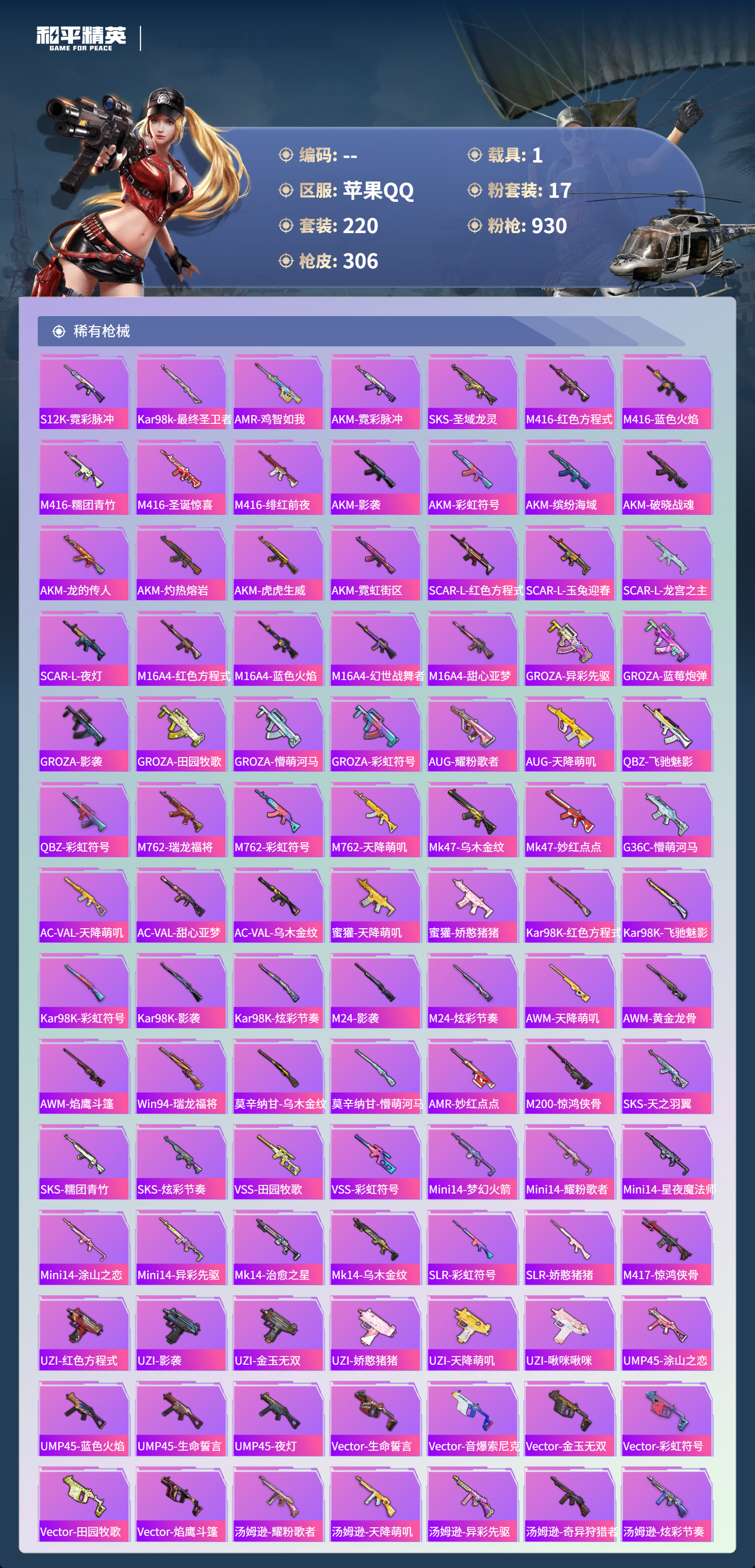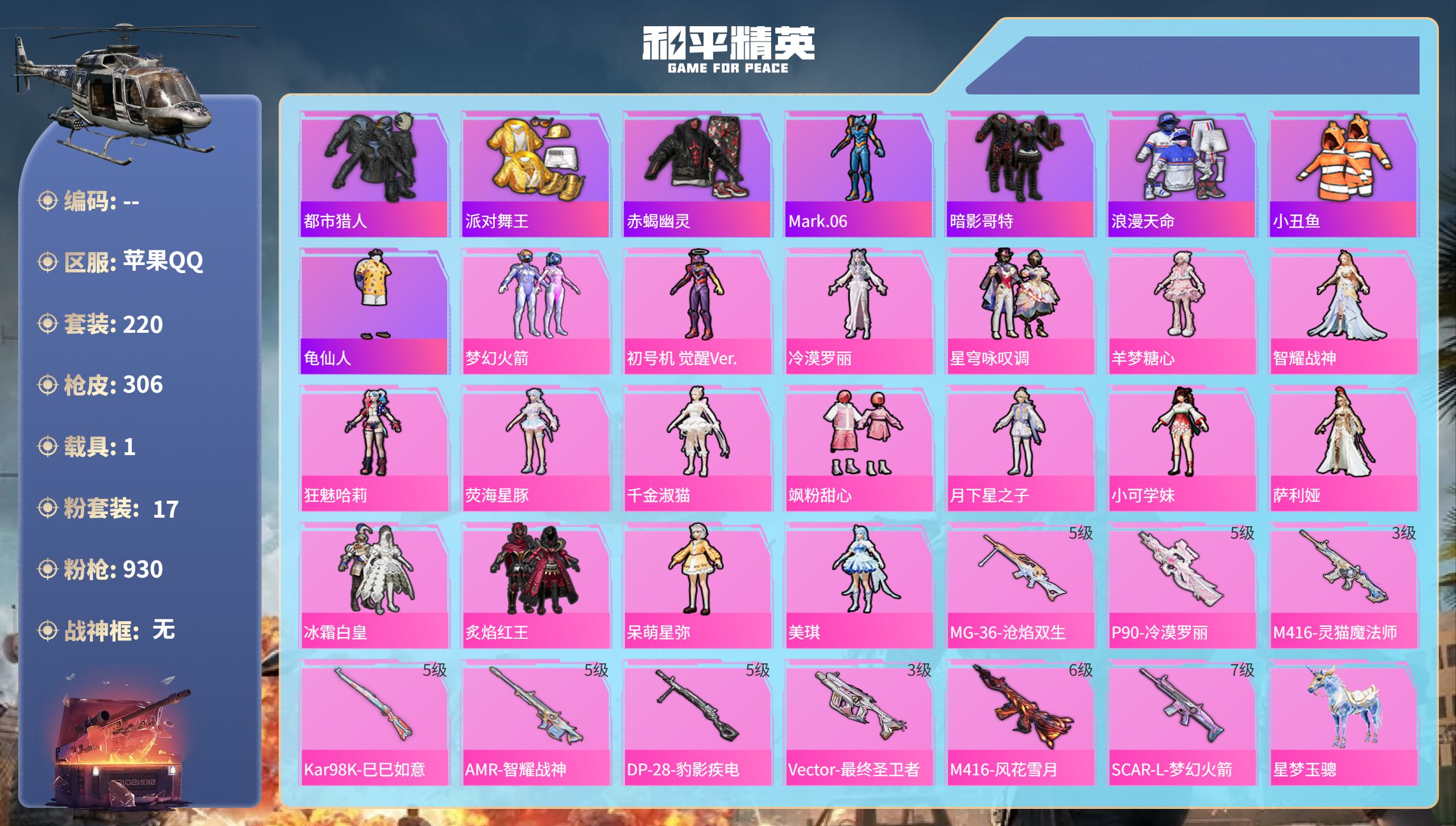 【95779】【不可二次】【苹果QQ】龟仙人 漫步者 都市猎人 炙焰红王 极速红龙 赤蝎幽灵 瑞龙福将 浪漫天命 AWM-黄金龙骨 镜光幻境飞行翼 团圆交子 SCAR-L-梦幻火箭 星梦玉骢 M762-瑞龙福将 齐天大圣飞行器 SCAR-L梦幻火箭 龙翔九天飞行器 黄族统领飞行器 M416-风花雪月 梦幻火箭 AKM-缤纷海域 派对舞王 暗影哥特 冰霜白皇 星之信仰飞行翼