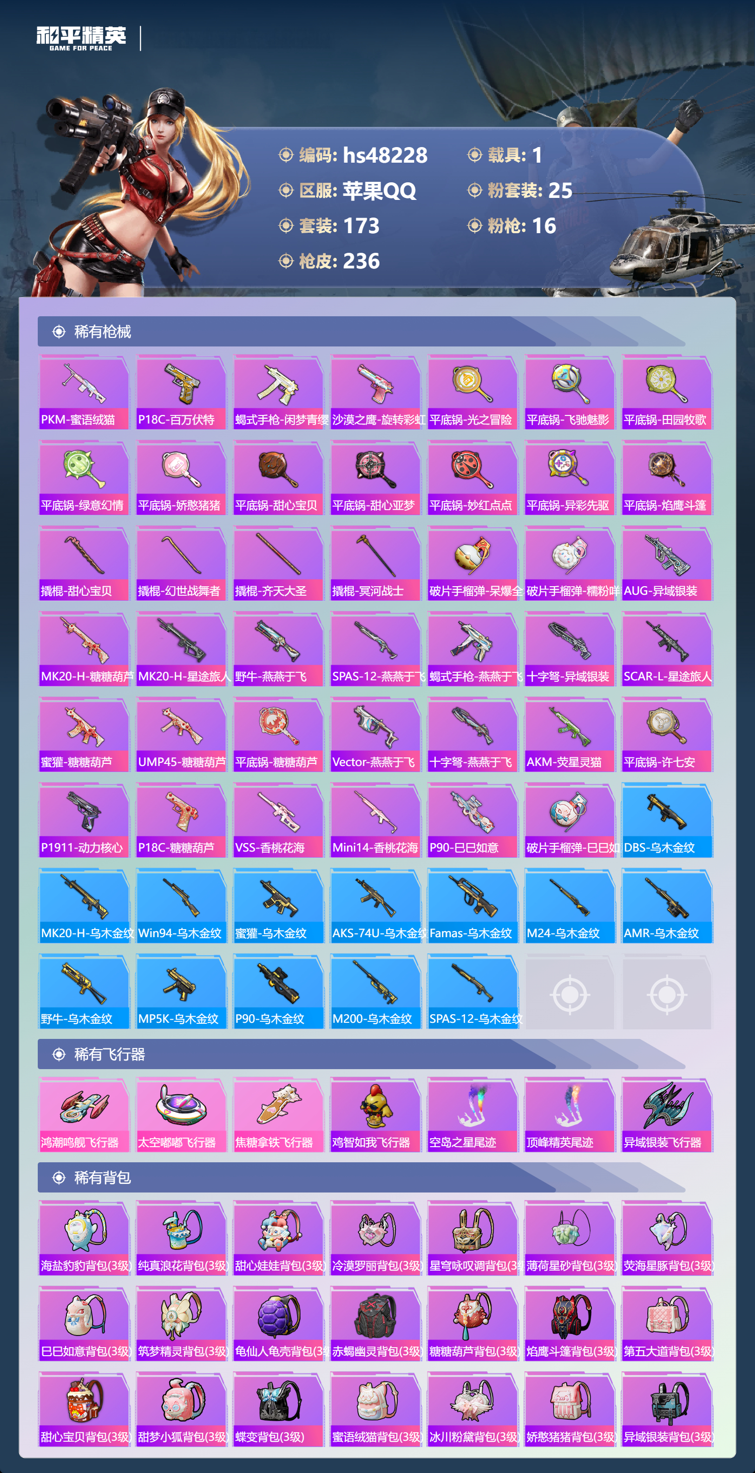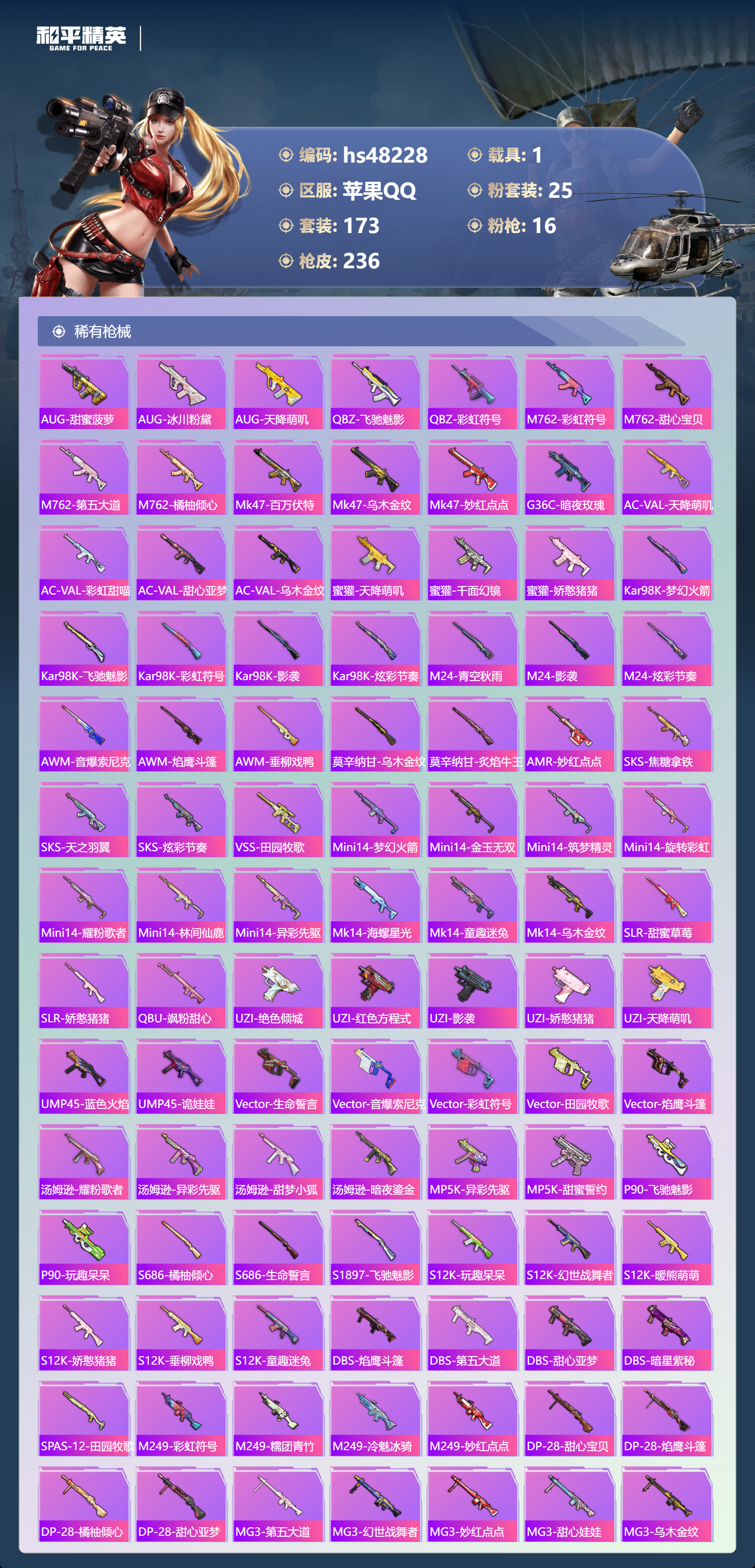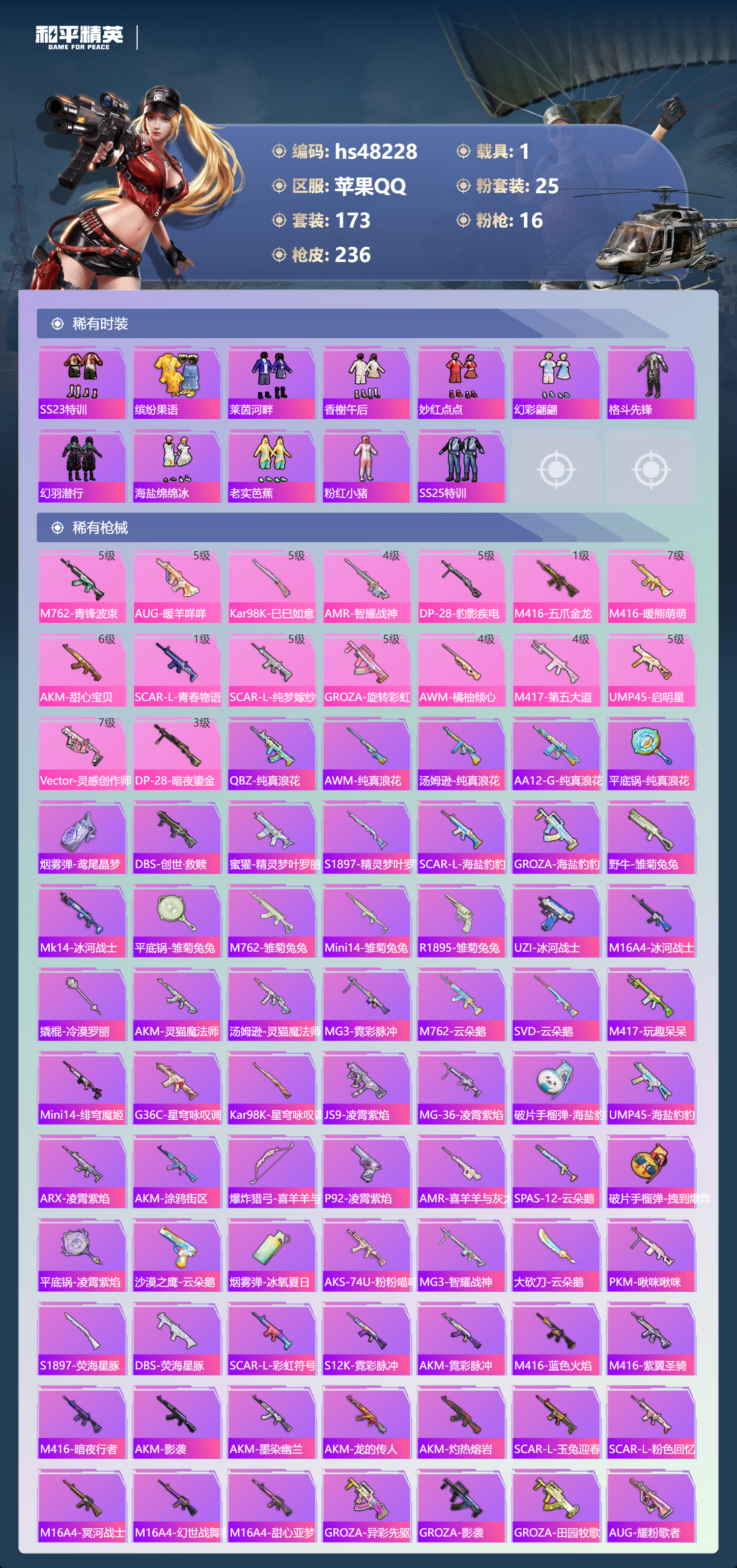 【95842】【不可二次】【苹果QQ】龟仙人 水银刺客 漫步者 都市猎人 Mini14-林间仙鹿 海盐物语 M416-暖熊萌萌 缤纷油彩 山涧鹿灵 童趣迷兔 蝶舞迷情 GROZA-旋转彩虹 AKM-甜心宝贝 纯白誓言 潮萌小黄鸭 M417射手步枪 草莓生巧 M417-第五大道 木乃伊 M762-青锋波束 M416-五爪金龙 UMP45-启明星 炙焰红王 AWM-橘柚倾心 焦糖拿铁飞行器 赤蝎幽灵