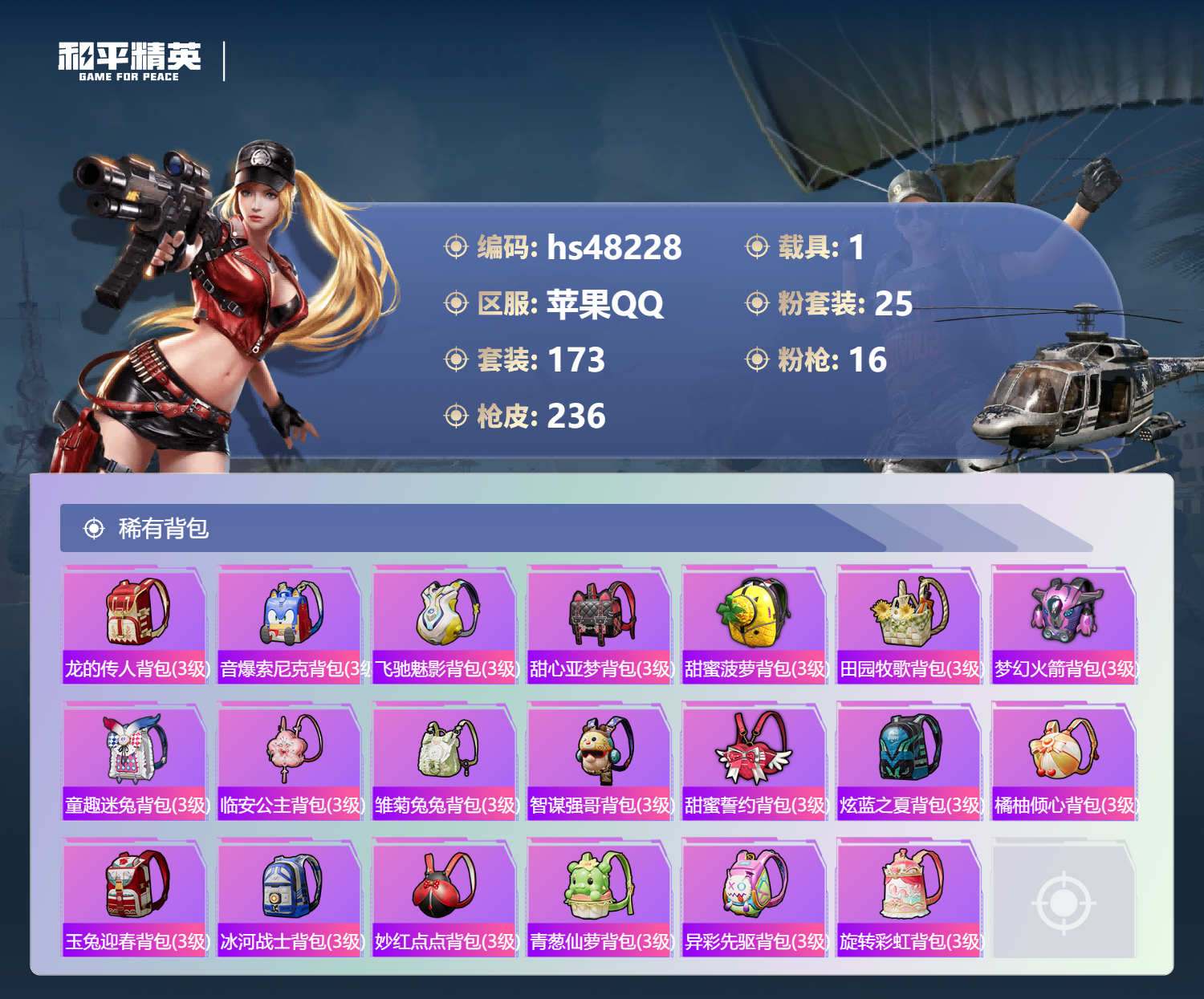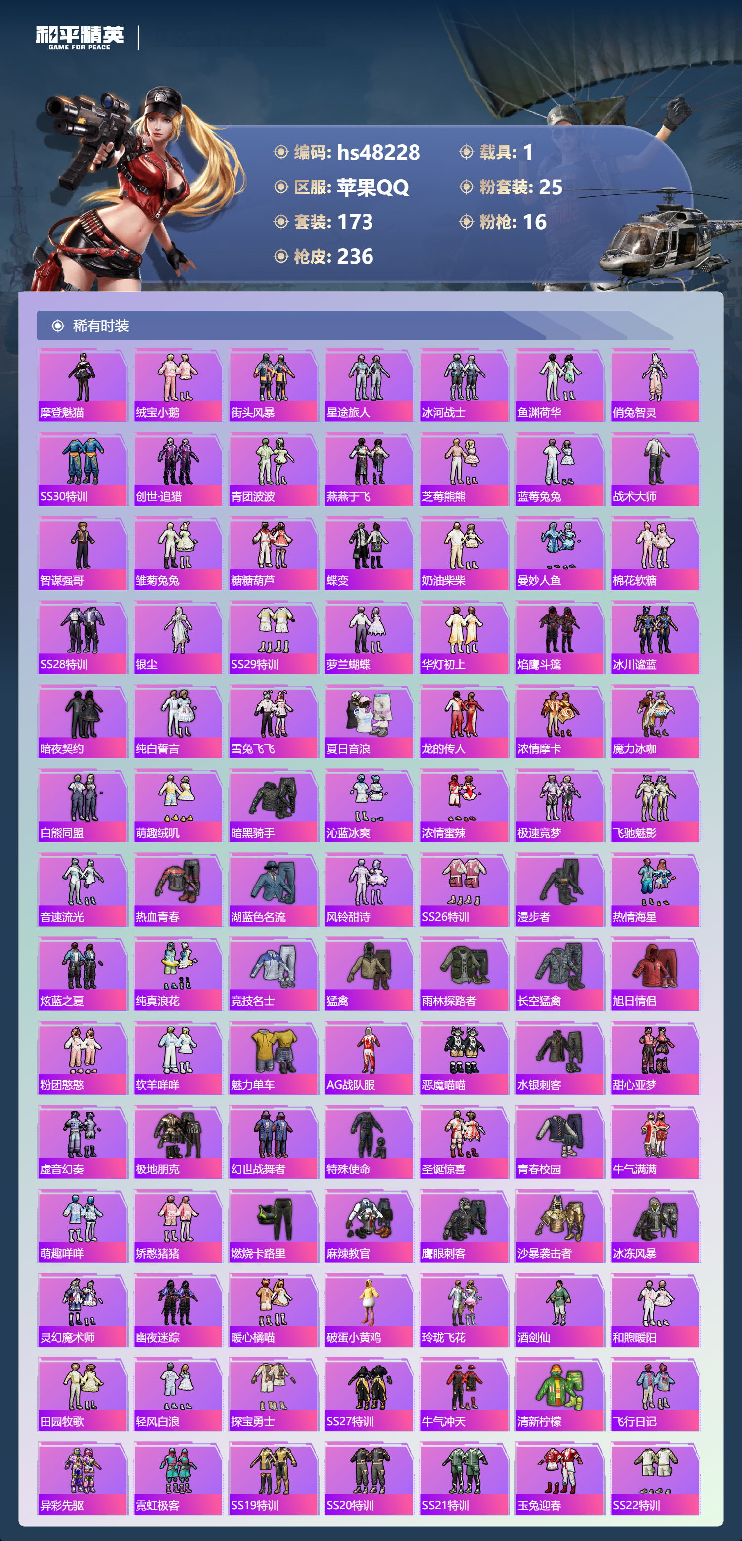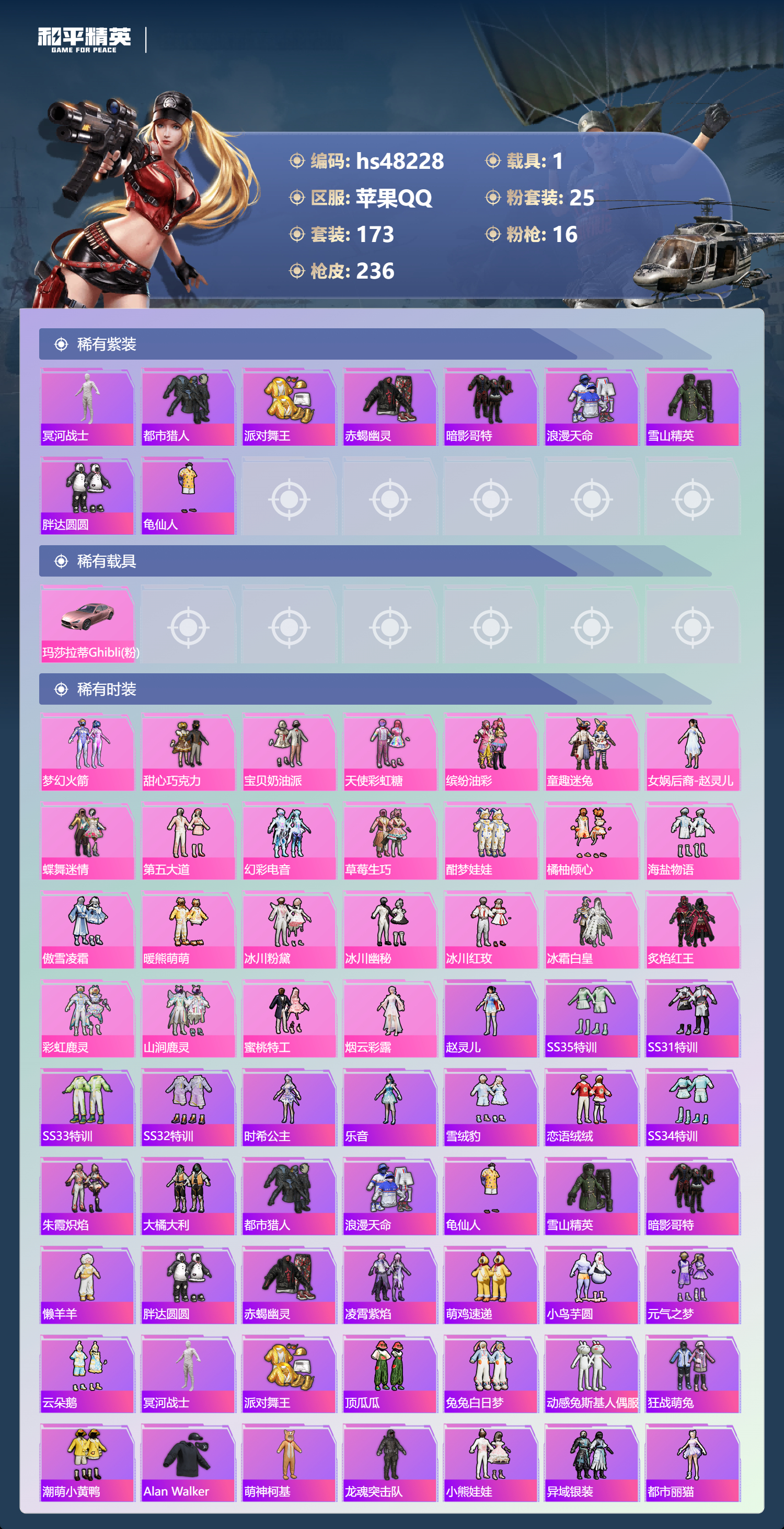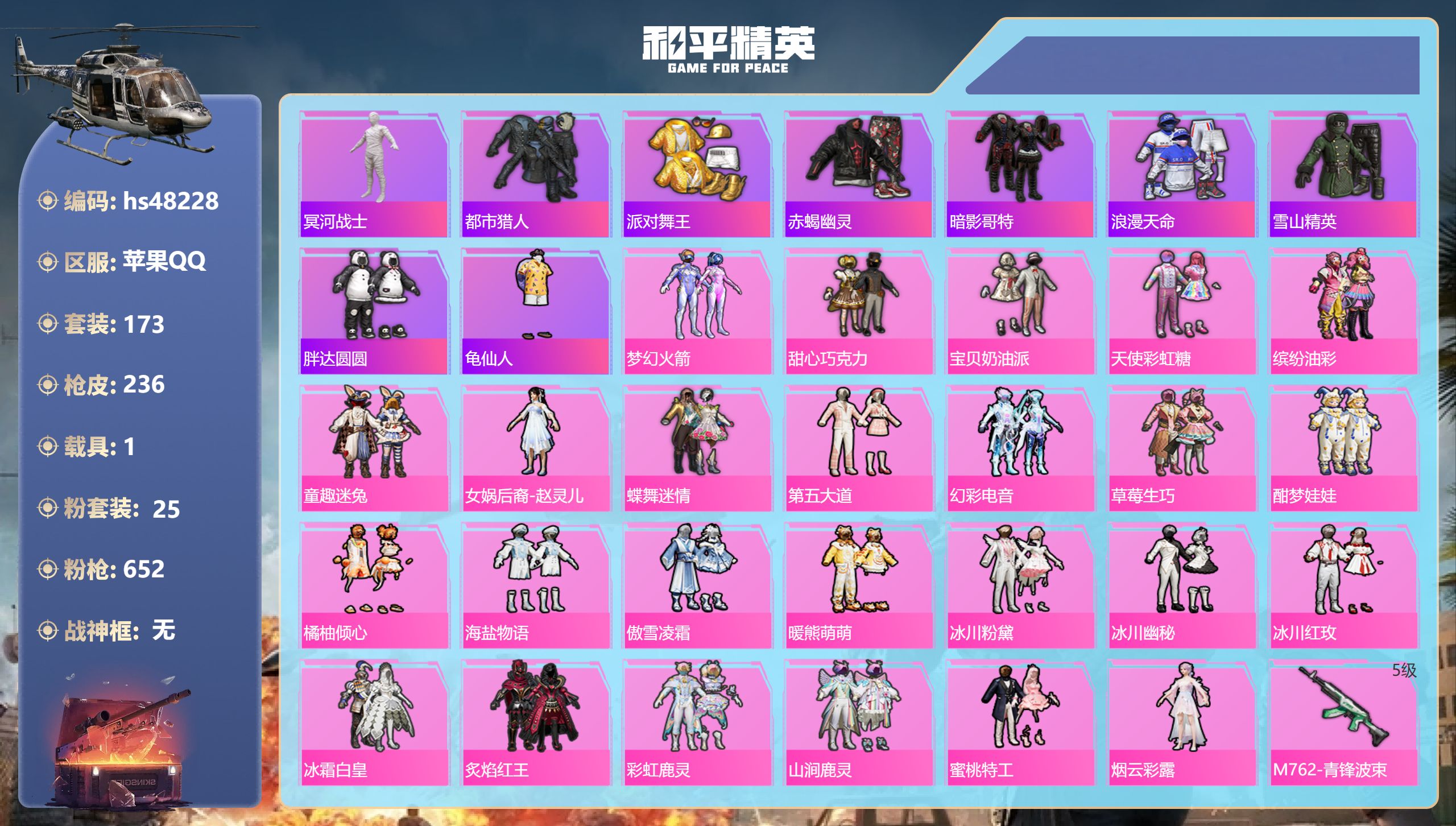 【95842】【不可二次】【苹果QQ】龟仙人 水银刺客 漫步者 都市猎人 Mini14-林间仙鹿 海盐物语 M416-暖熊萌萌 缤纷油彩 山涧鹿灵 童趣迷兔 蝶舞迷情 GROZA-旋转彩虹 AKM-甜心宝贝 纯白誓言 潮萌小黄鸭 M417射手步枪 草莓生巧 M417-第五大道 木乃伊 M762-青锋波束 M416-五爪金龙 UMP45-启明星 炙焰红王 AWM-橘柚倾心 焦糖拿铁飞行器 赤蝎幽灵