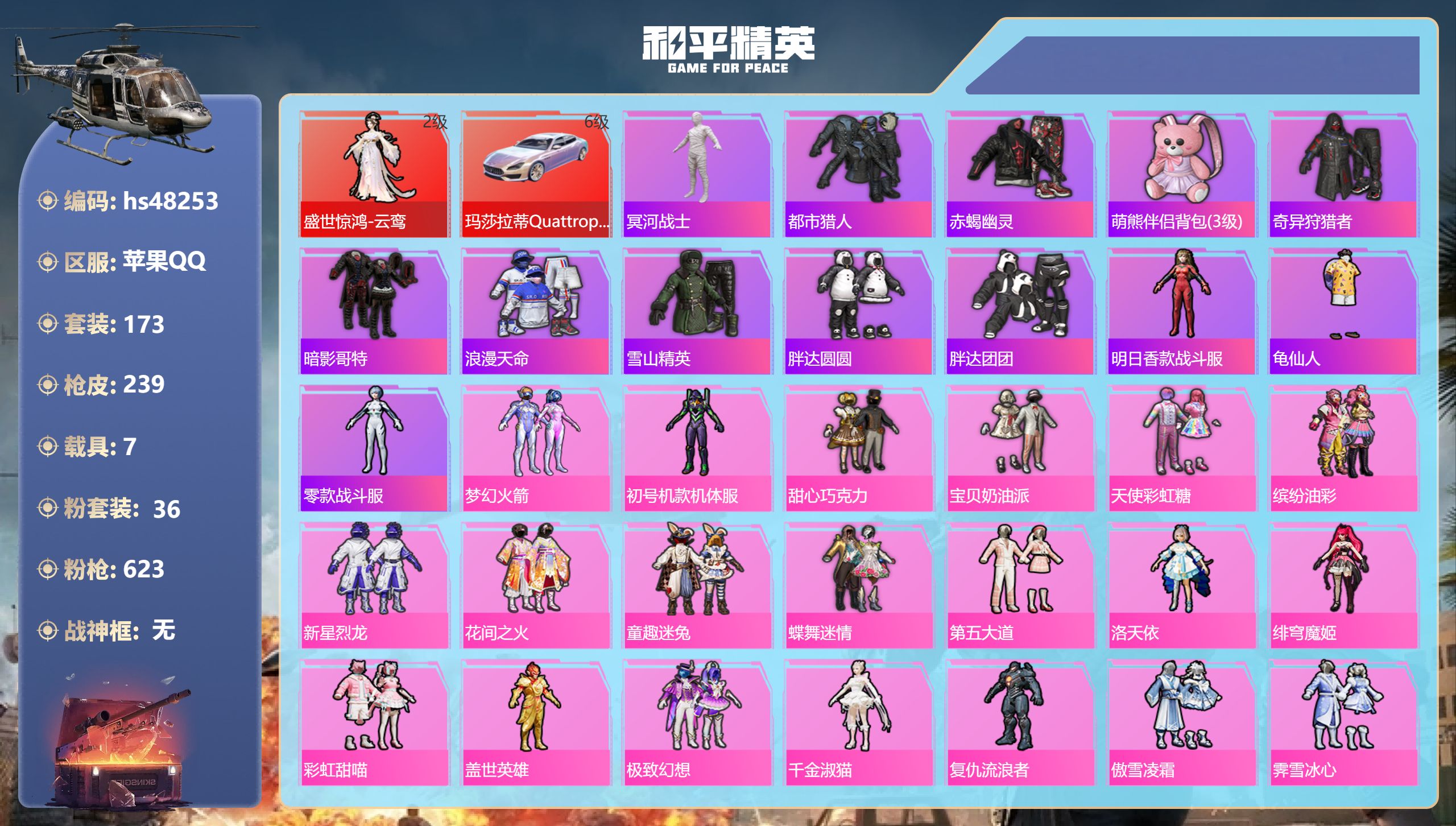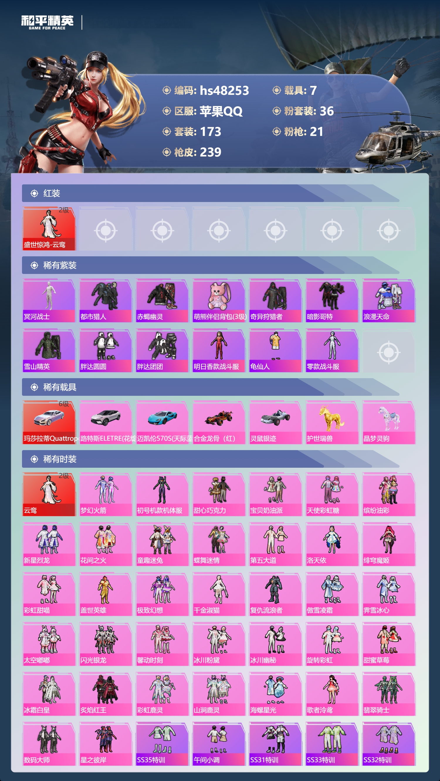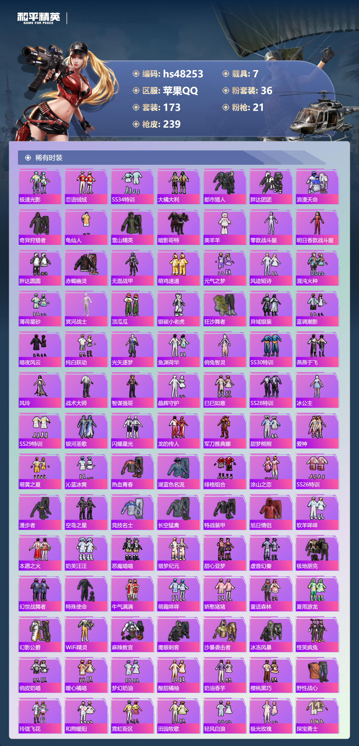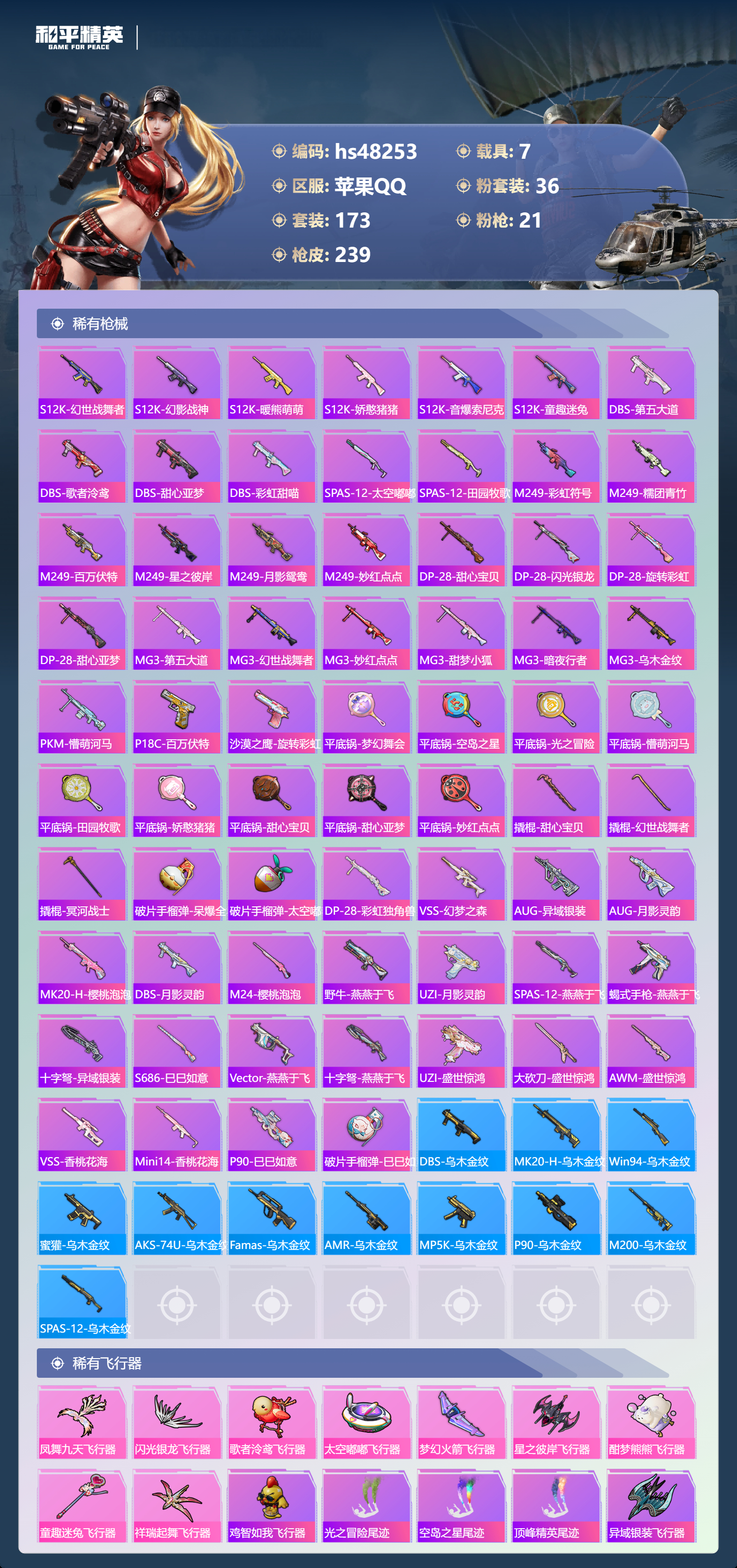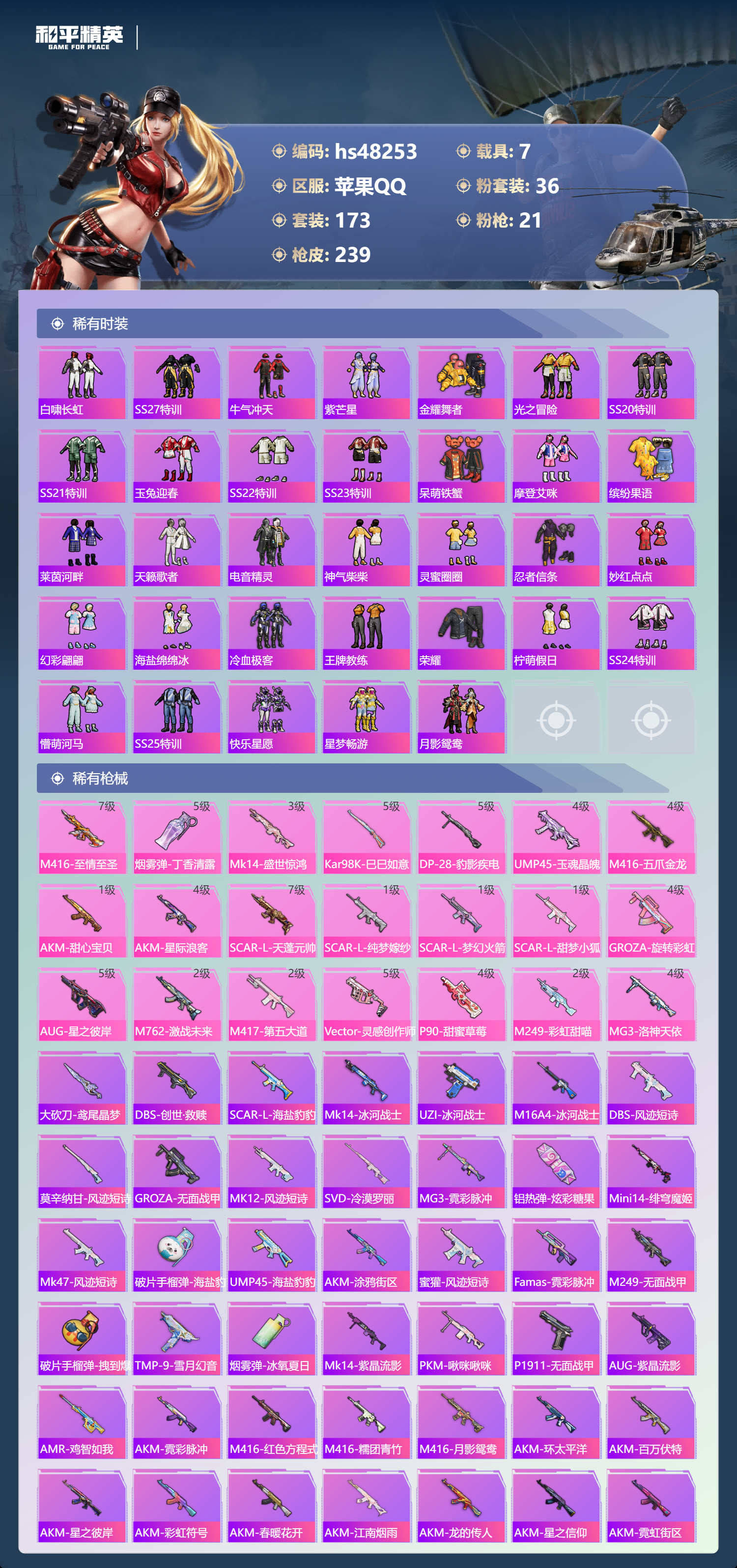 【95844】【不可二次】【苹果QQ】龟仙人 AKM-星际浪客 漫步者 花间之火 都市猎人 SCAR-L-甜梦小狐 忍者信条 Mini14-林间仙鹿 M416-至情至圣 盛世惊鸿-云鸾 M249-彩虹甜喵 MK47-林间仙鹿 GROZA-林间仙鹿 缤纷油彩 山涧鹿灵 馨动时刻 童趣迷兔 蝶舞迷情 GROZA-旋转彩虹 AUG-星之彼岸 AKM-甜心宝贝 SCAR-L-梦幻火箭 合金龙骨红色 极致