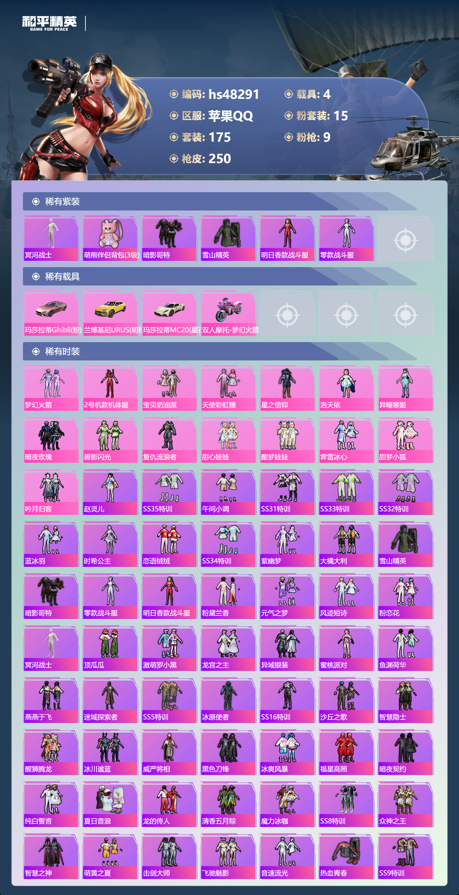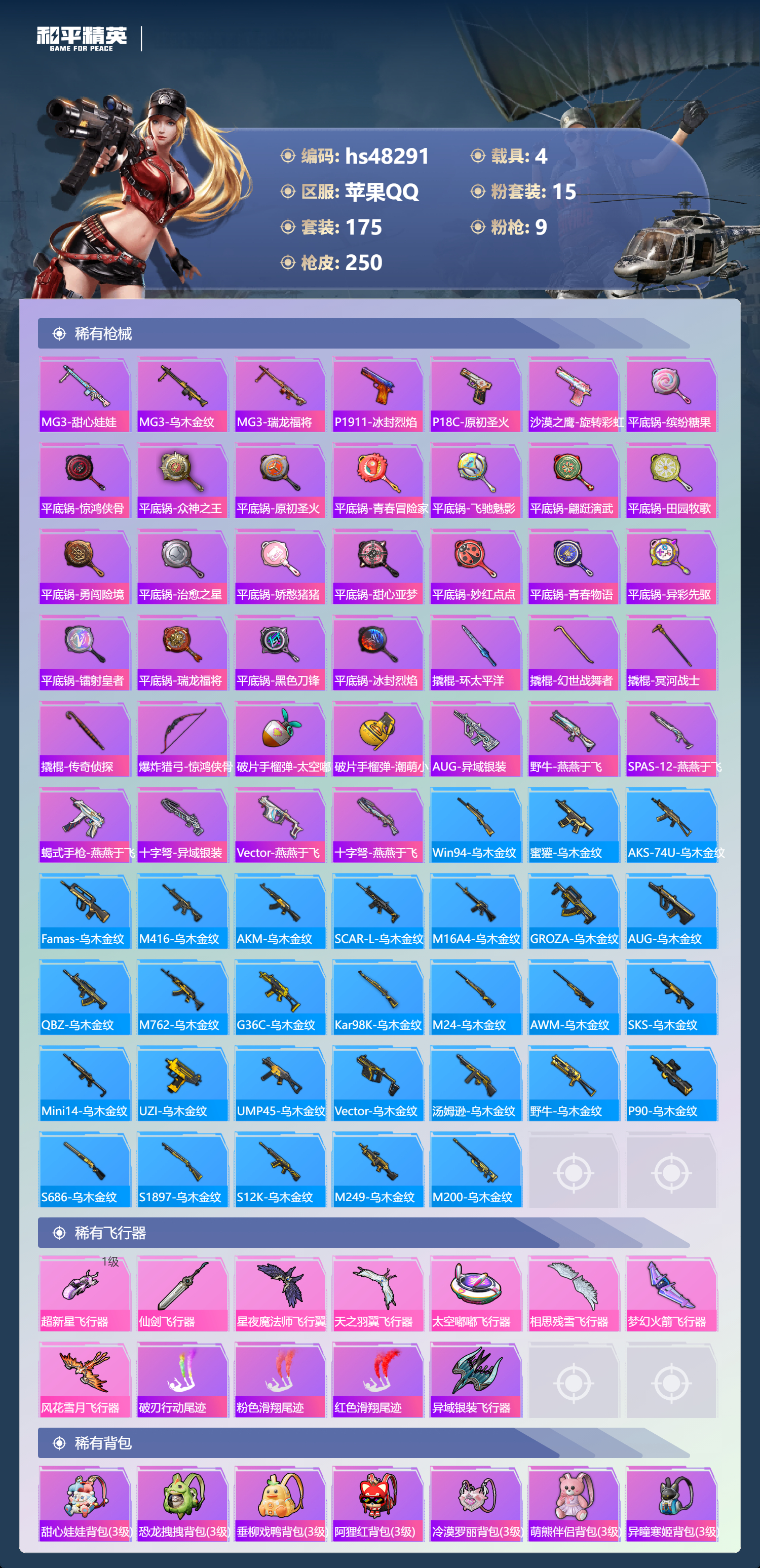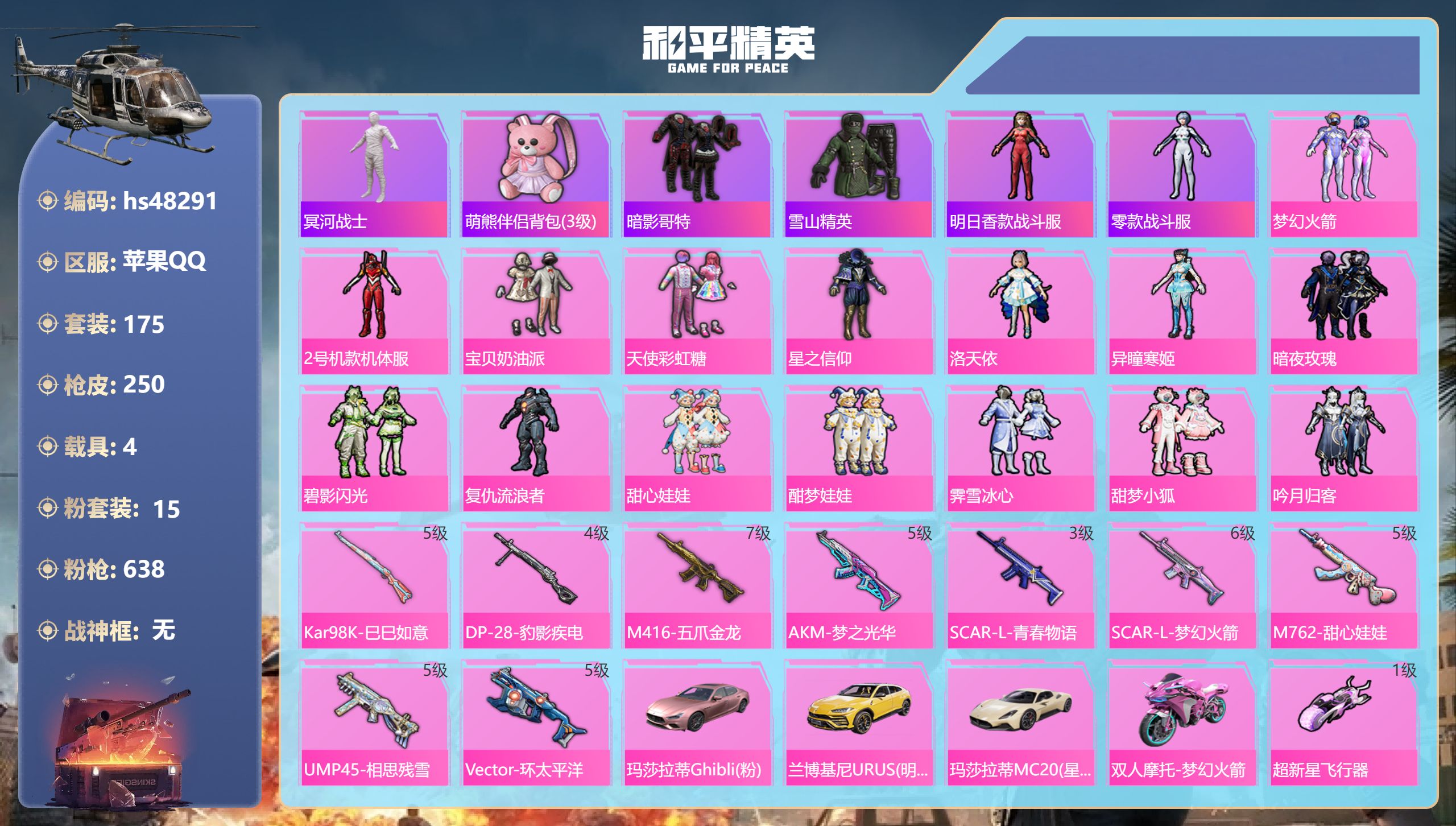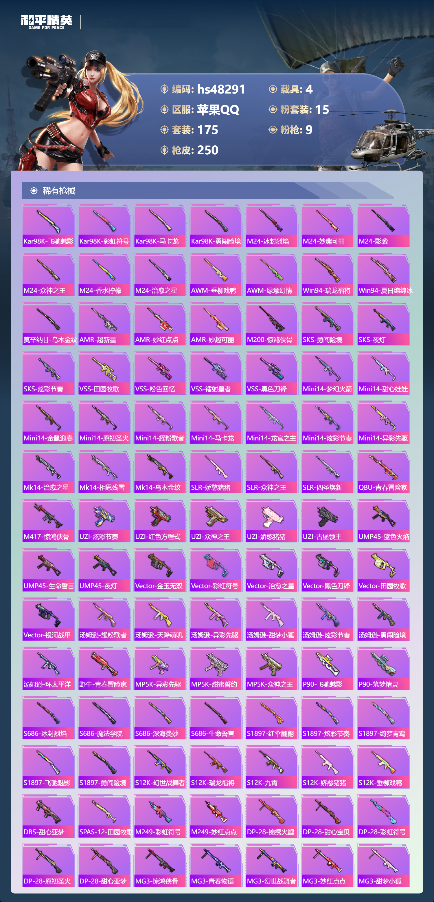 【95850】【不可二次】【苹果QQ】双人摩托梦幻火箭 木乃伊 M416-五爪金龙 漫步者 迪迦奥特曼 洛天依 极速红龙 风花雪月飞行器 吟月归客 太空嘟嘟飞行器 碧影闪光 M24-香水柠檬 瑞龙福将 醒狮腾龙 梦幻火箭飞行器 梦之呓语 激萌罗小黑 纯白誓言 团圆交子 星之信仰 SCAR-L-梦幻火箭 相思残雪飞行器 暗夜契约 M762-瑞龙福将 SCAR-L梦幻火箭 甜心娃娃 酣梦娃娃 黑色刀